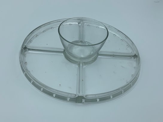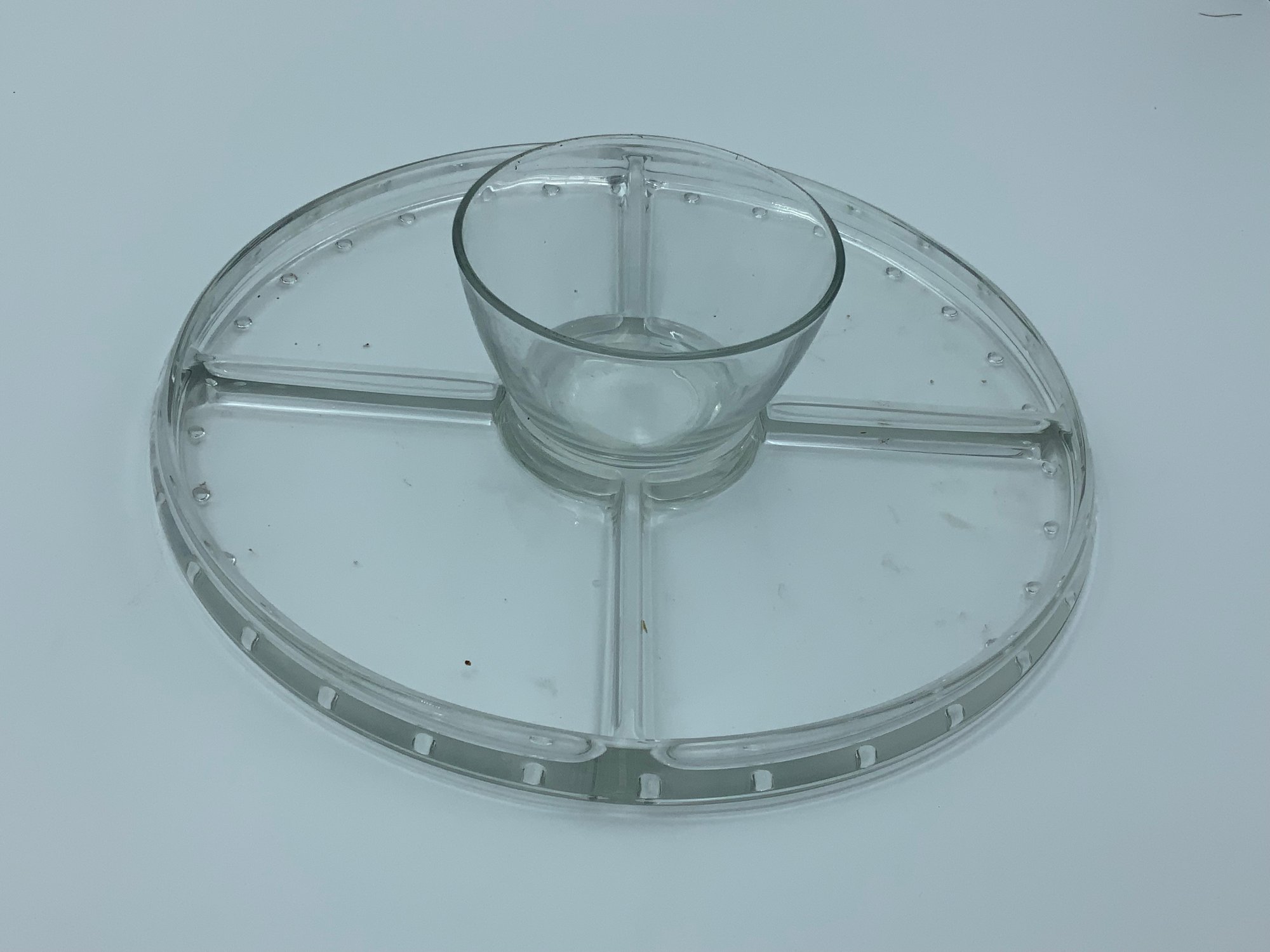 This is a versatile piece - in one orientation it is a chip and dip plate with center bowl or reversed it is a cake stand or display stand. In either orientation it in in great shape, we found no chips or cracks, just needs some cleaning and this is ready to go!