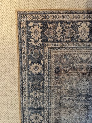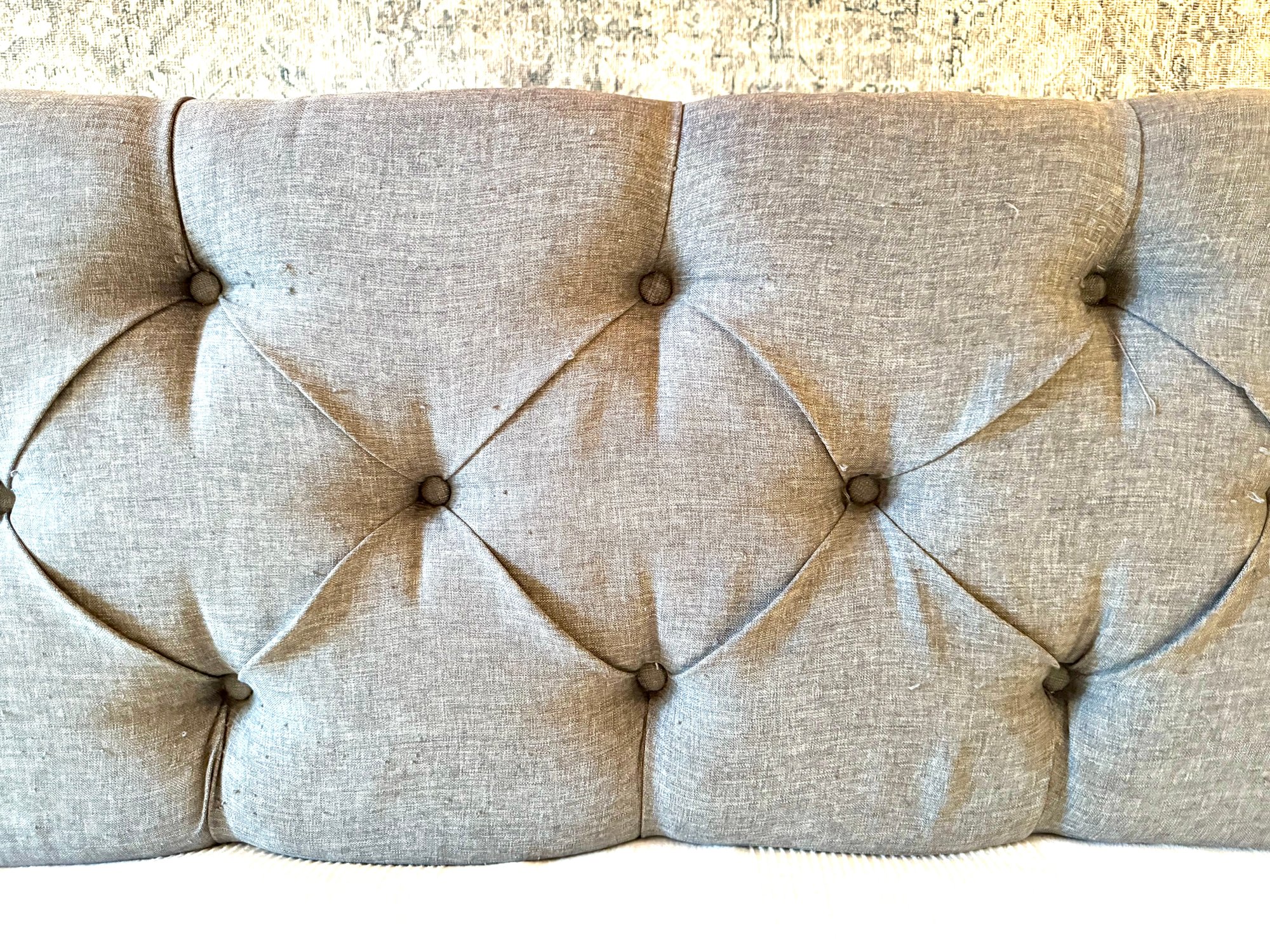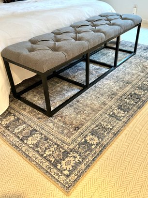 Lightweight contemporary tufted bench and flat weave carpet in subtle grey and beige tones. Condition is good with lite use. Bench Size L 60.5 X D 18 X H 18
