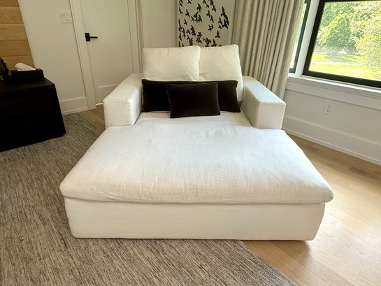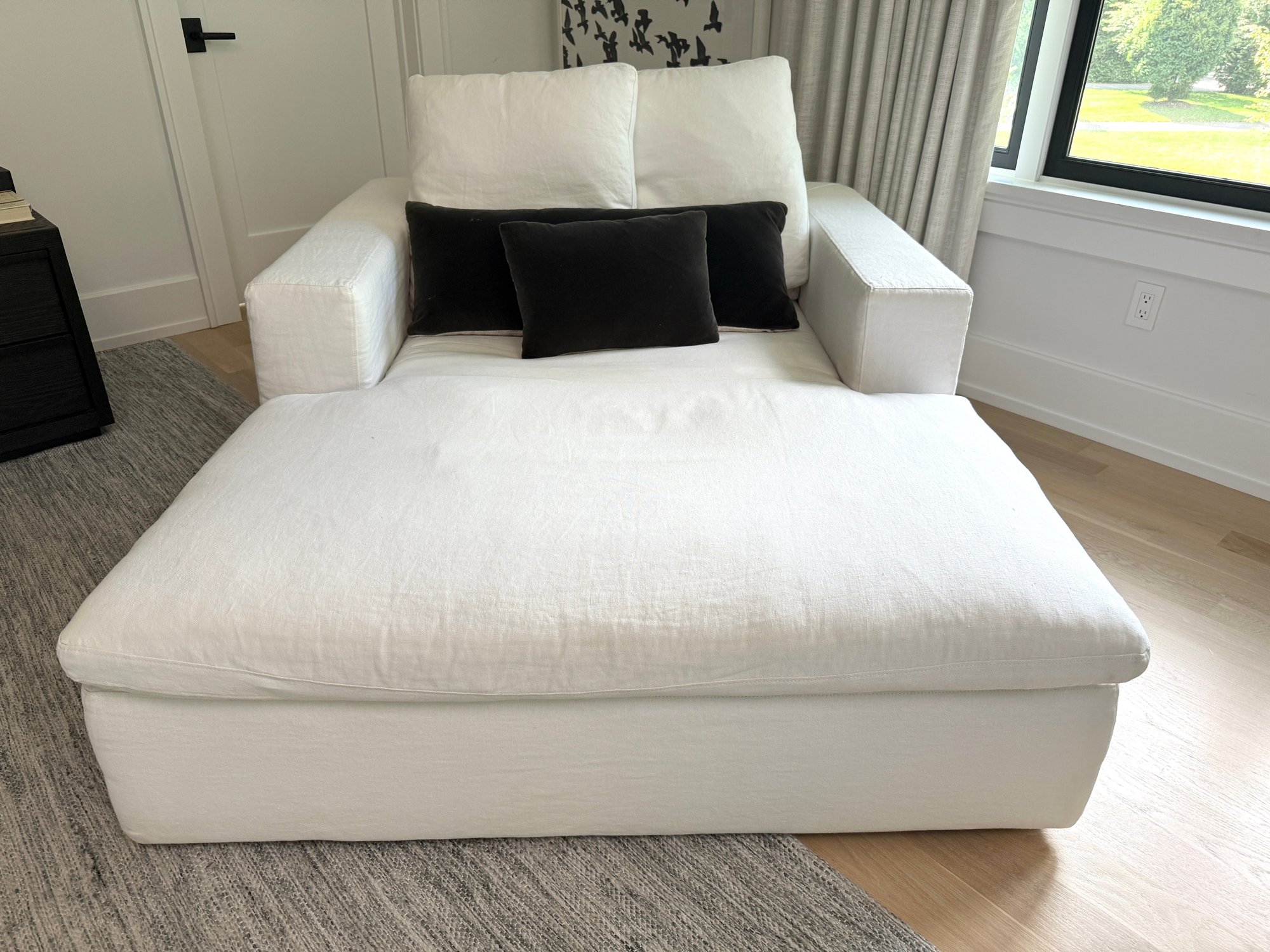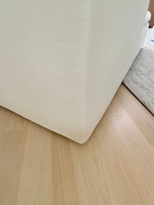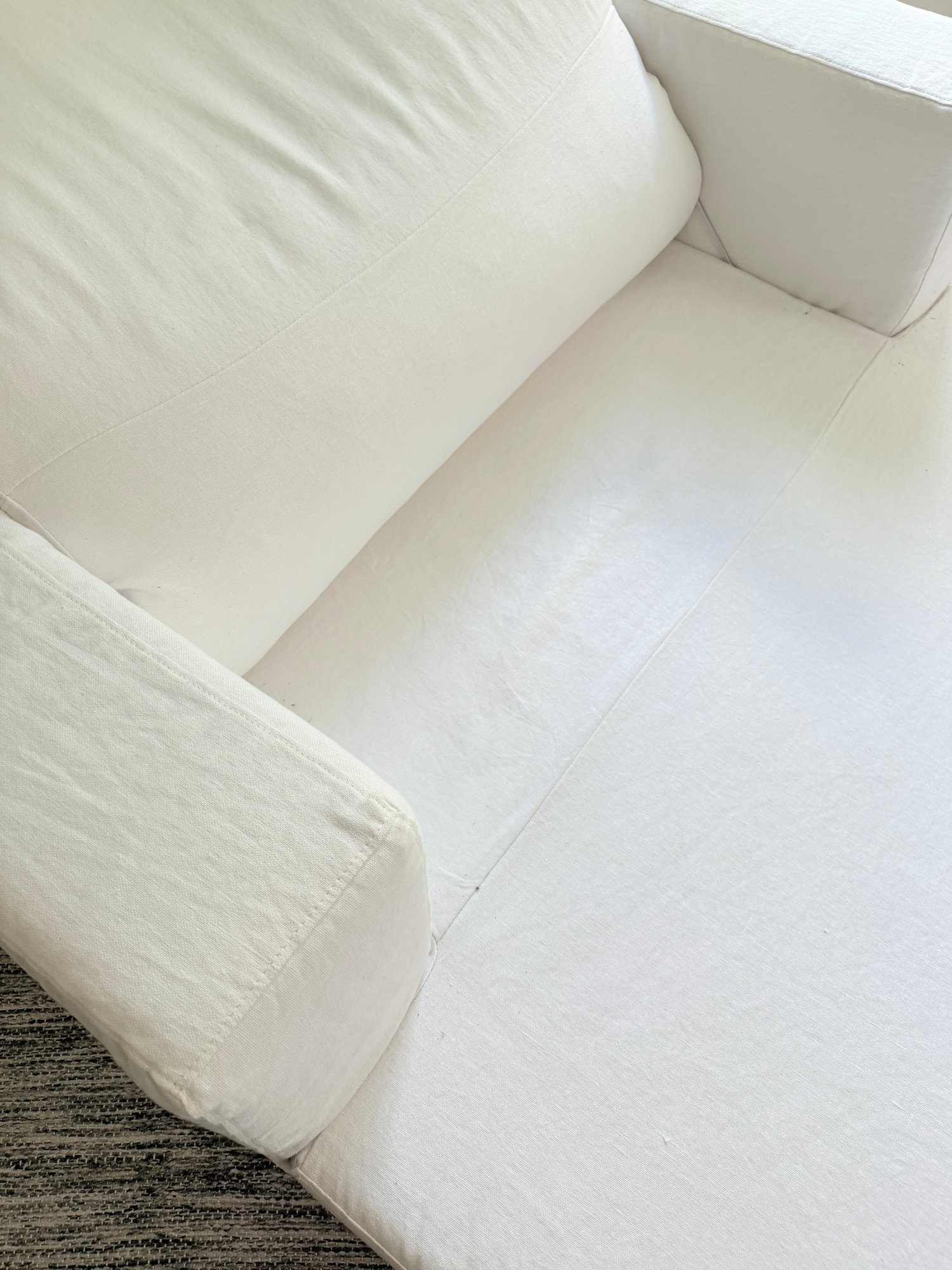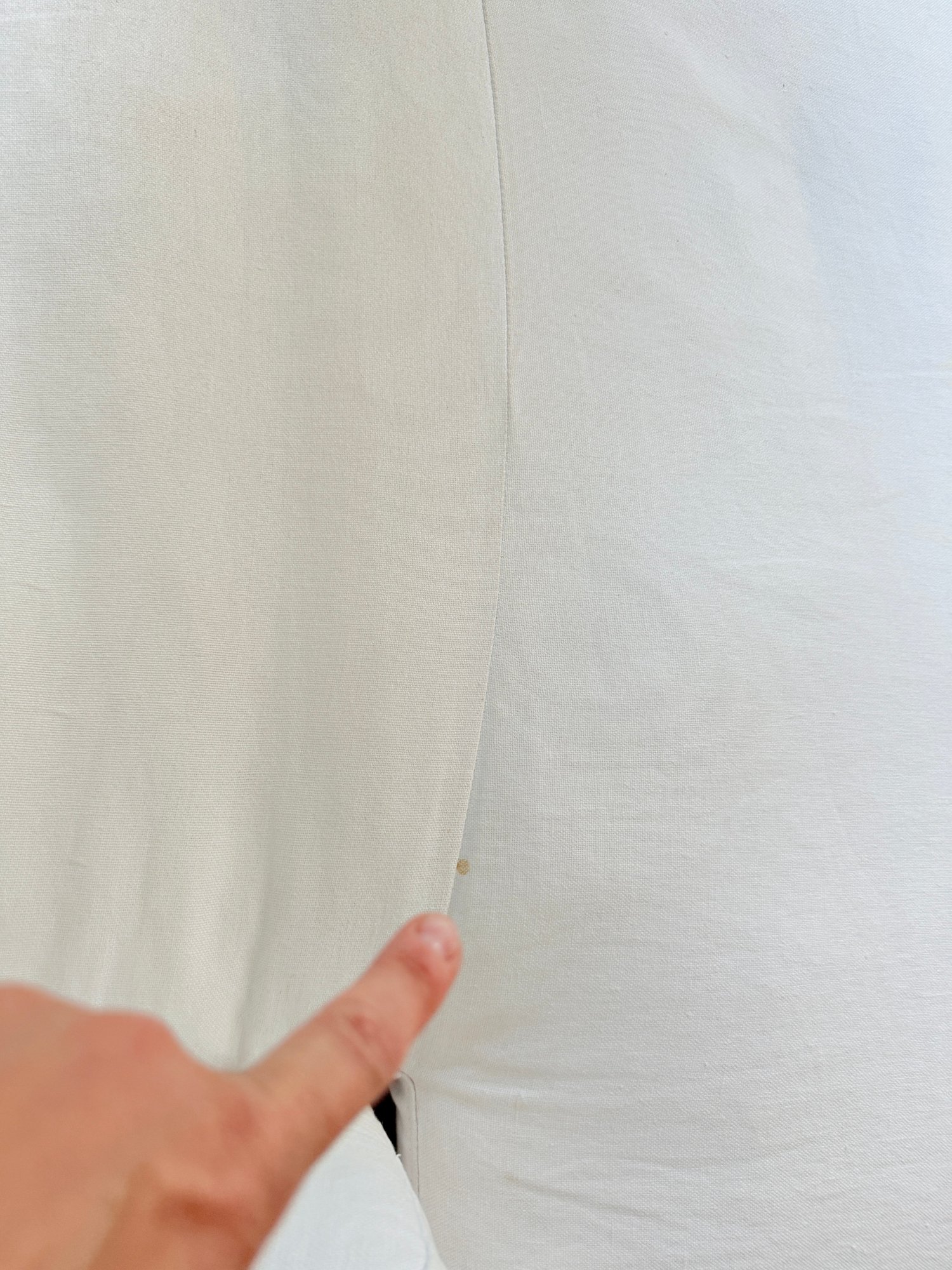 White linen. One small spot on seat, some dirt on lower back corner (see photo); overall presents very well