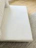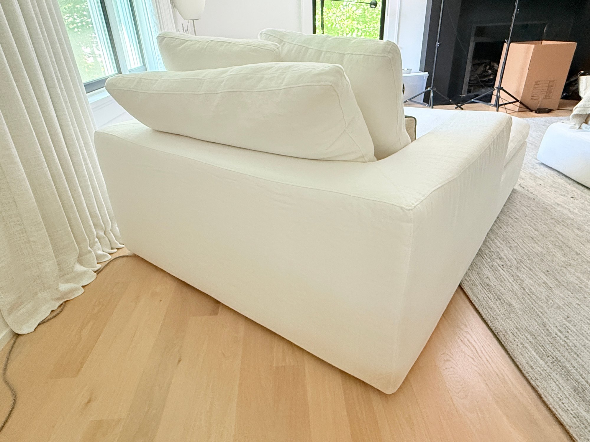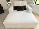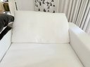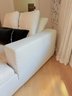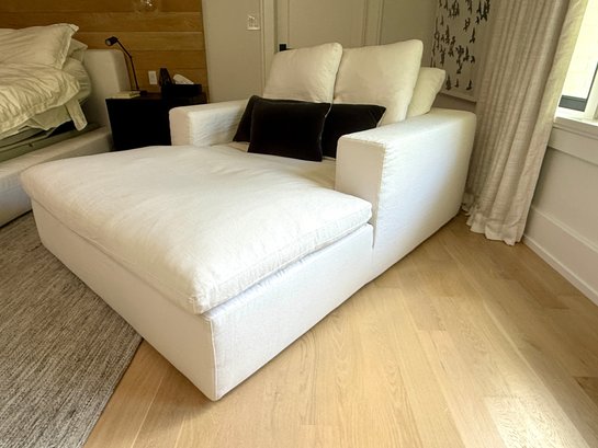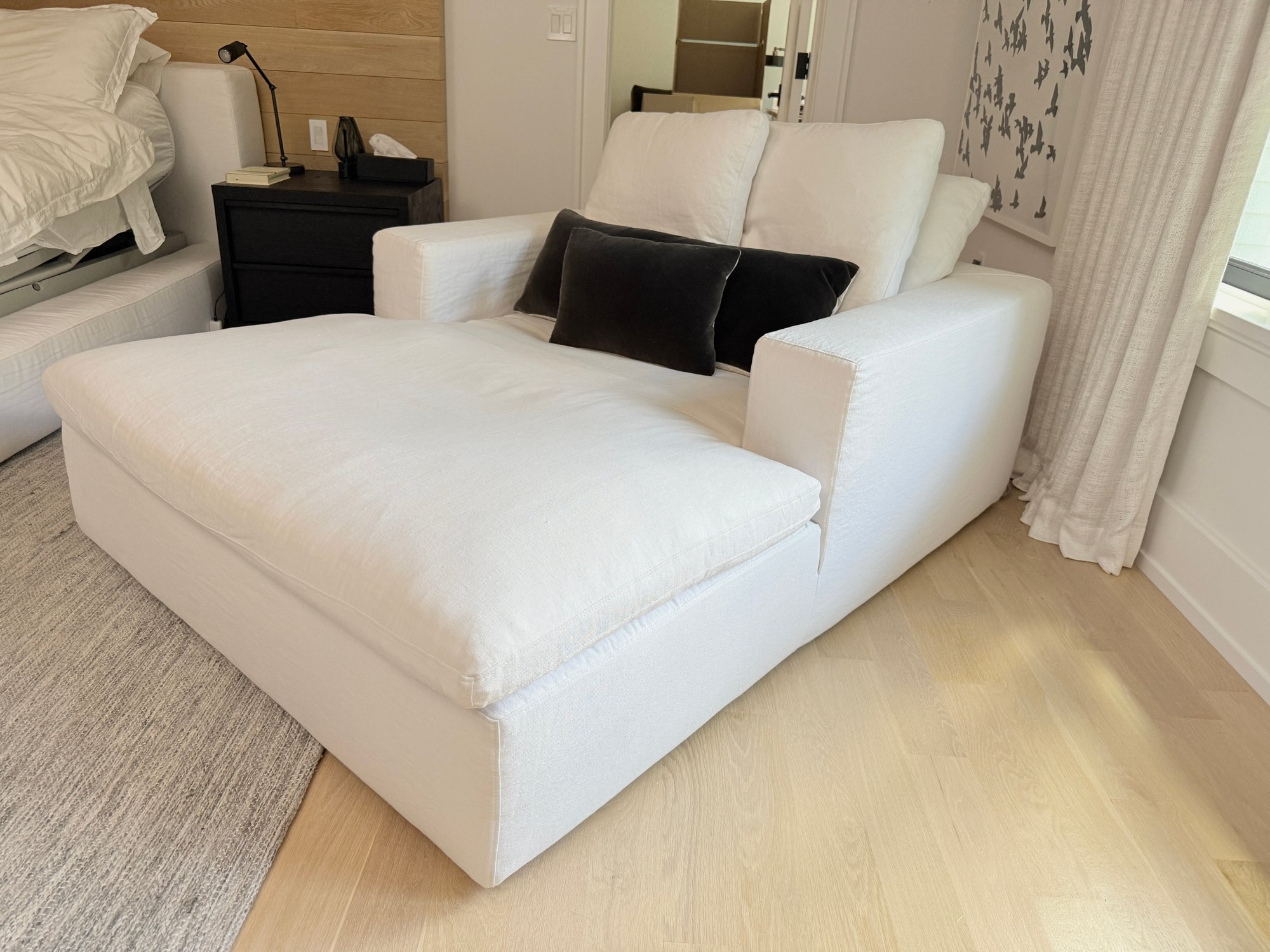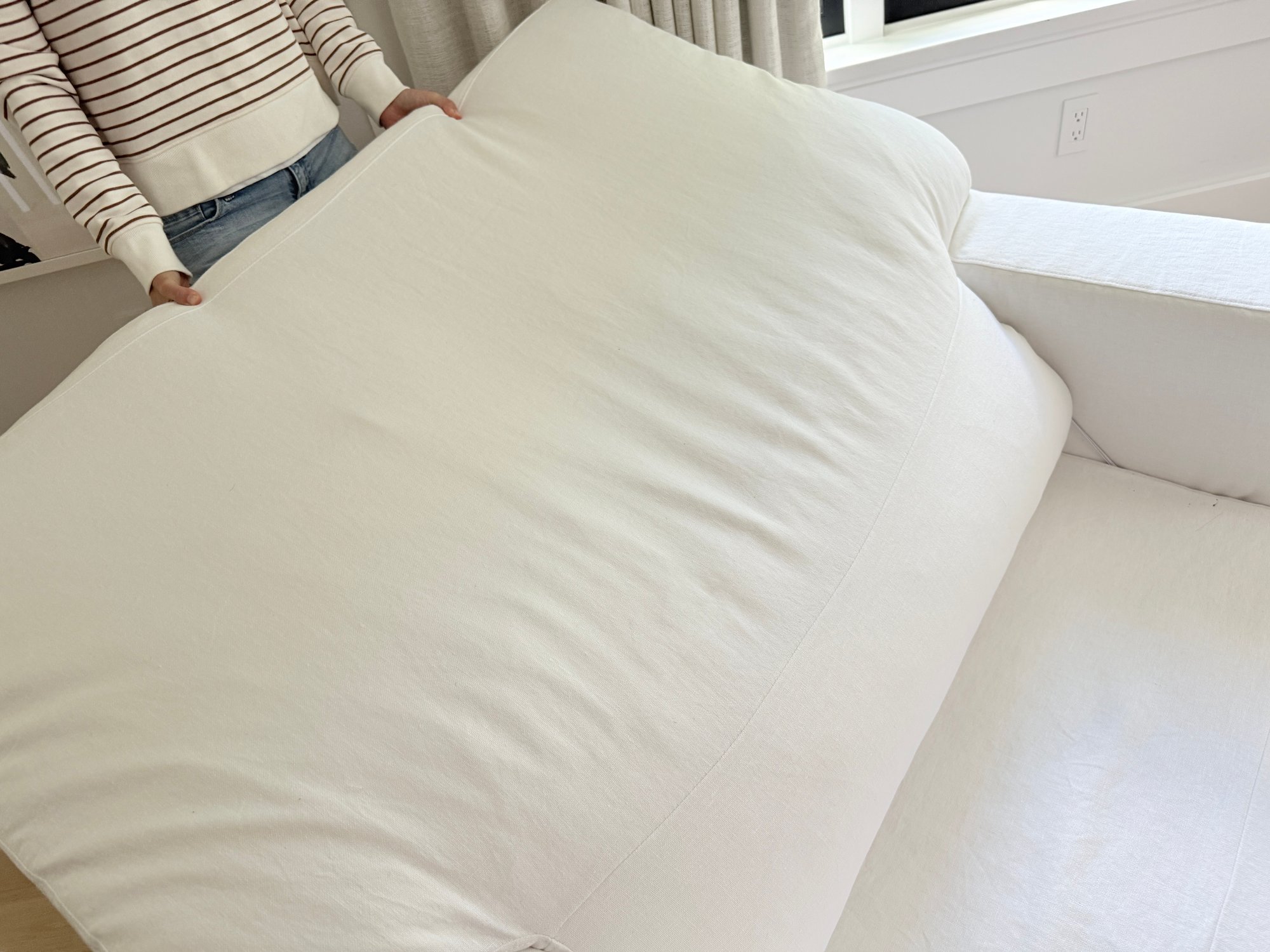 White linen. One small spot on seat, some dirt on lower back corner (see photo); overall presents very well