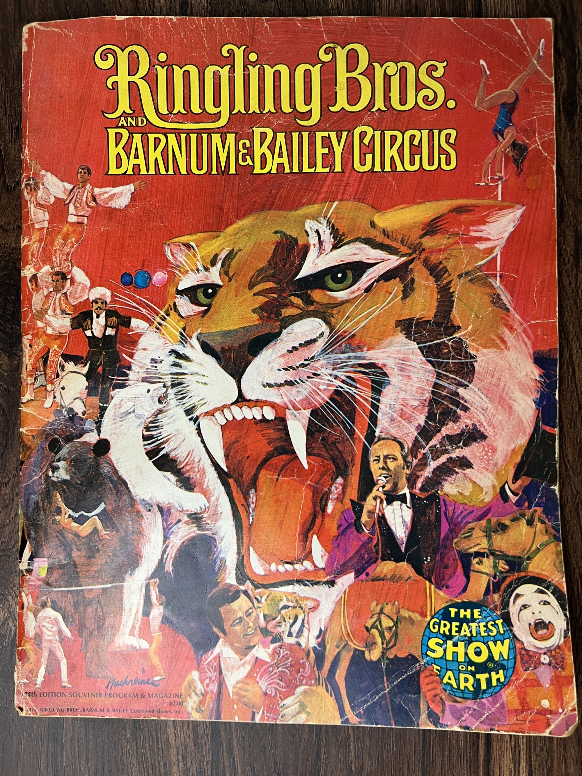 Vintage 1974 souvenir program and magazine commemorating the Ringling Brothers and Barnum & Bailey Circus. Wonderful piece of circus history ephemera.
