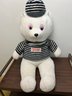 Another retro fair prize, an oversize white teddy bear wearing a prisoner's striped uniform marked "Prisoner of Love" on the front and "0736" on the back.