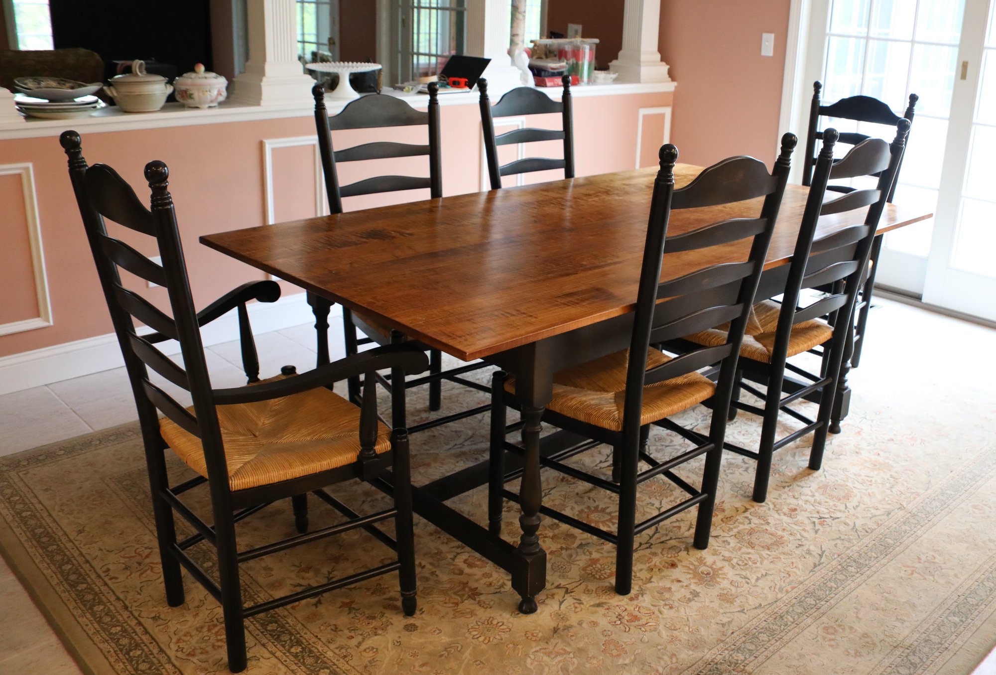 Set of 6 black ladder backs chairs with rush seats, (2 captain's chairs & 4 side chairs) solid wood table