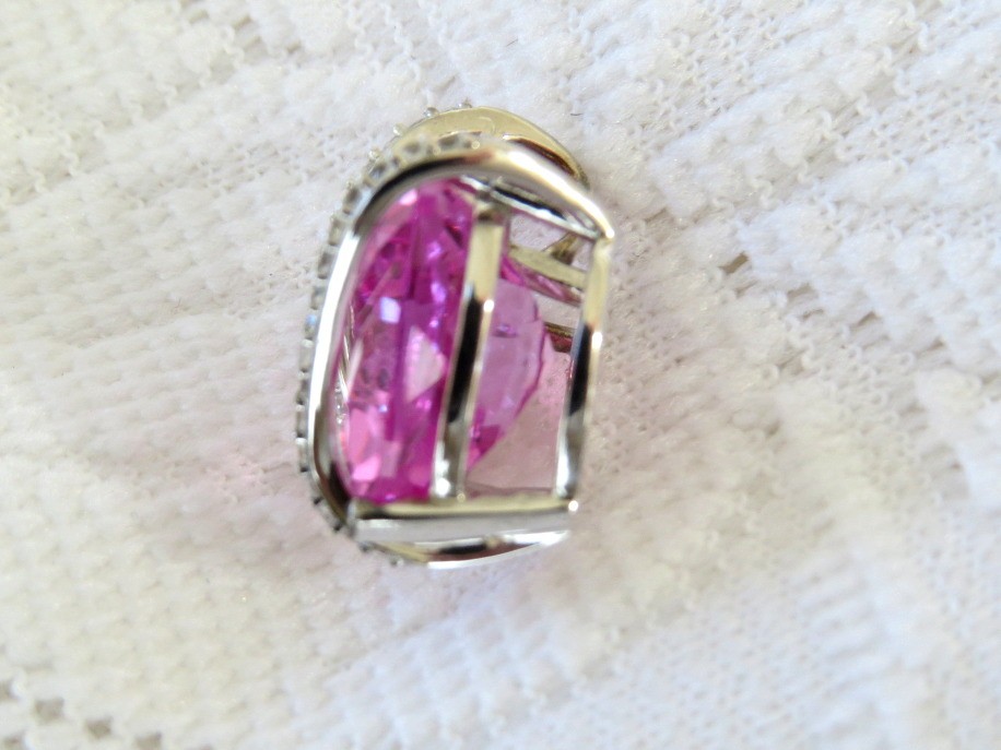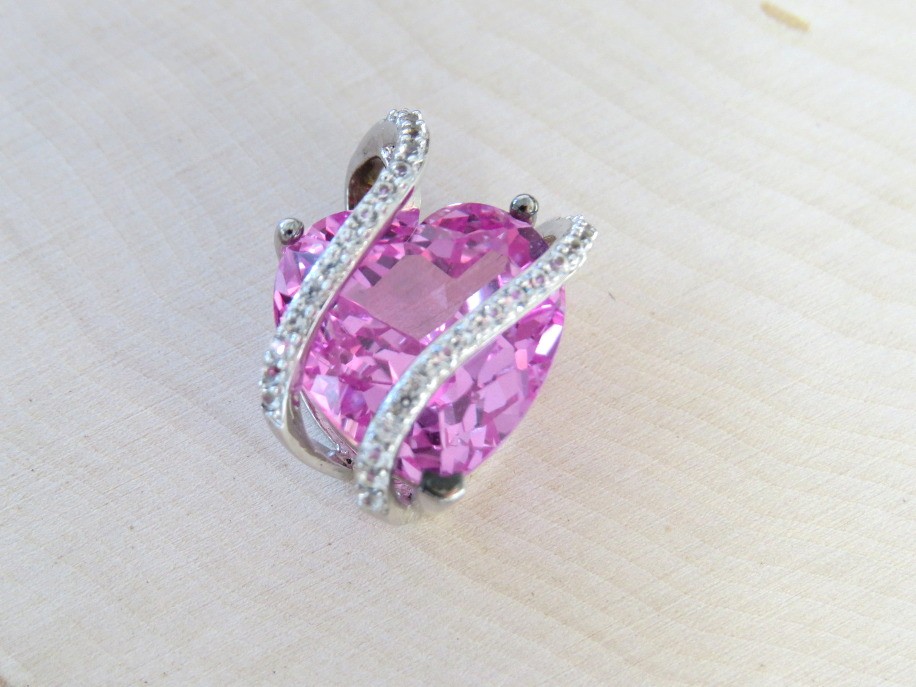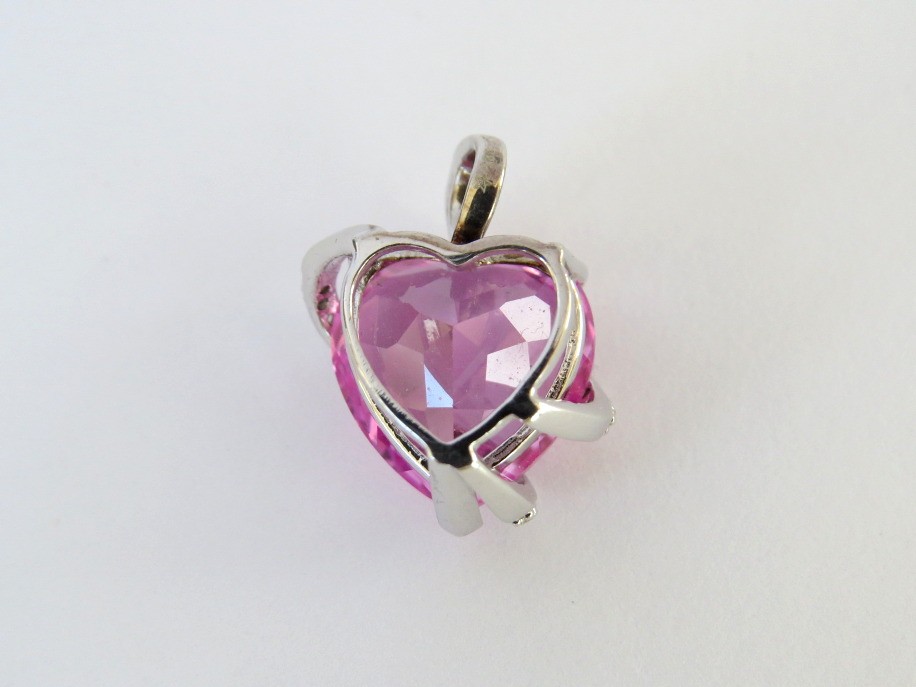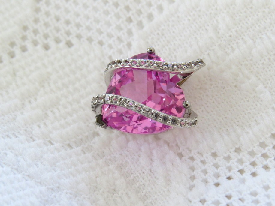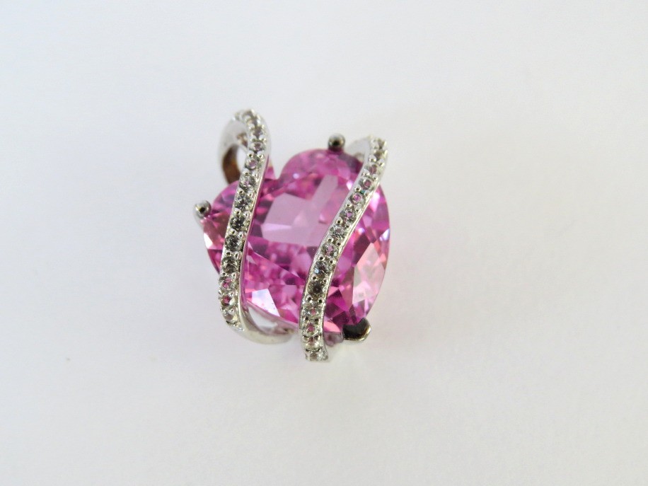 A lovely design set in Sterling Silver with a faceted lab created pink center stone and uniquely wrapped with sterling and clear stone bands. Pendant is marked 925 and has a Hallmark of an F inside a heart. Measures 5/8" at the widest part of the heart.