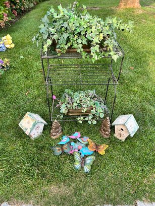 Iron Table, 2 Shelf, W/faux Plants, Bridhouses, And Butterflies