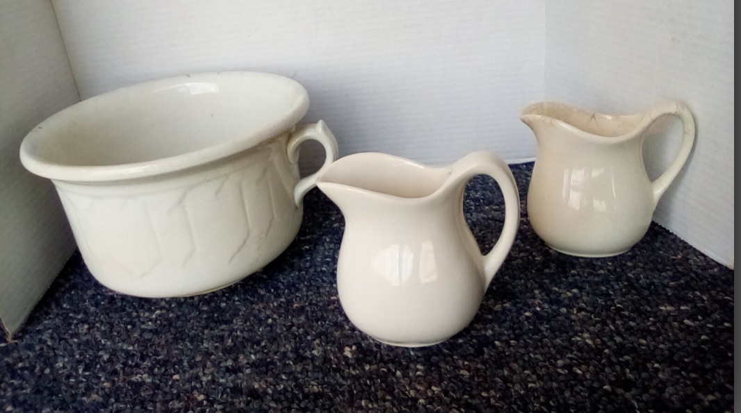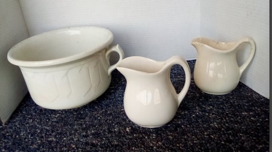 Ironstone Trio - Handled Crock & Lovely Pitchers. Enjoy adding these to an existing collection or starting a new one. Goes with almost any decor.