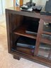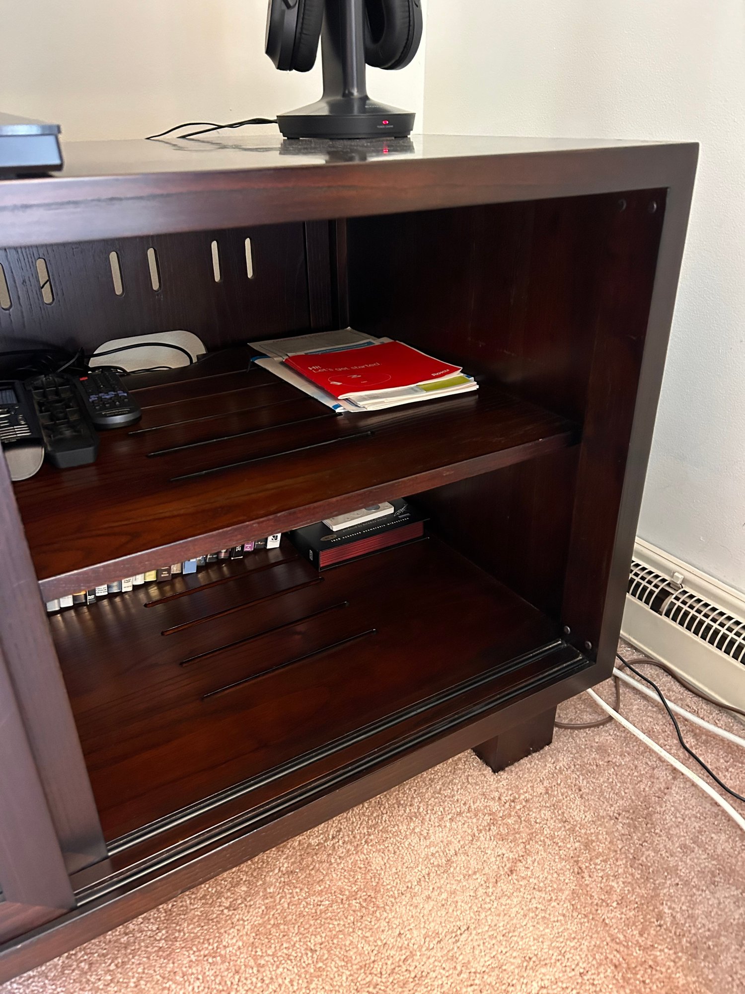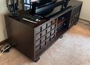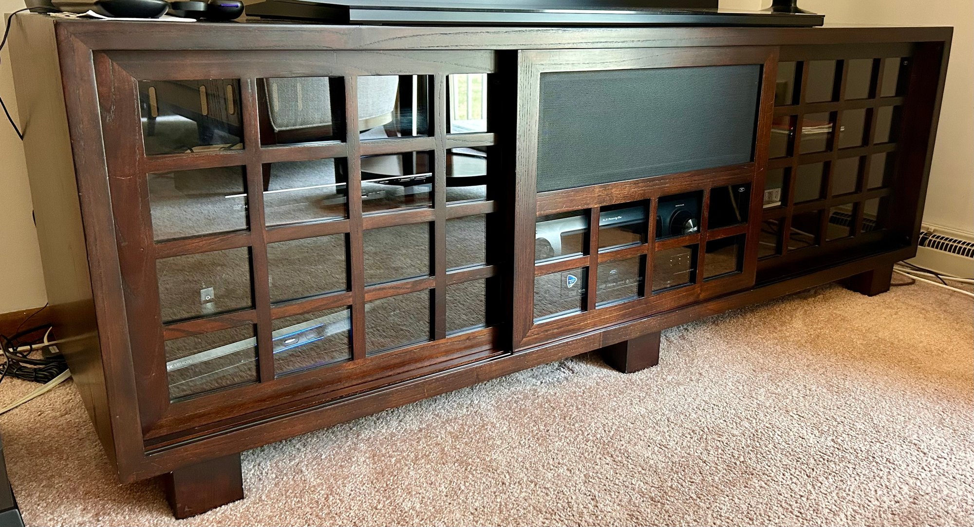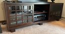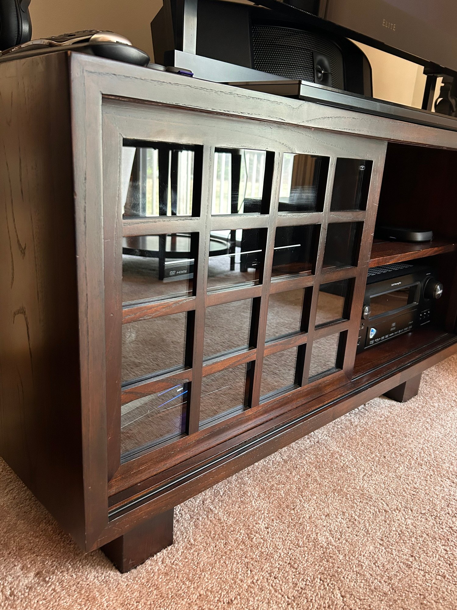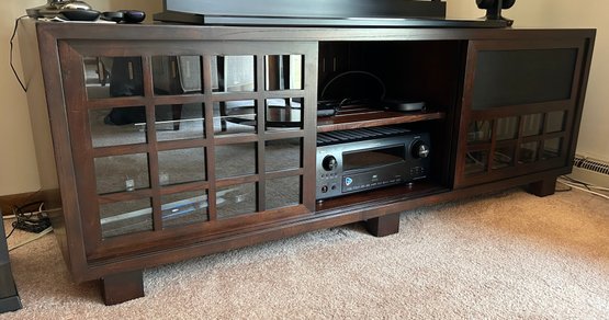 This lot is only for the dark brown media cabinet, it does not include and of the contents / electronic components inside. It has a series of three sliding door on the front and appears in good used condition. This cabinet measures approximately 66” long x 22” deep with a height of 23”.