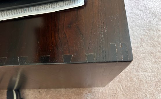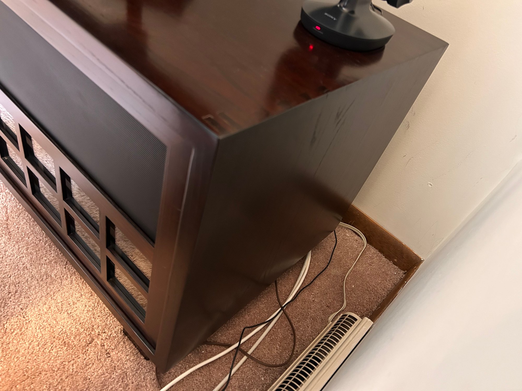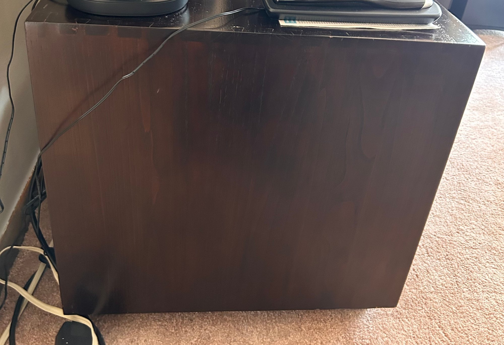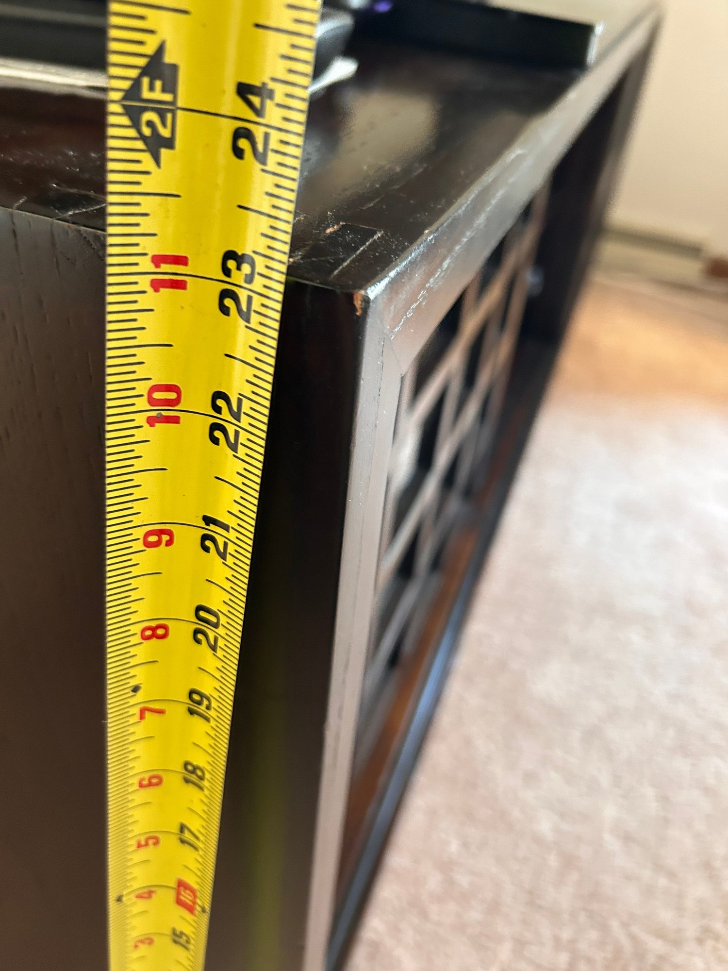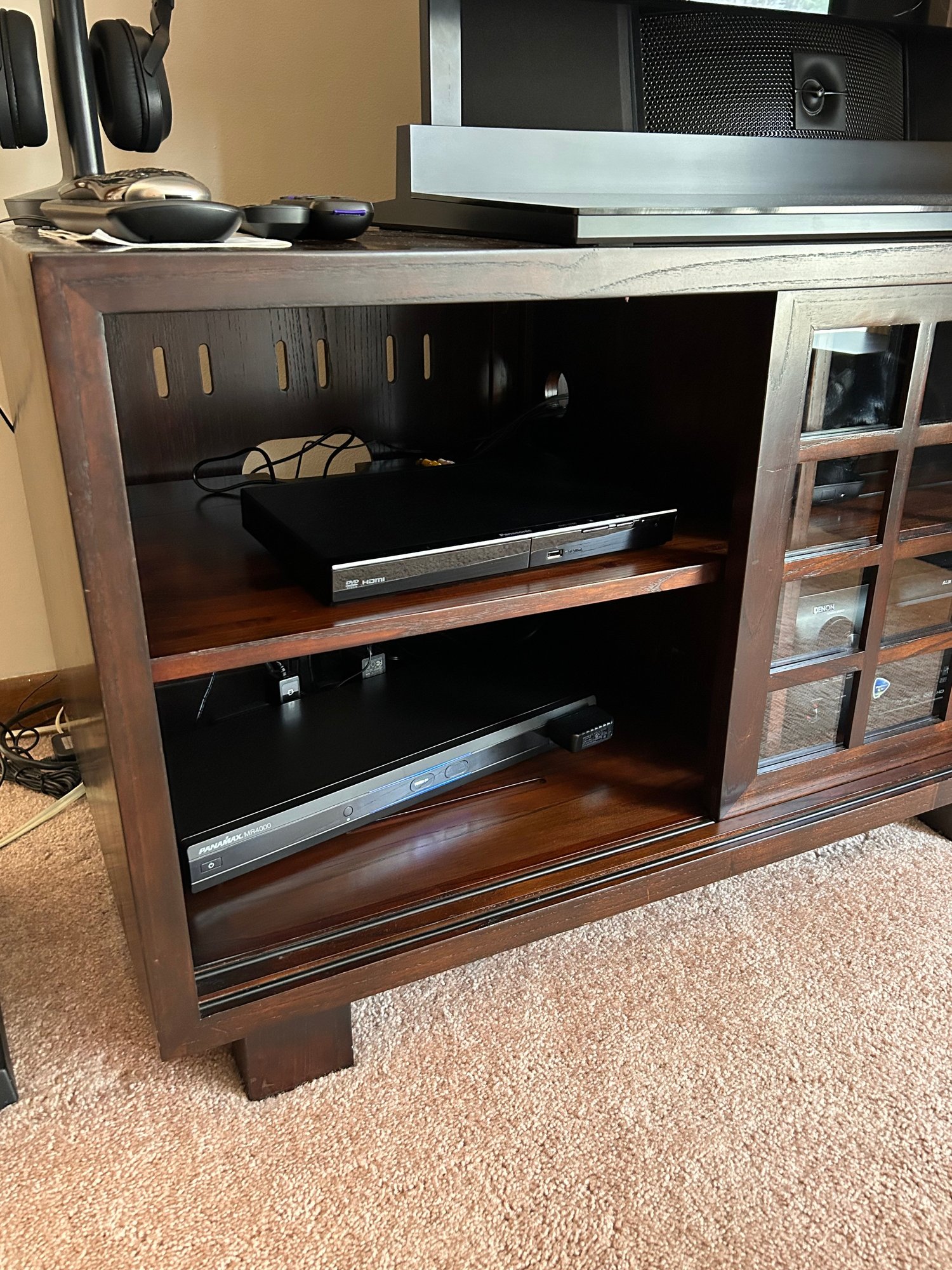 This lot is only for the dark brown media cabinet, it does not include and of the contents / electronic components inside. It has a series of three sliding door on the front and appears in good used condition. This cabinet measures approximately 66” long x 22” deep with a height of 23”.