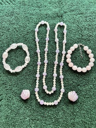 Rose Quartz 36" Necklace With Amethyst Rose Quartz Earrings, 2 Bracelets, Sterling Clasp