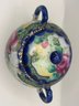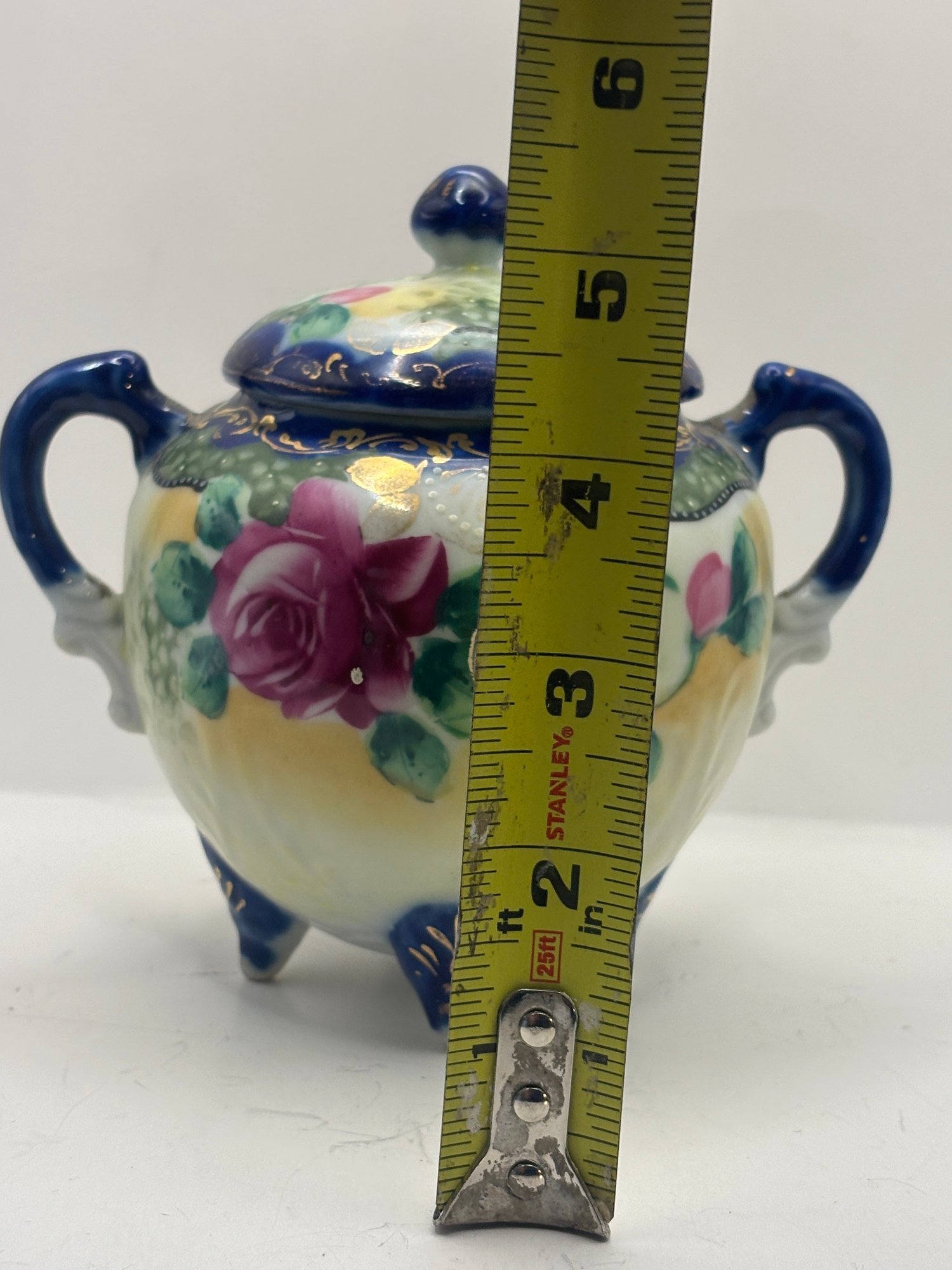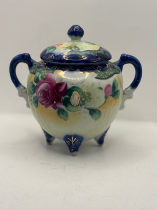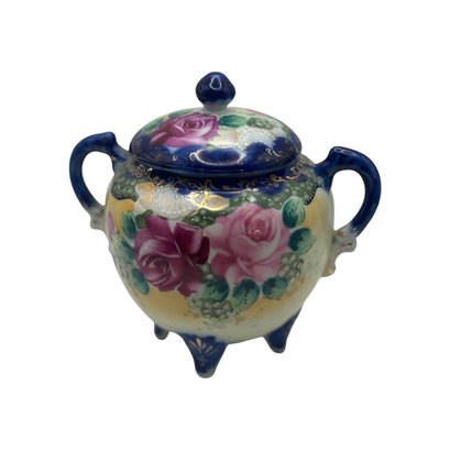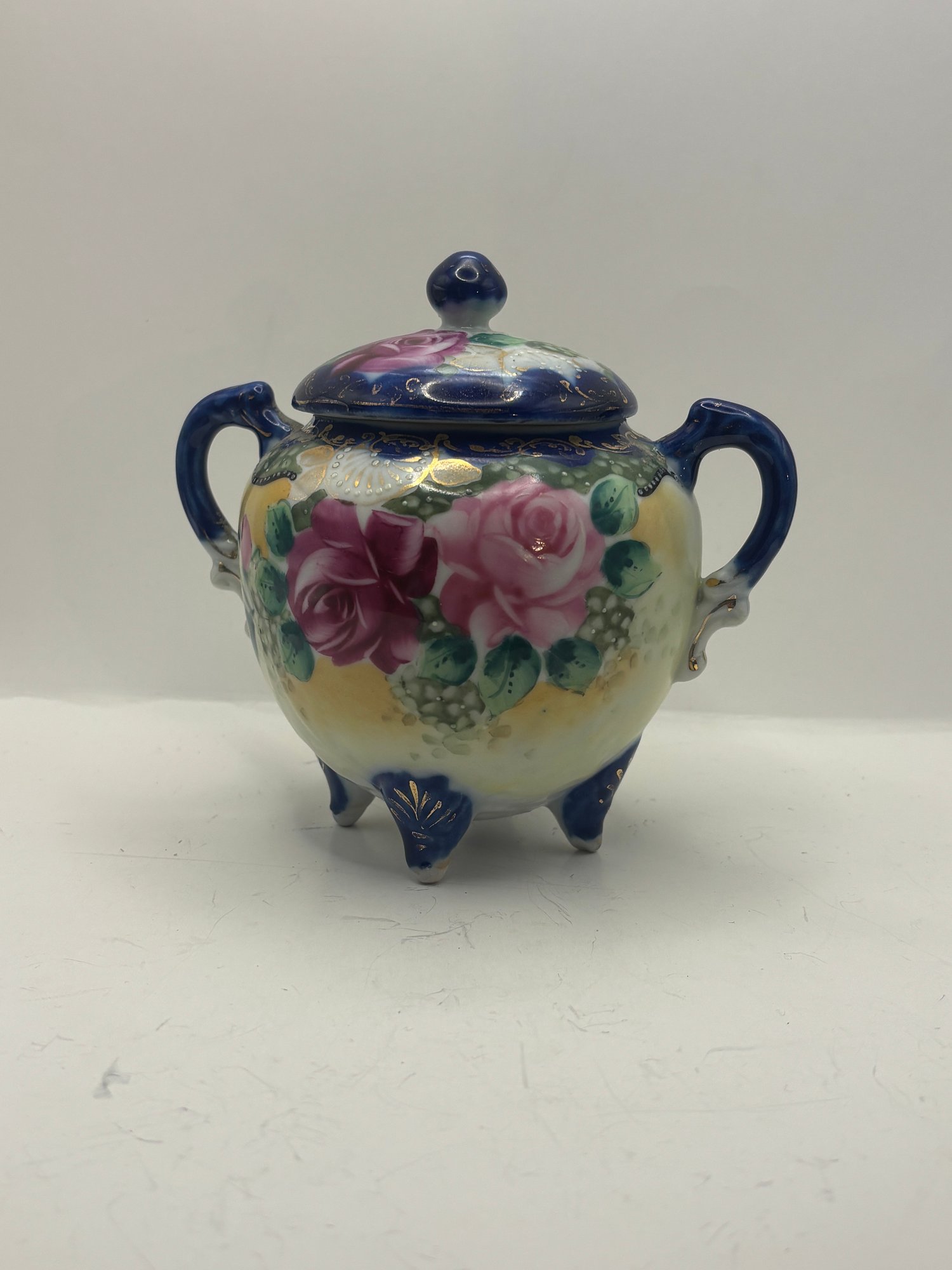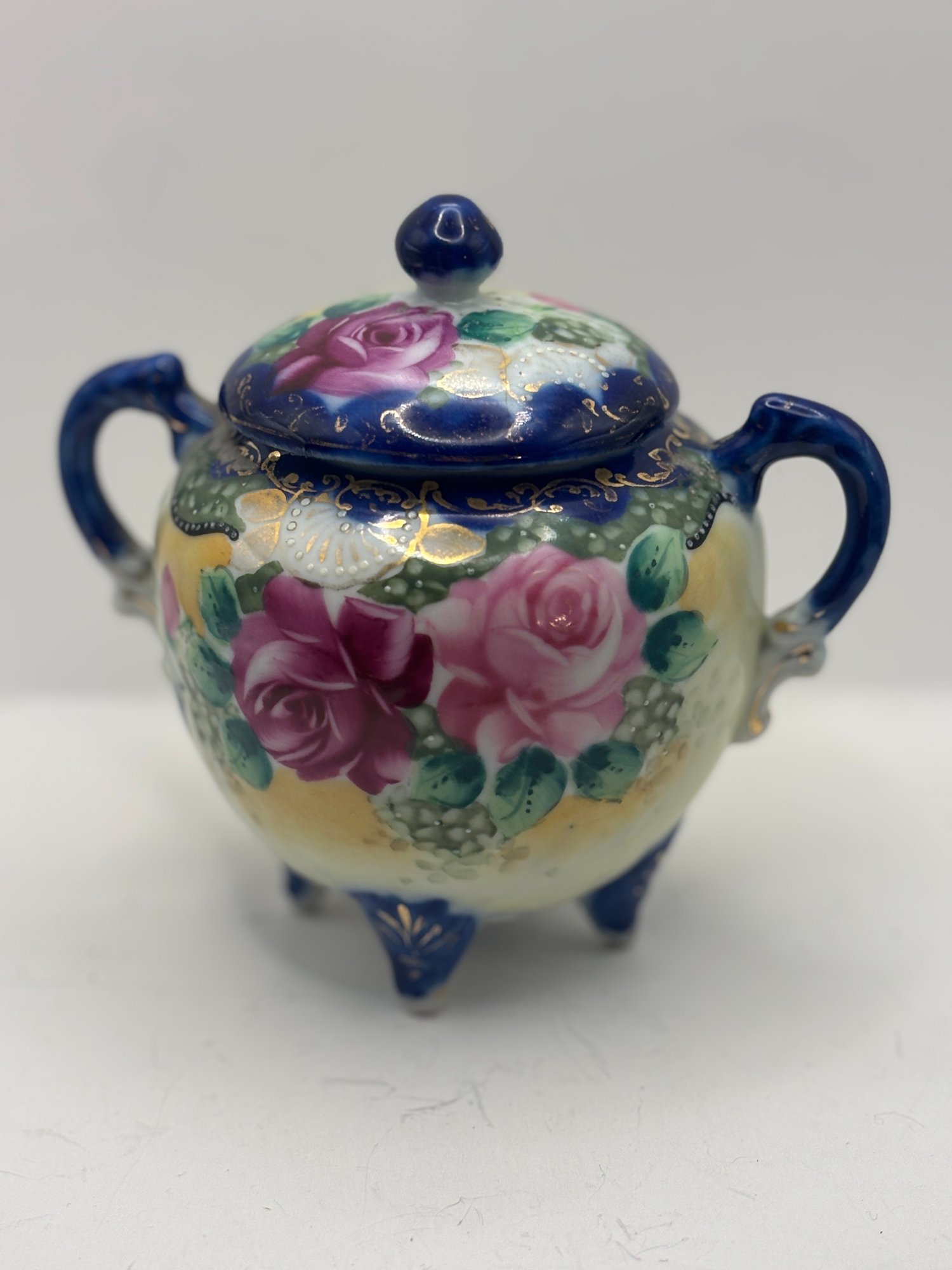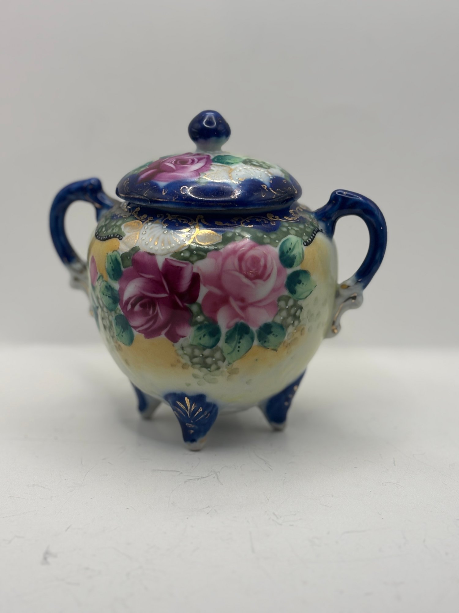 The form is wonderfully theatrical — rounded body, twin handles, domed lid with finial, and three petite feet that give it a lifted, almost dollhouse elegance. The underside bears a blue “Hand Painted Nippon” mark, placing it within the late 19th to early 20th century export period when these ornate decorative wares were crafted for Western markets.