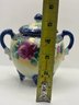 A beautifully hand-painted Nippon porcelain sugar bowl standing approximately 6" tall, richly decorated with layered pink and burgundy roses against a soft, blended ground of ivory and pale yellow. Deep cobalt blue handles, lid, and feet are accented with gilt flourishes, while raised moriage-style gold detailing adds texture and shimmer throughout.