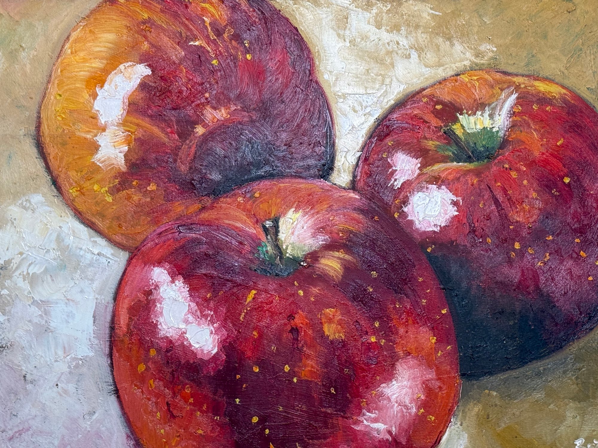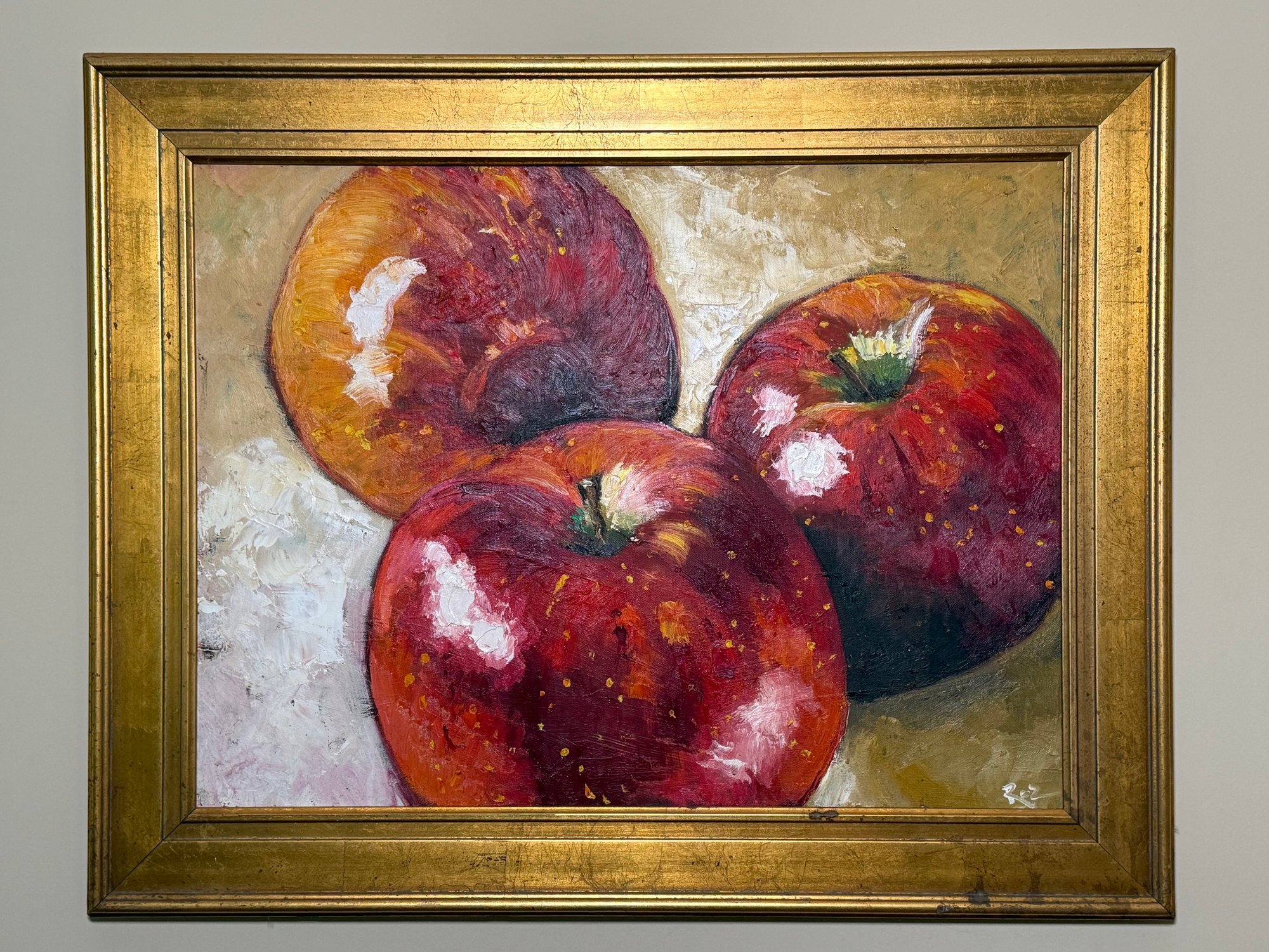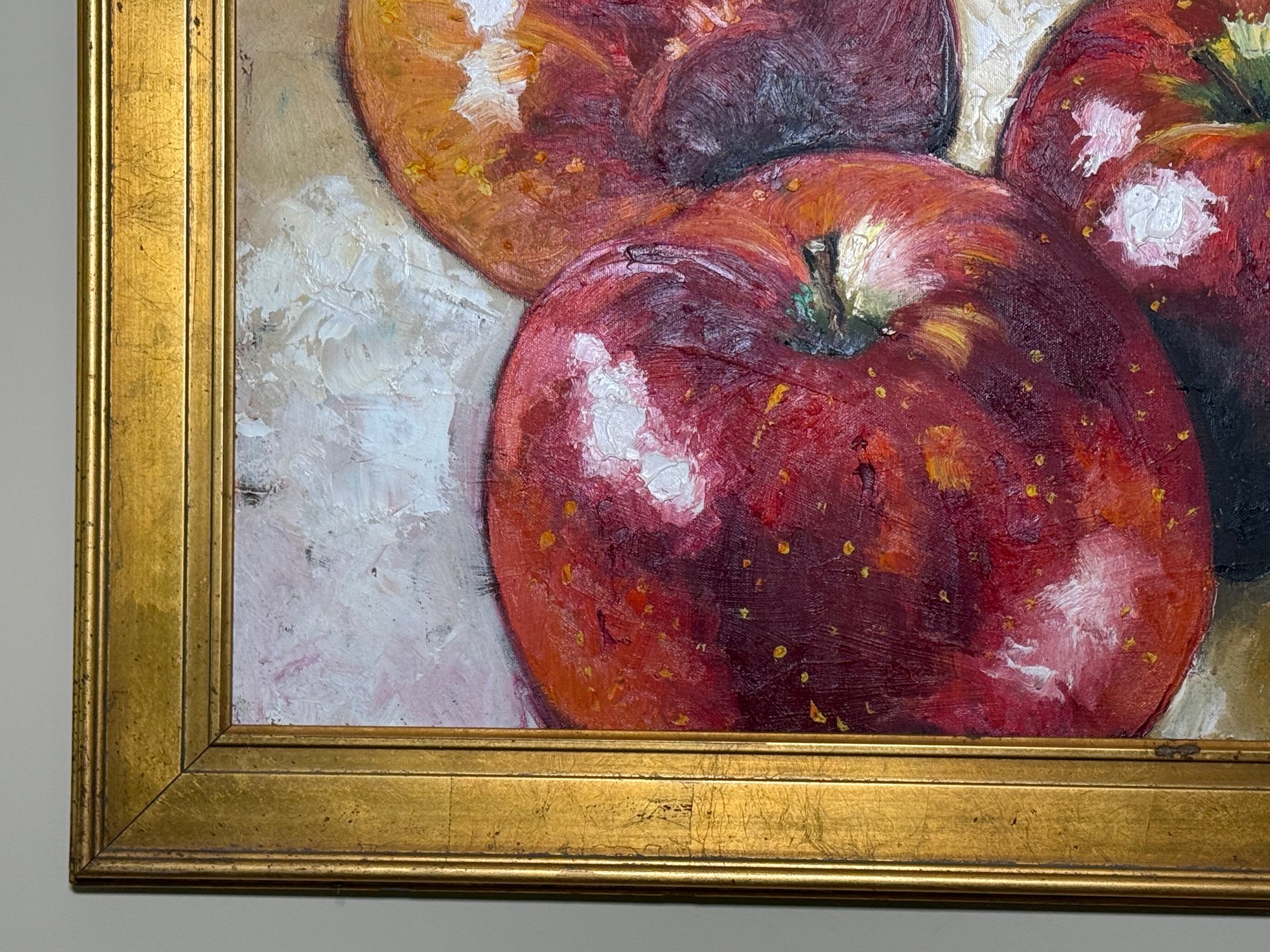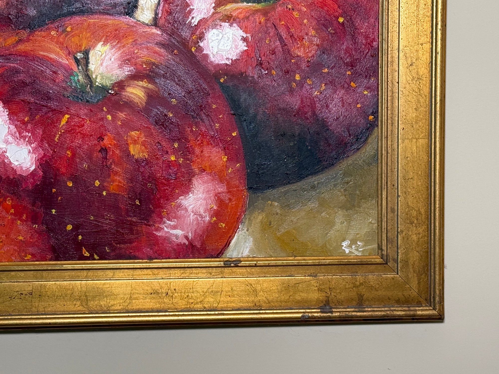 This beautiful Rosilyn Young original oil painting captures these apples so amazing! The reds against the gold painted frame are lovely. Signed by artist bottom right hand corner.