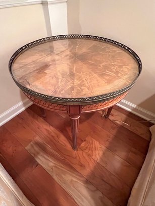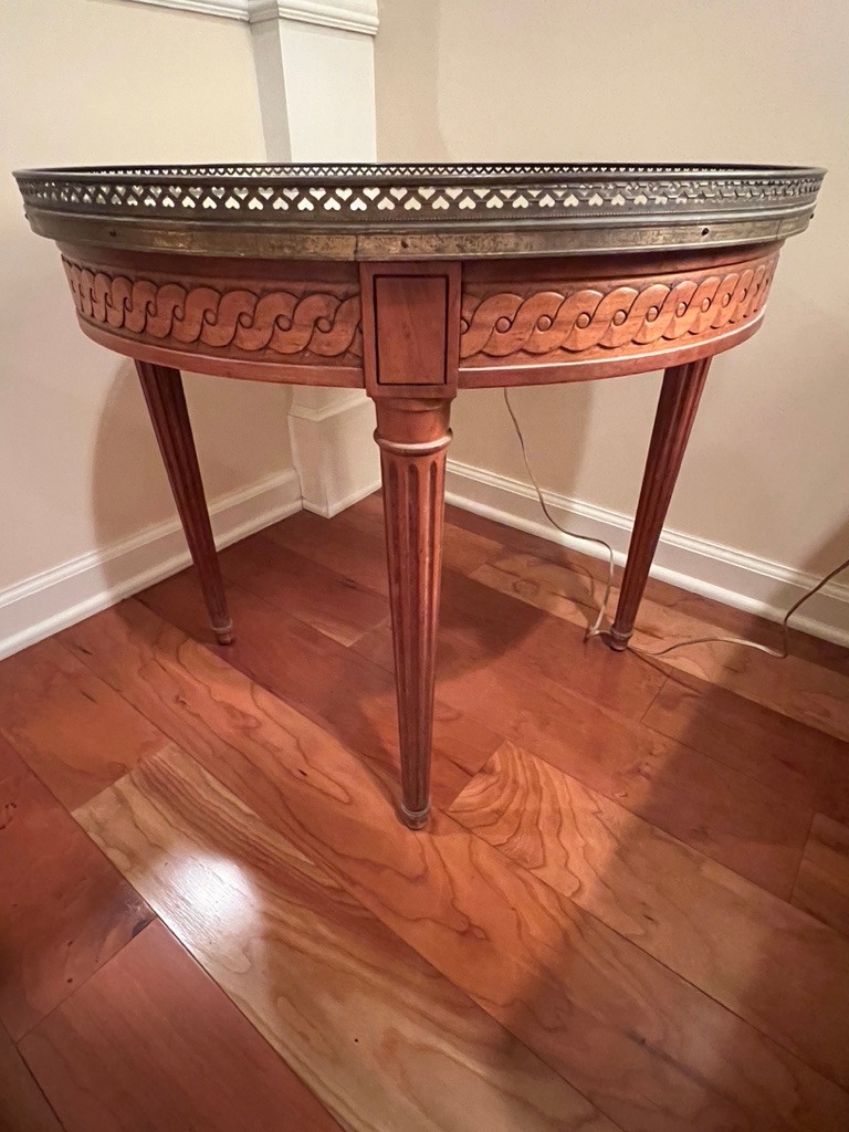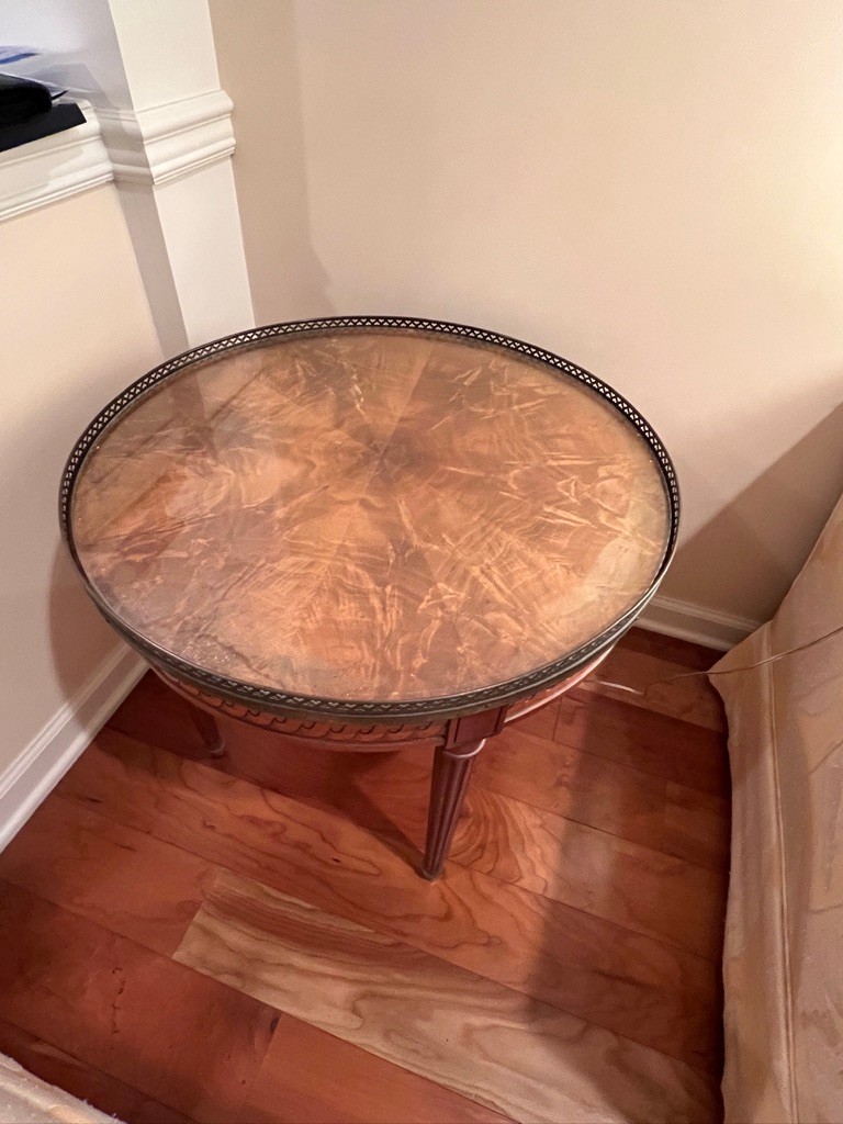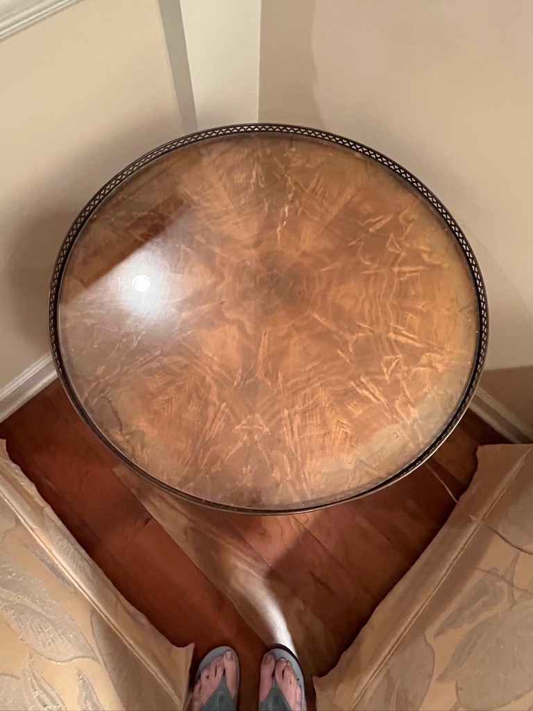 Round end table, glass top, mahogany, theere is fading on the etop, like a drink was spilled, and the edge was effected, overall, use old English, it will be wonderful once again!