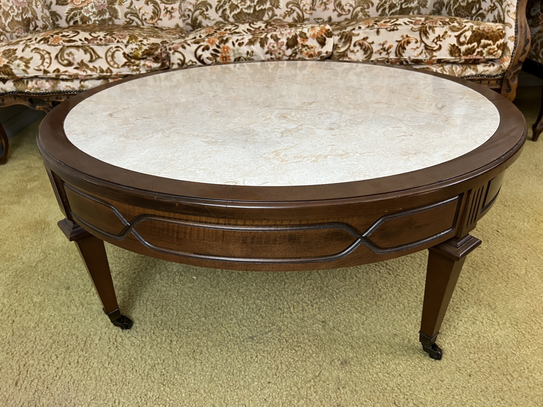 Circular neoclassical style vintage coffee table with a faux marble inlay top and caster feet.