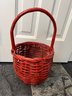 Round woven rush basket in a red color with a single arched handle.