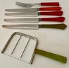 A nice group of red and green bakelite handled cutlery including a cutter (for cheese I assume). They are all in good condition. The knives are 9" long, and the cutter is 7 1/4" long.