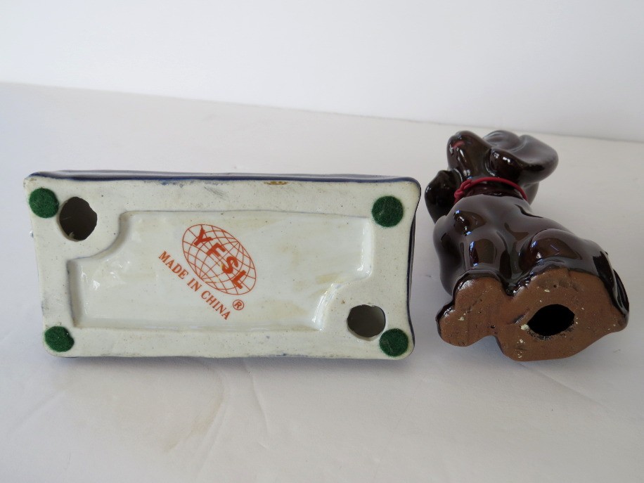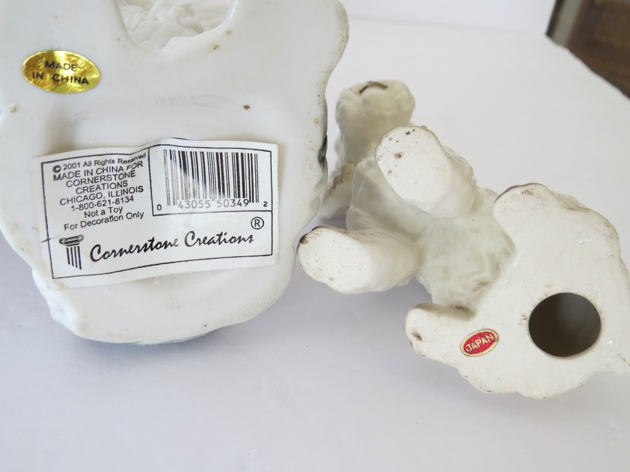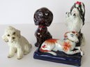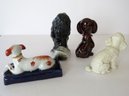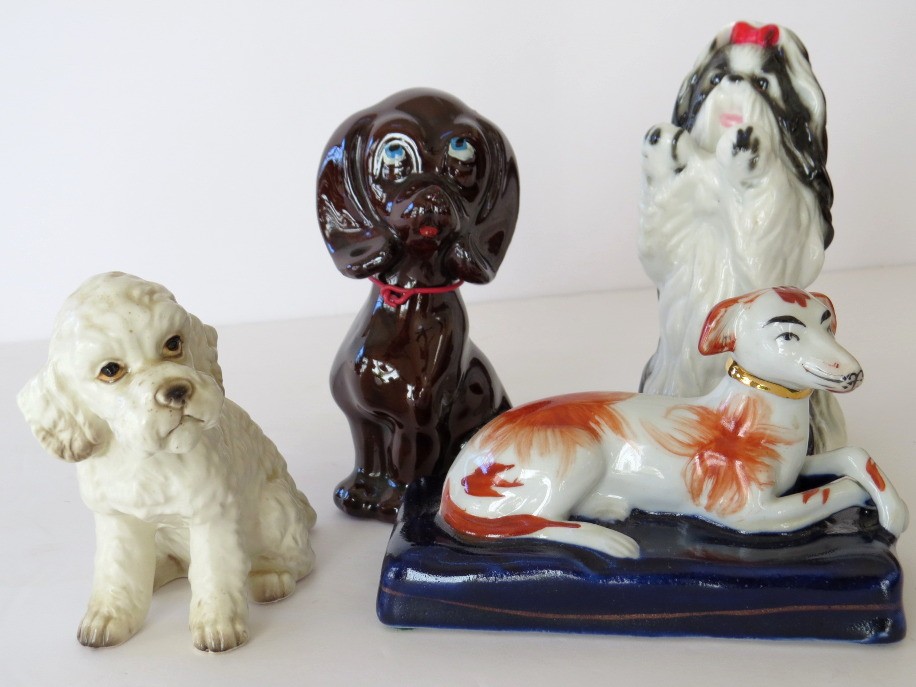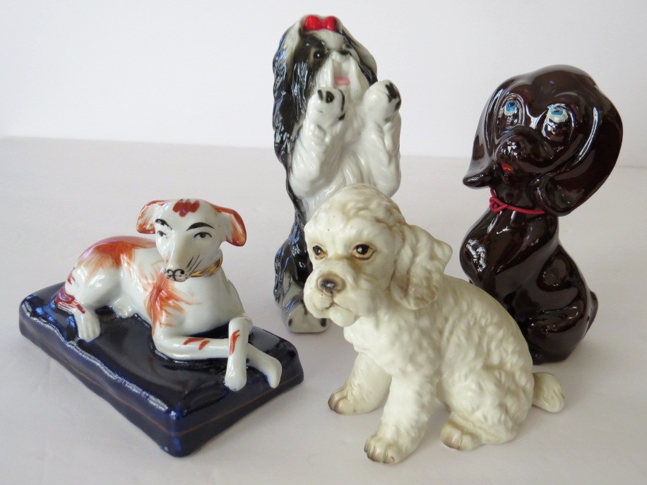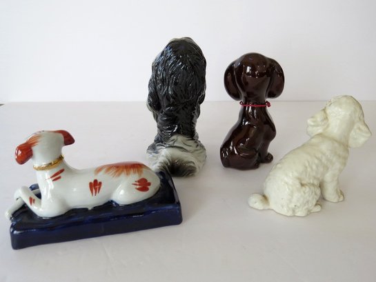 A mixed vintage grouping of 4 dog figurines which range in size from 3"-5" in height. All figurines appear to no cracks, chips or repairs.
