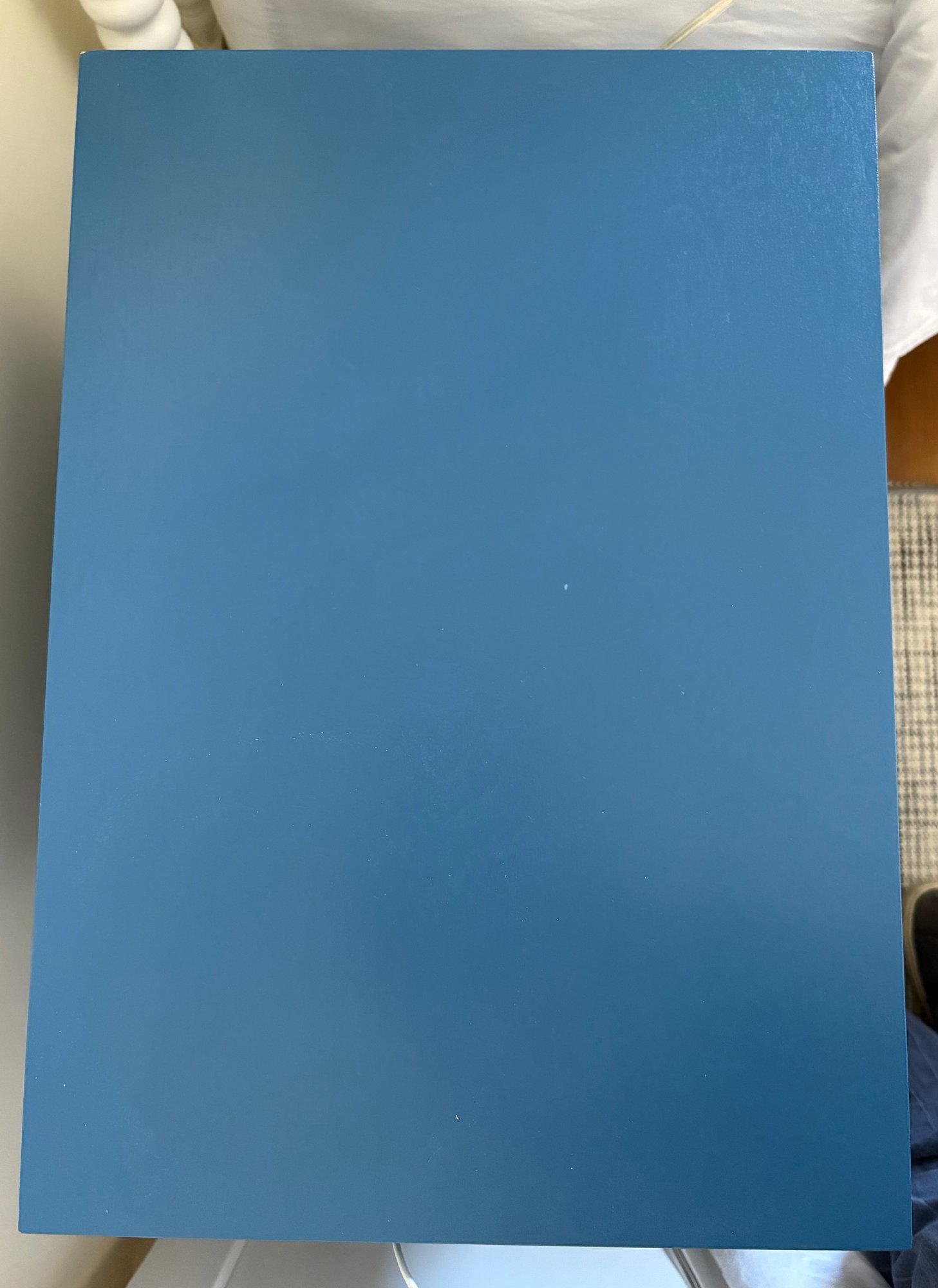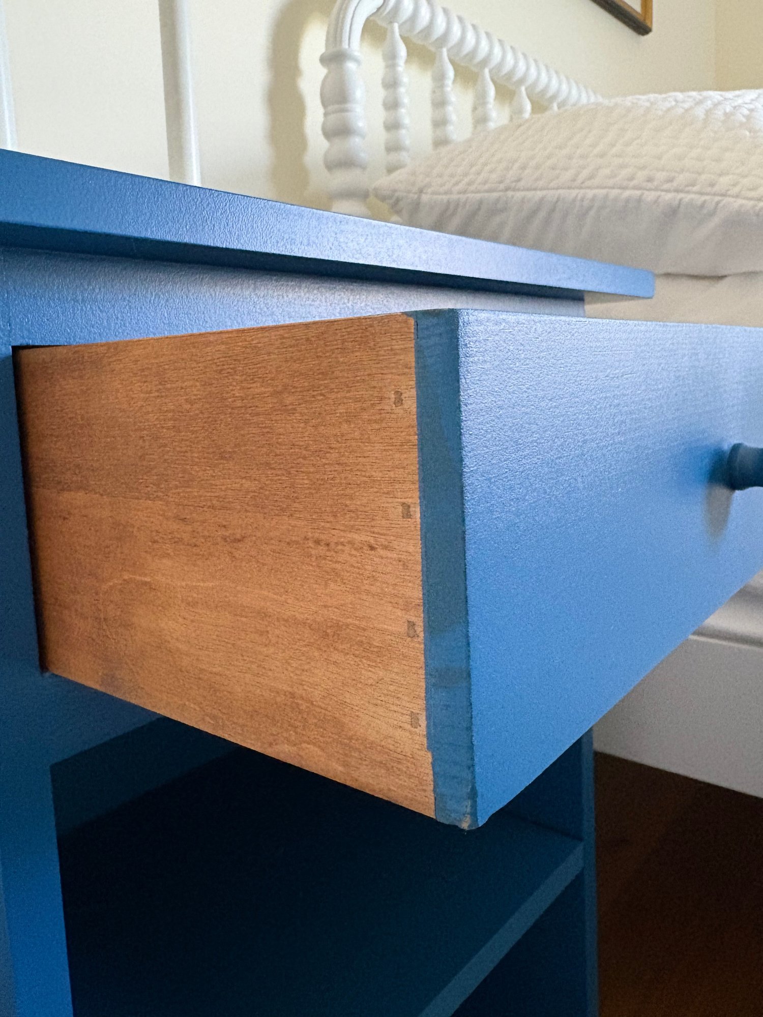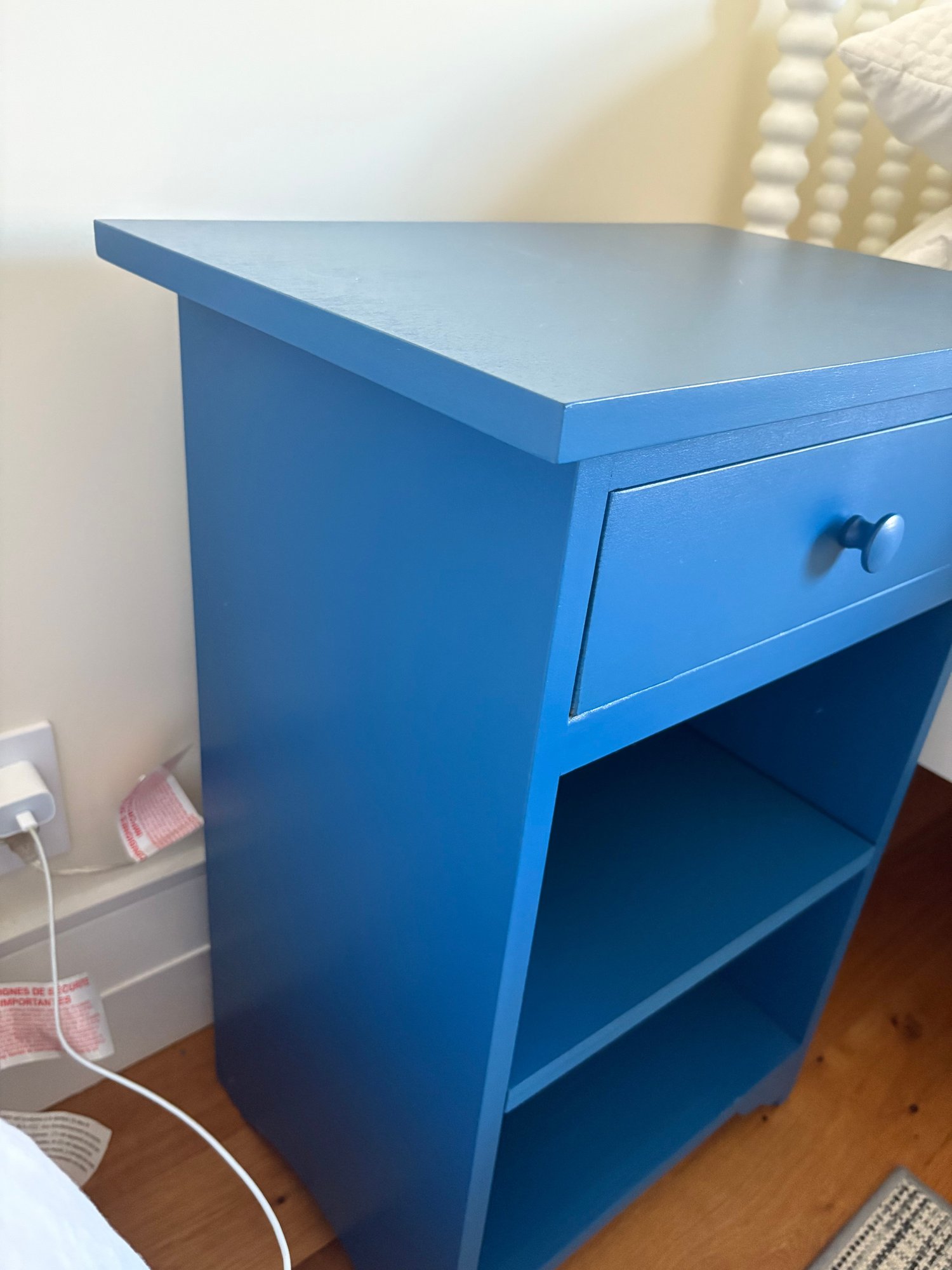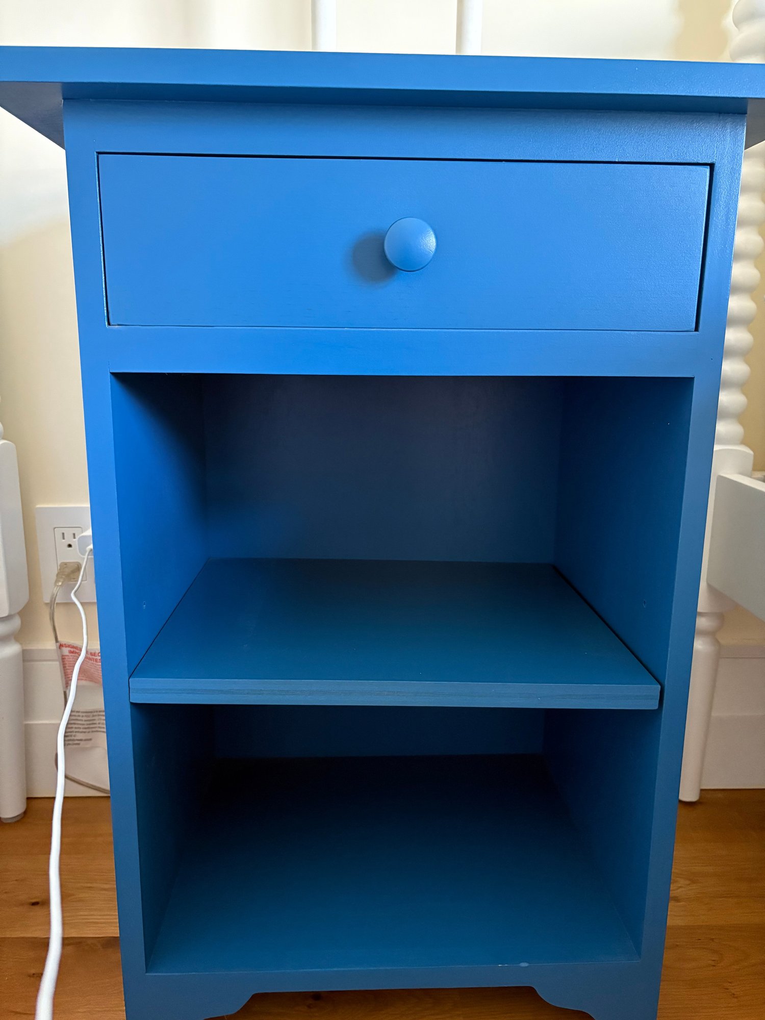 Royal blue nightstand featuring a single drawer and two (2) lower cubbies.