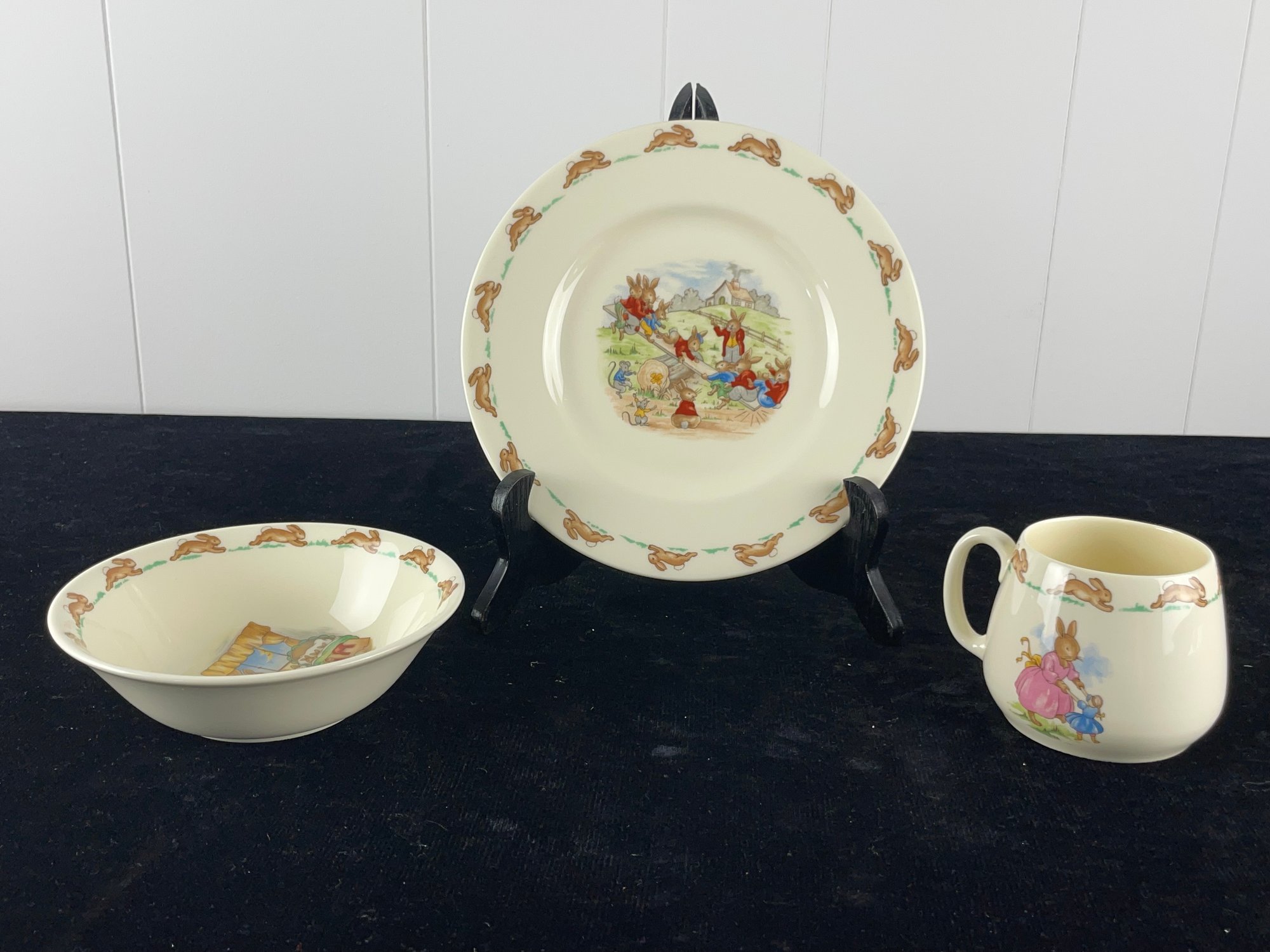 Three dishes in set. One mug, bowl and plate. No damages seen in the images. See photos for more conditions and sizing.