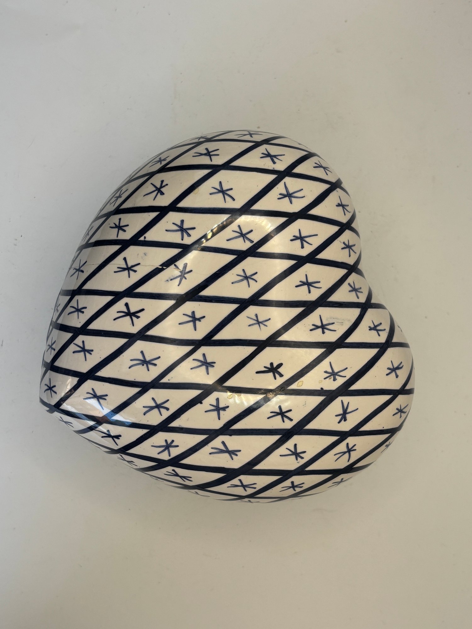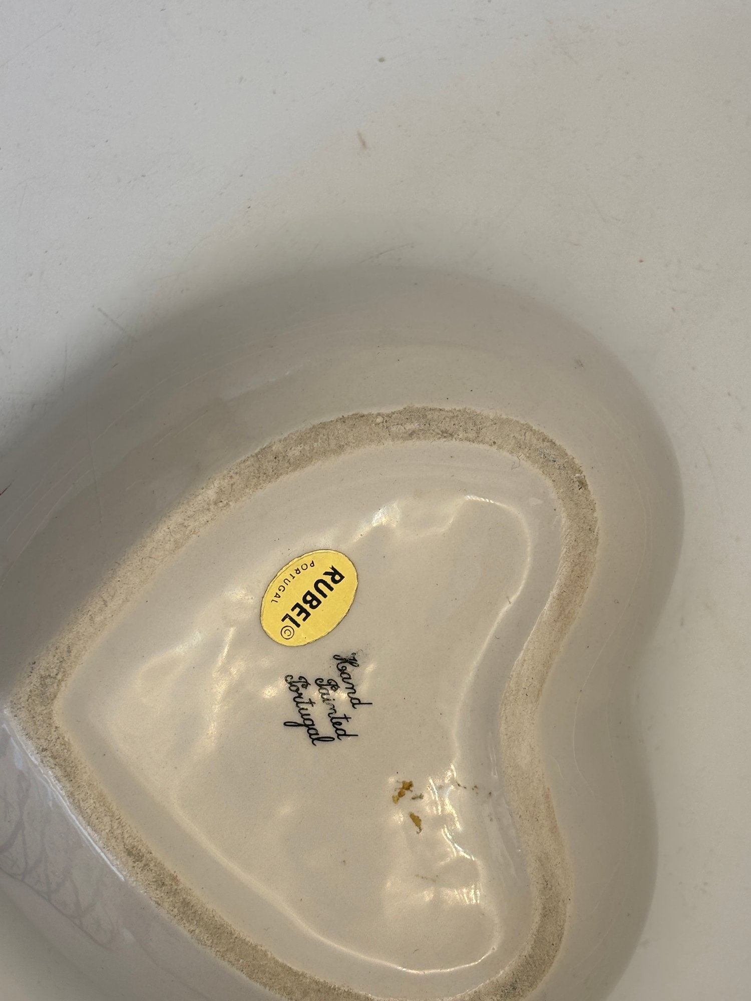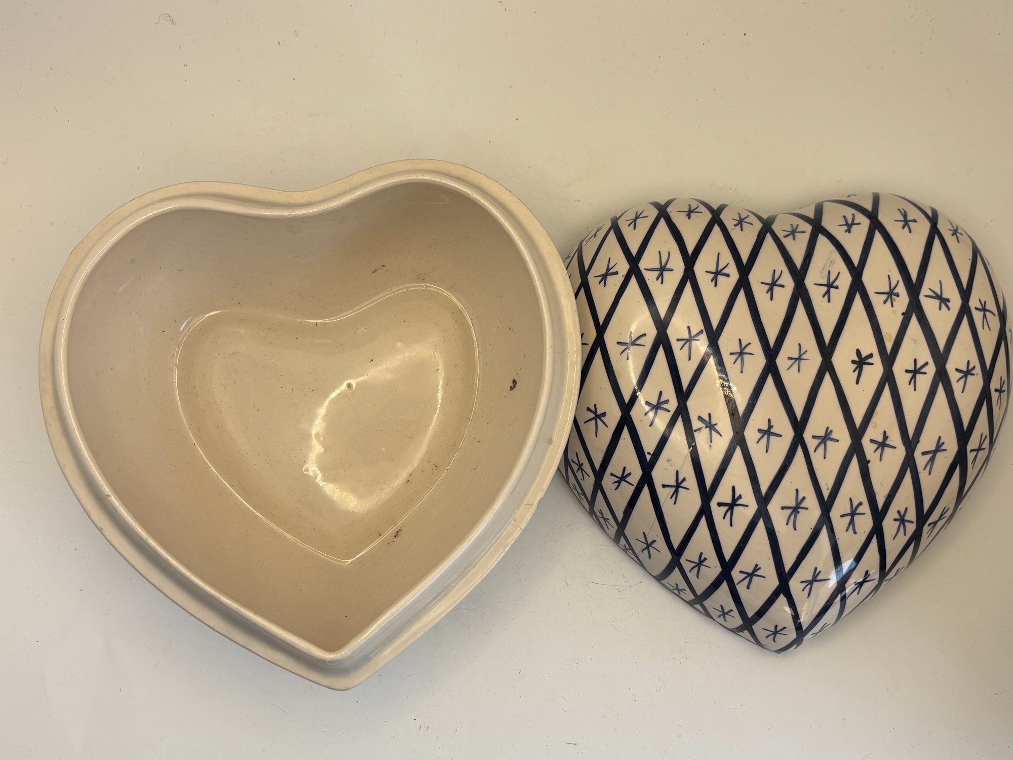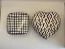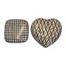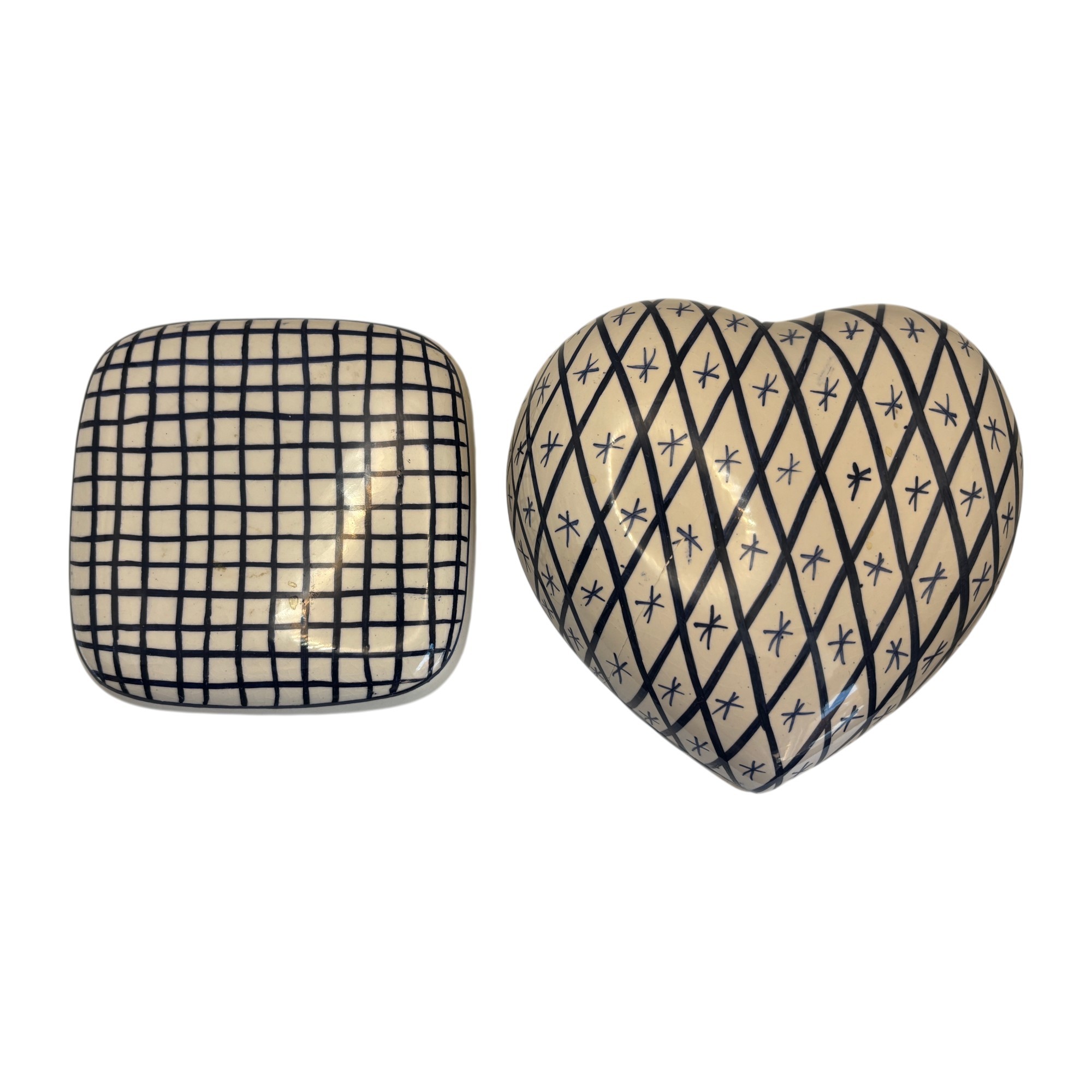 Includes one heart-shaped box (approximately 5" wide) with diamond lattice and star motif, and one square box with grid pattern. The heart-shaped example retains original Rubel Portugal label and hand-painted mark to underside.