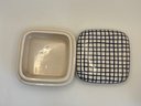 Pair of hand-painted ceramic trinket boxes by Rubel, Portugal, featuring classic blue and white decorative patterns.
