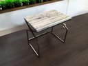 The legs are of cast iron. The top is made of wood strips painted is an off white distresses fashion. The approximate dimensions are 23 1/8" wide, 15 1/8" deep, and 21" high.