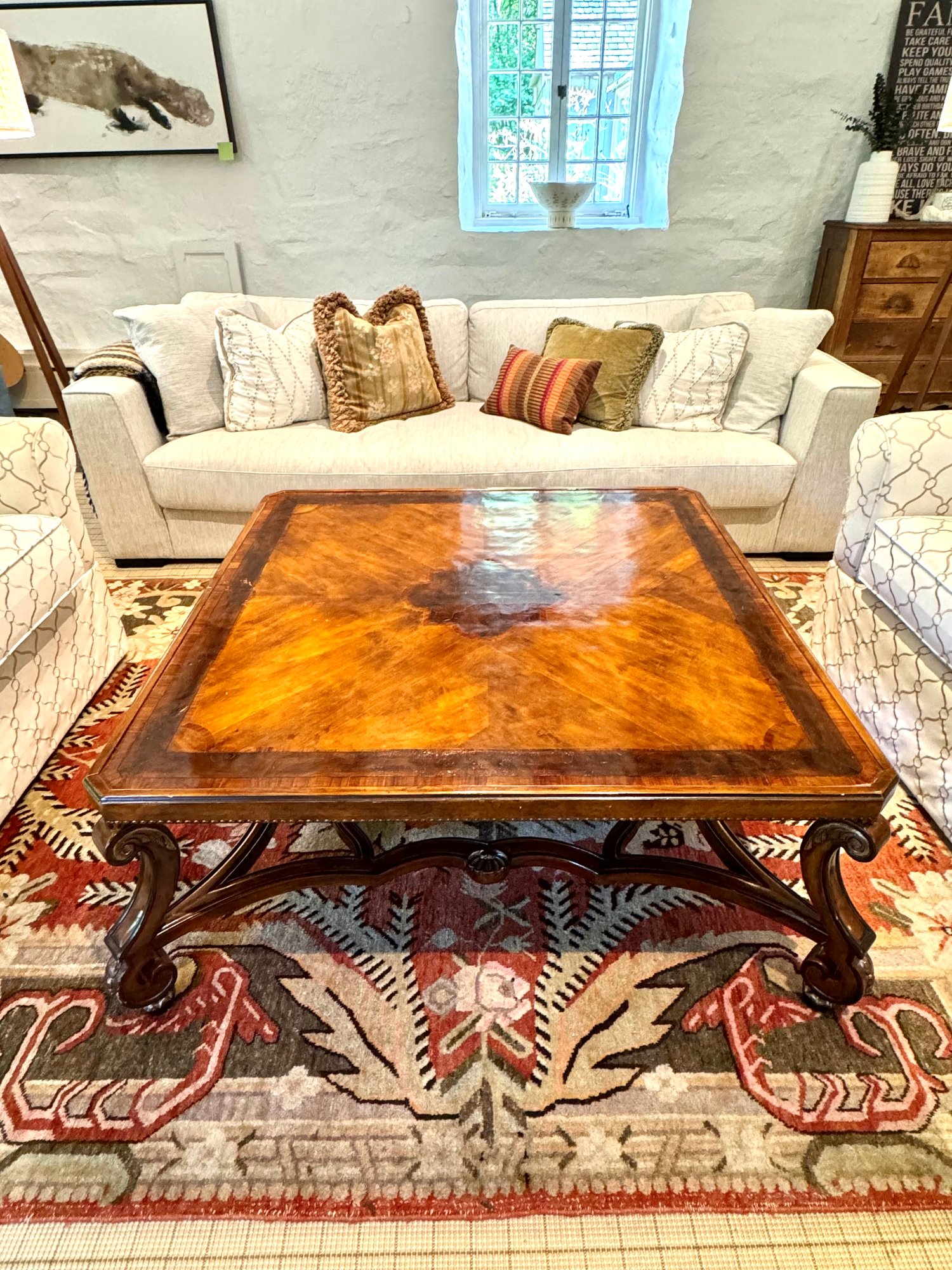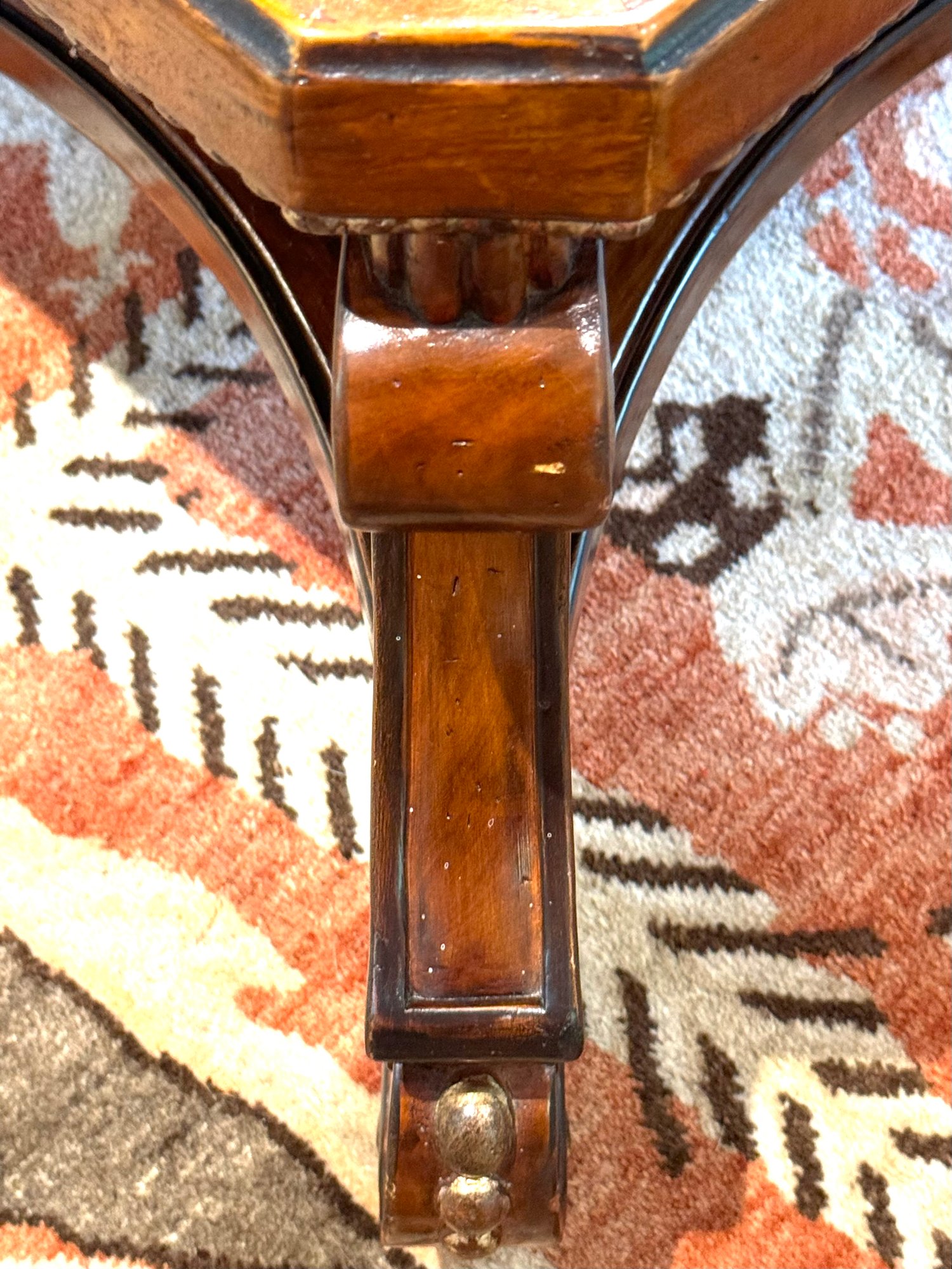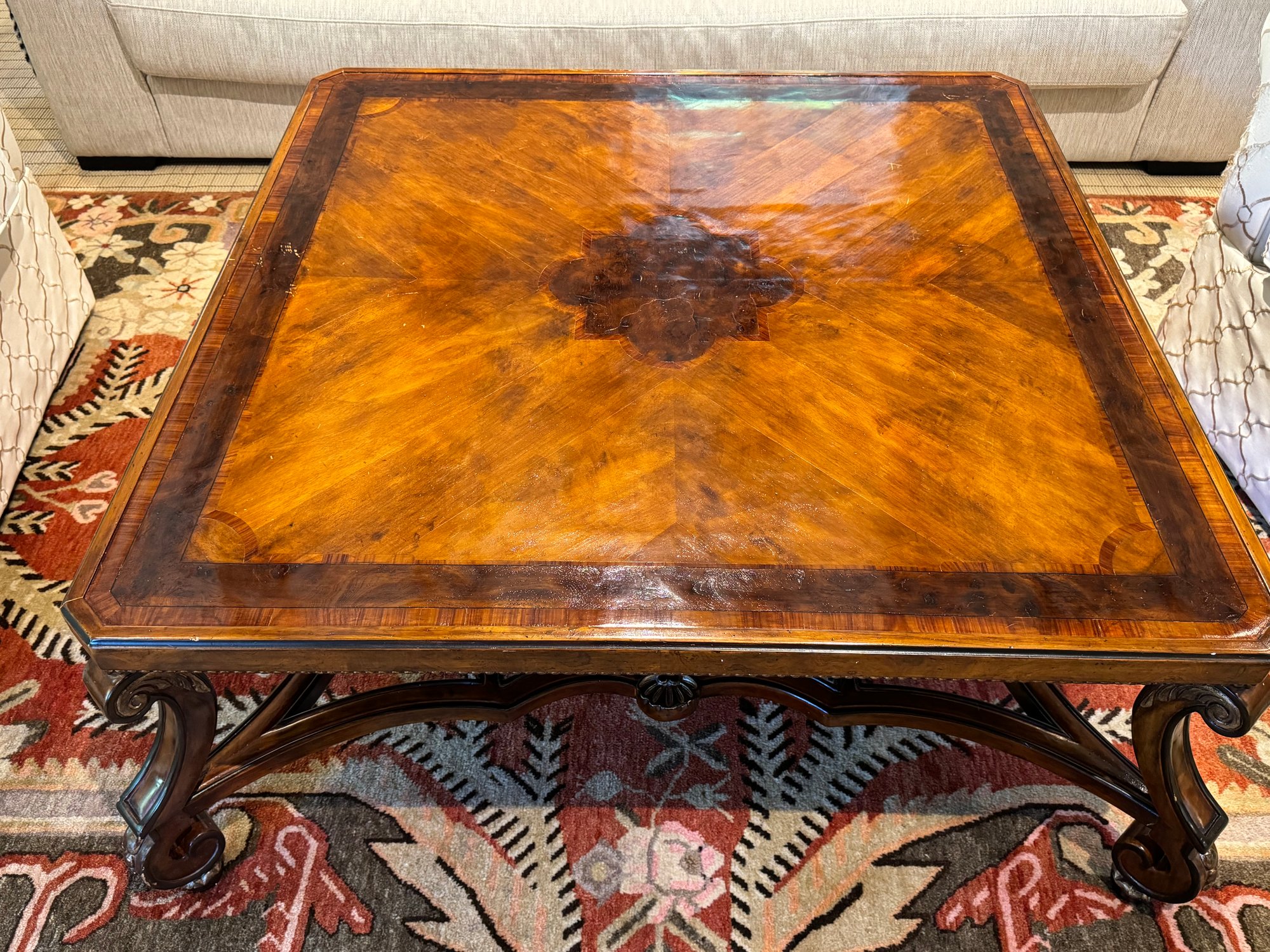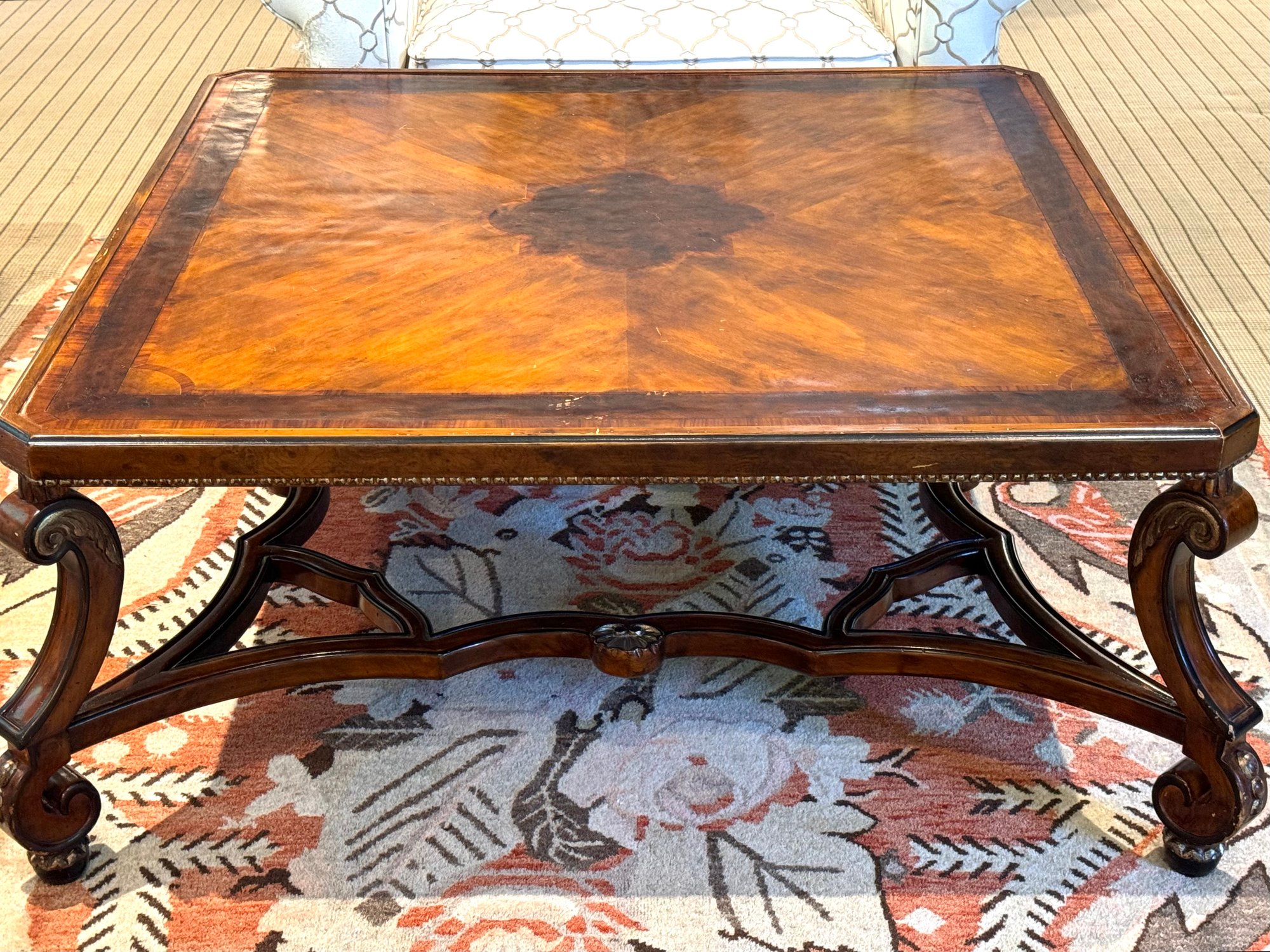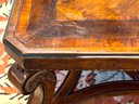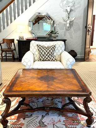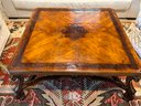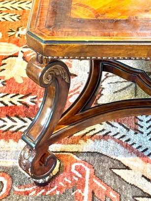 Beautiful quality made in Italy cocktail table with decorative inlay style finish and center medallion. Condition presents well is very gorgeous with lite use and a few surface nics on legs from lite use. A wood touch up pen will help to conceal nics. A must have for upcoming Autumn gatherings :)!