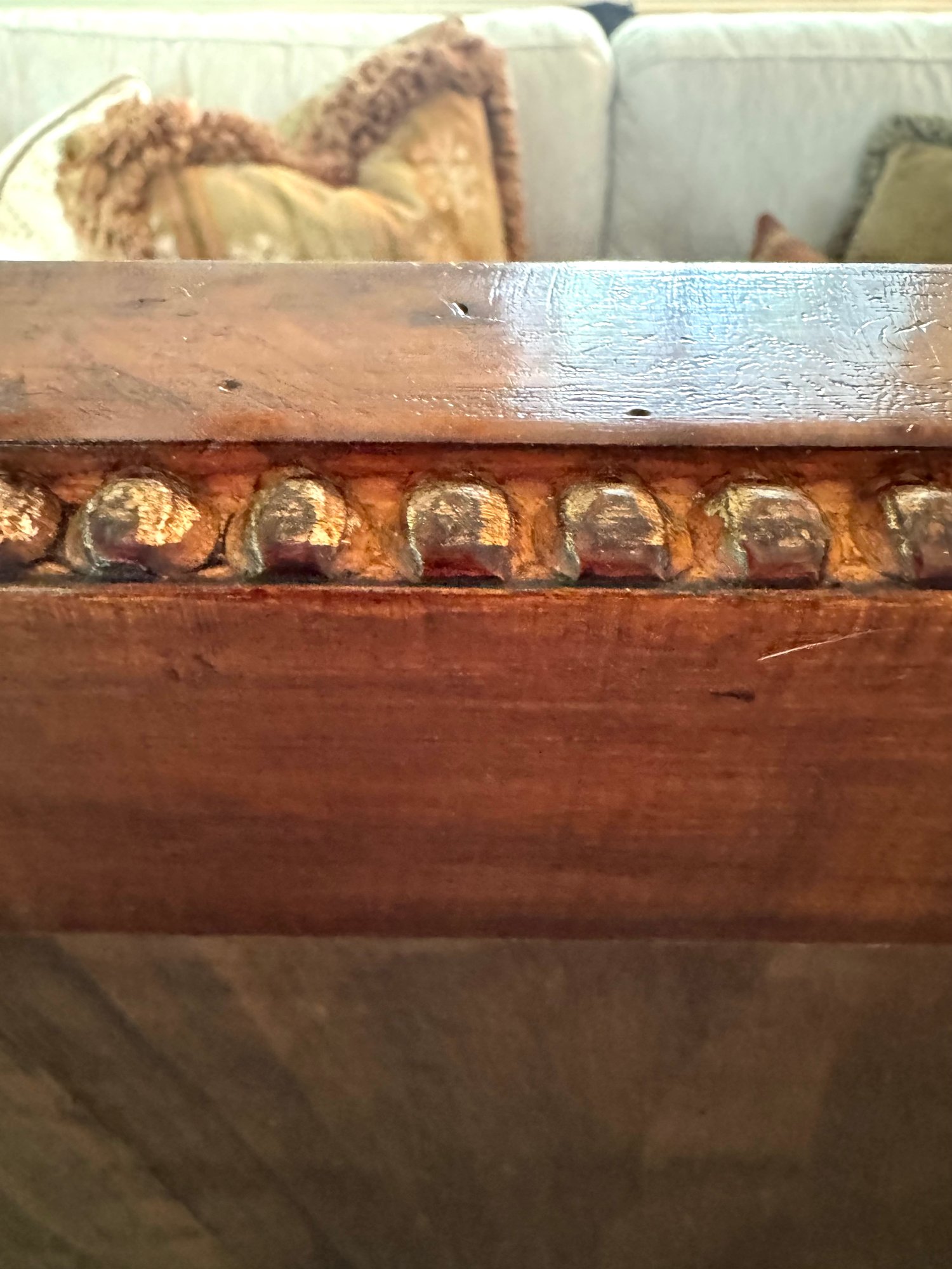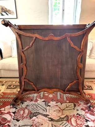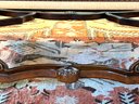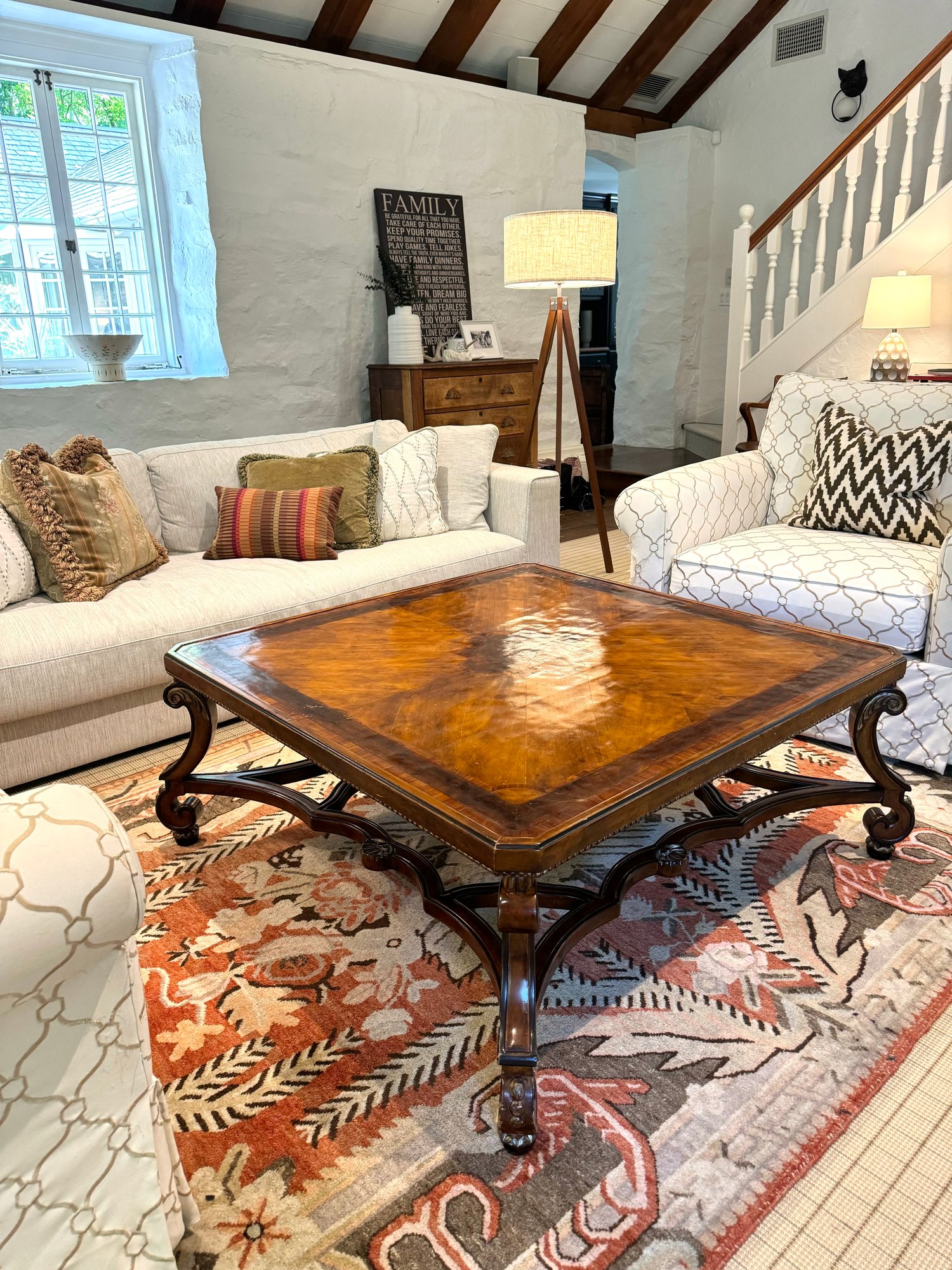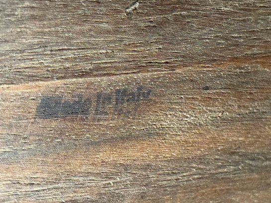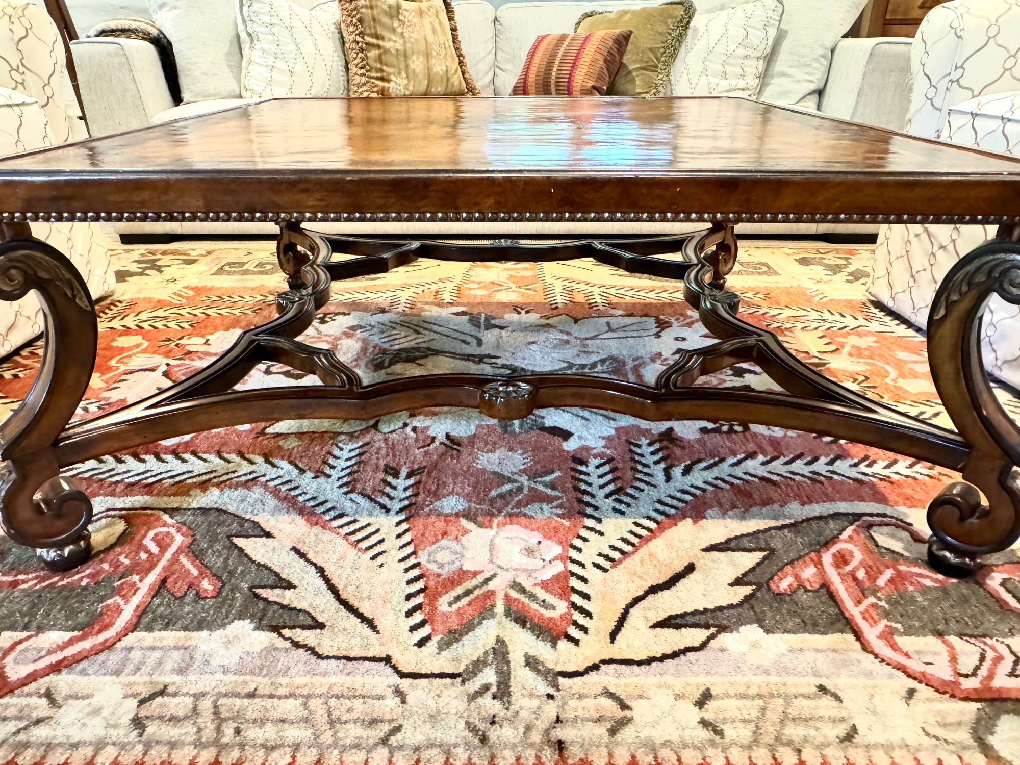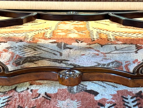 Beautiful quality made in Italy cocktail table with decorative inlay style finish and center medallion. Condition presents well is very gorgeous with lite use and a few surface nics on legs from lite use. A wood touch up pen will help to conceal nics. A must have for upcoming Autumn gatherings :)!