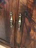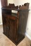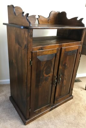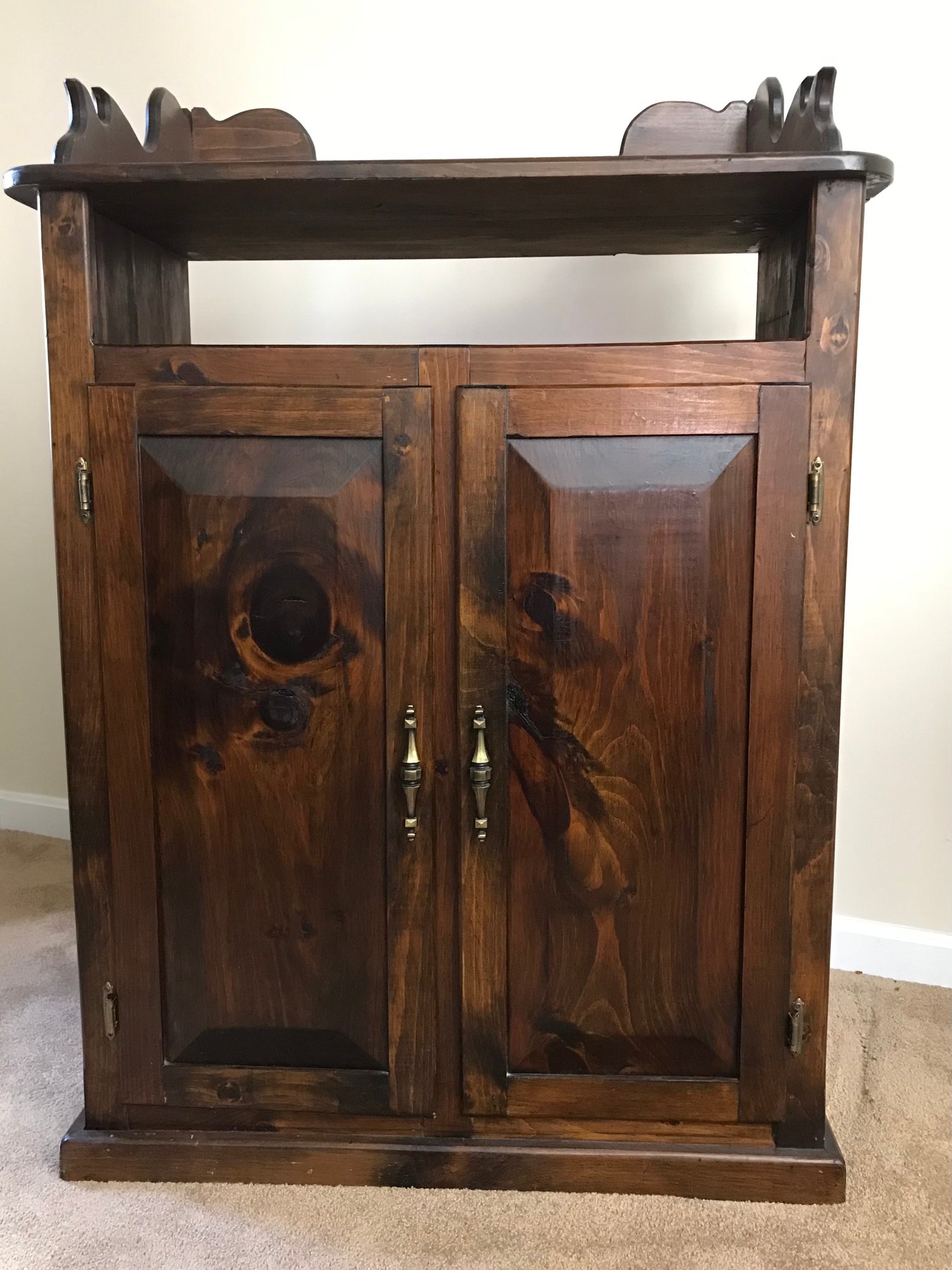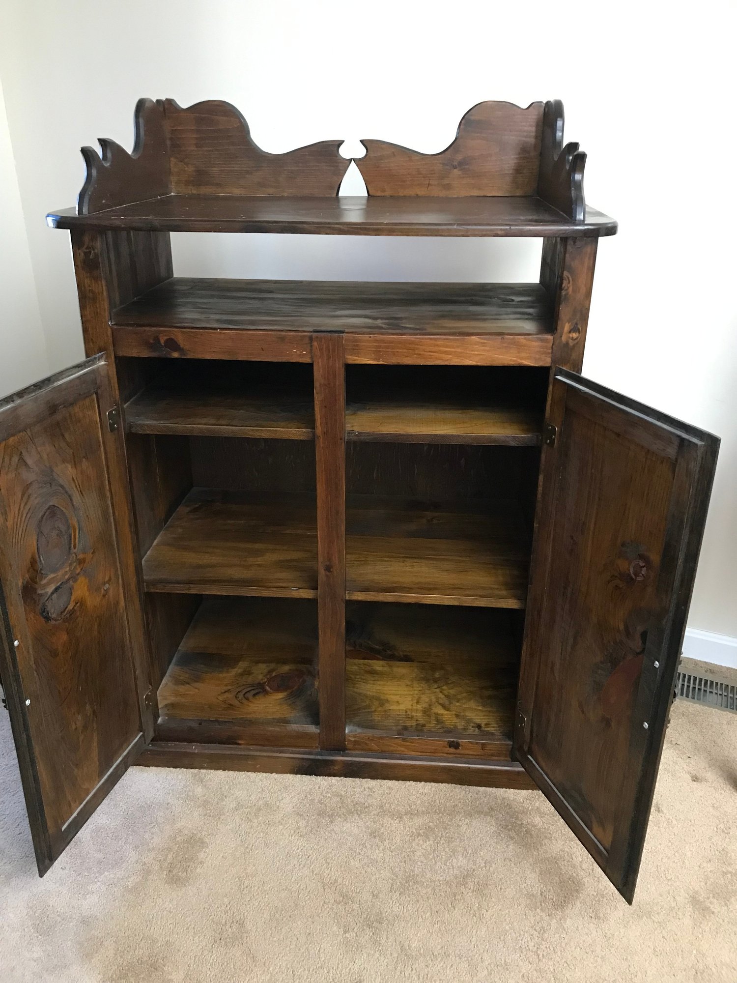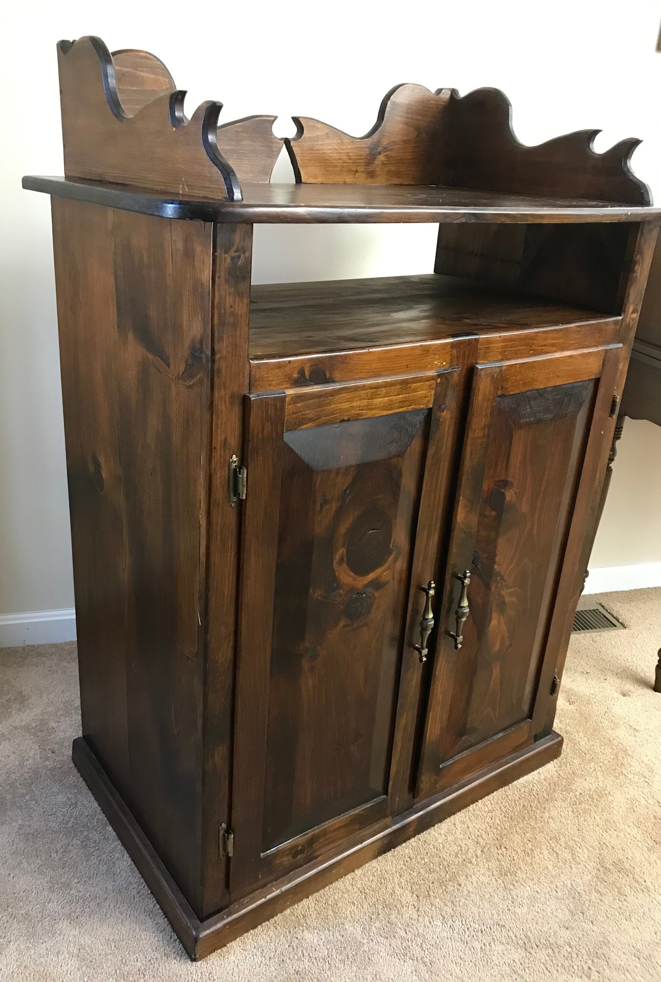Features a decorative scalloped gallery top (dry sink style) over an open storage shelf. The lower cabinet features two raised-panel doors with decorative brass-tone pulls, opening to reveal a divided interior with four fixed shelves.