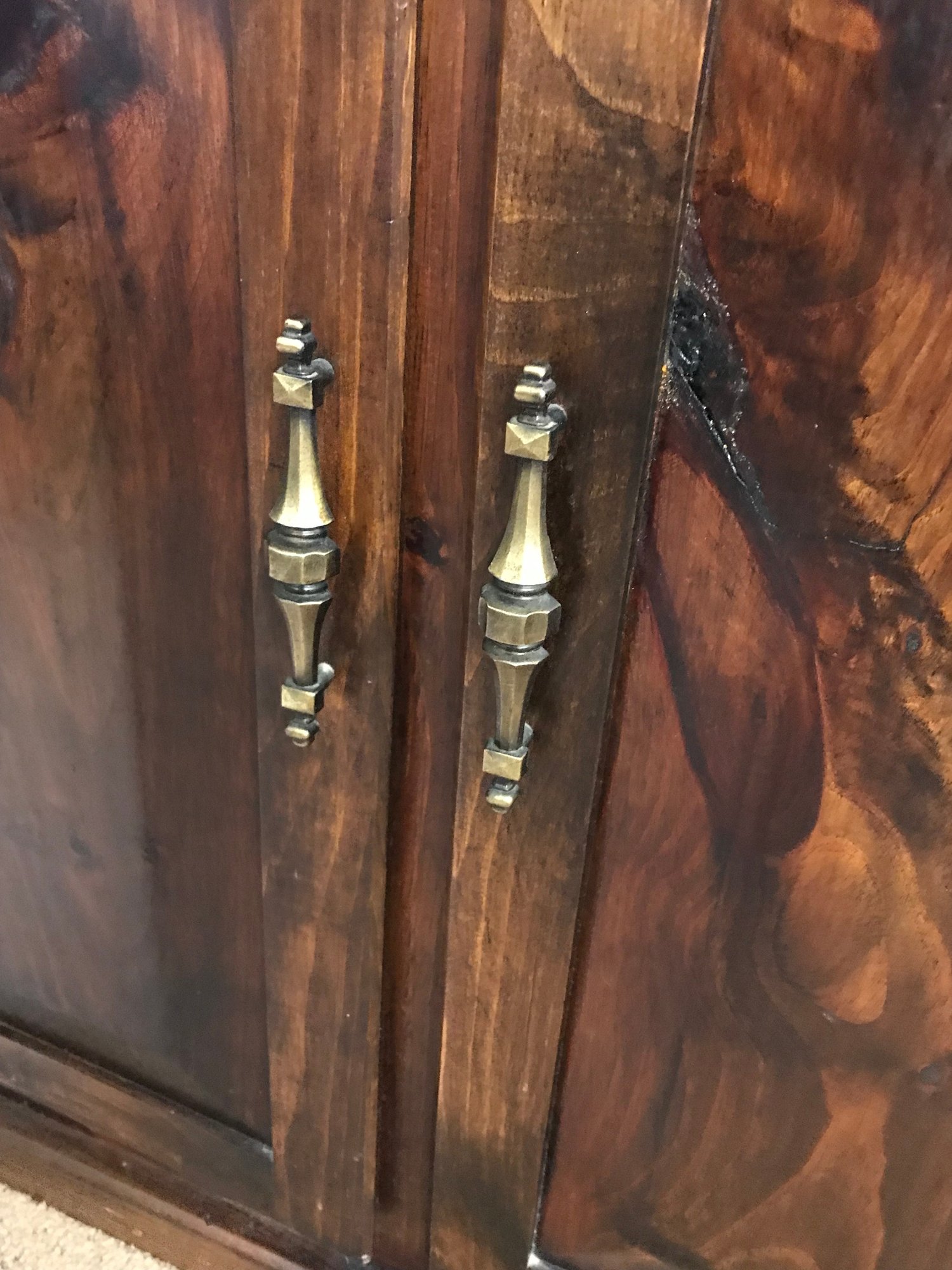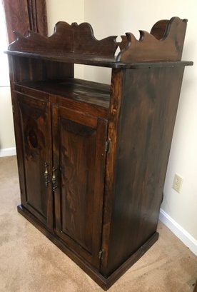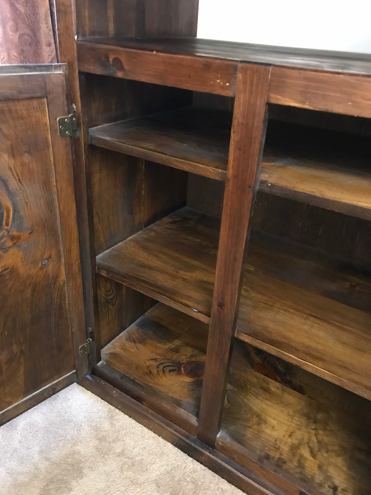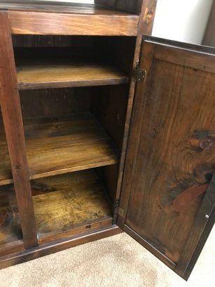This is a rustic, country-style piece with a unique character. The heavy knotting in the wood and the construction style—specifically the plywood back and exposed nail heads visible in the side profile—suggest it is a well-crafted home-built or artisan piece rather than a mass-produced factory item.