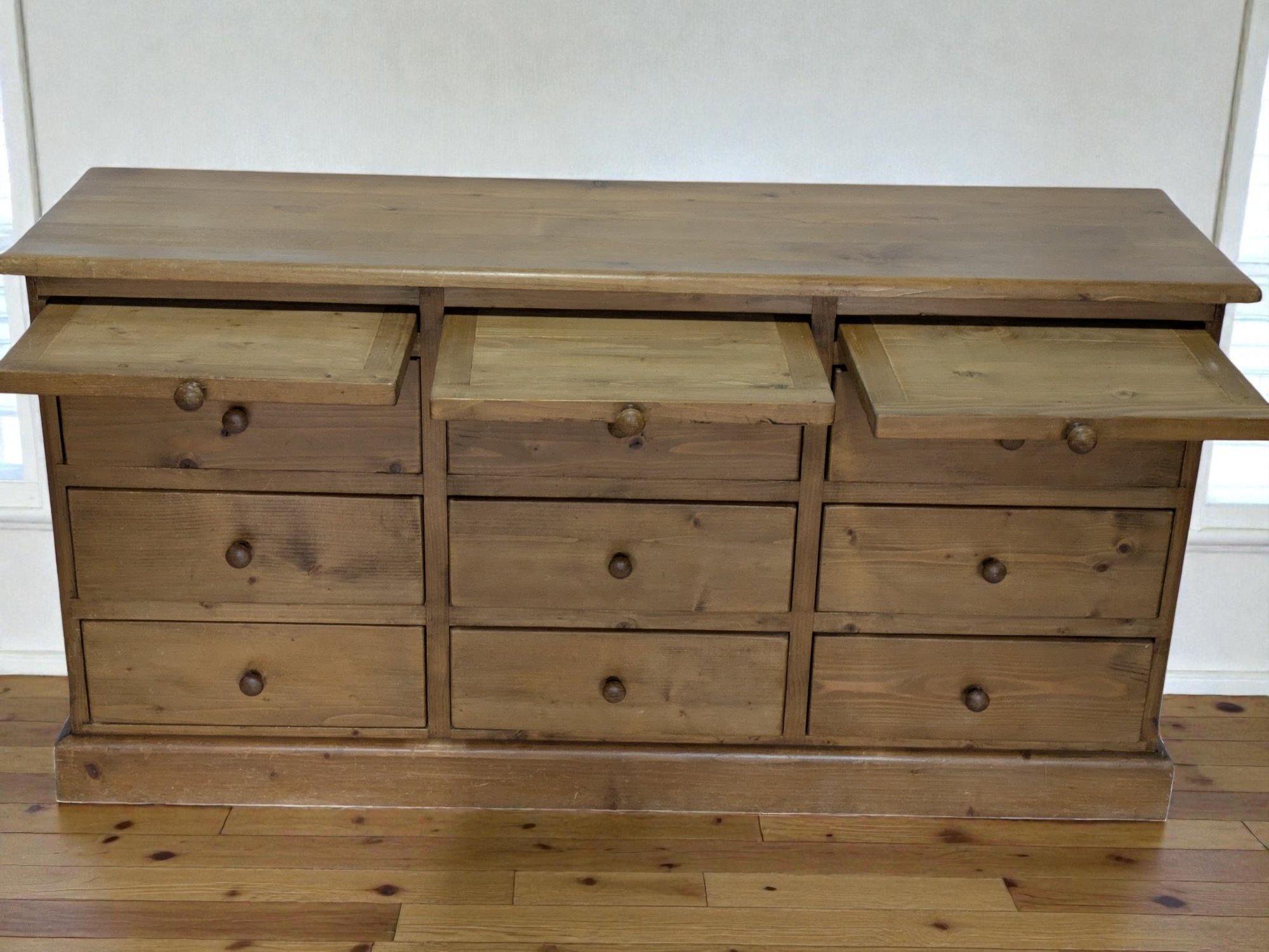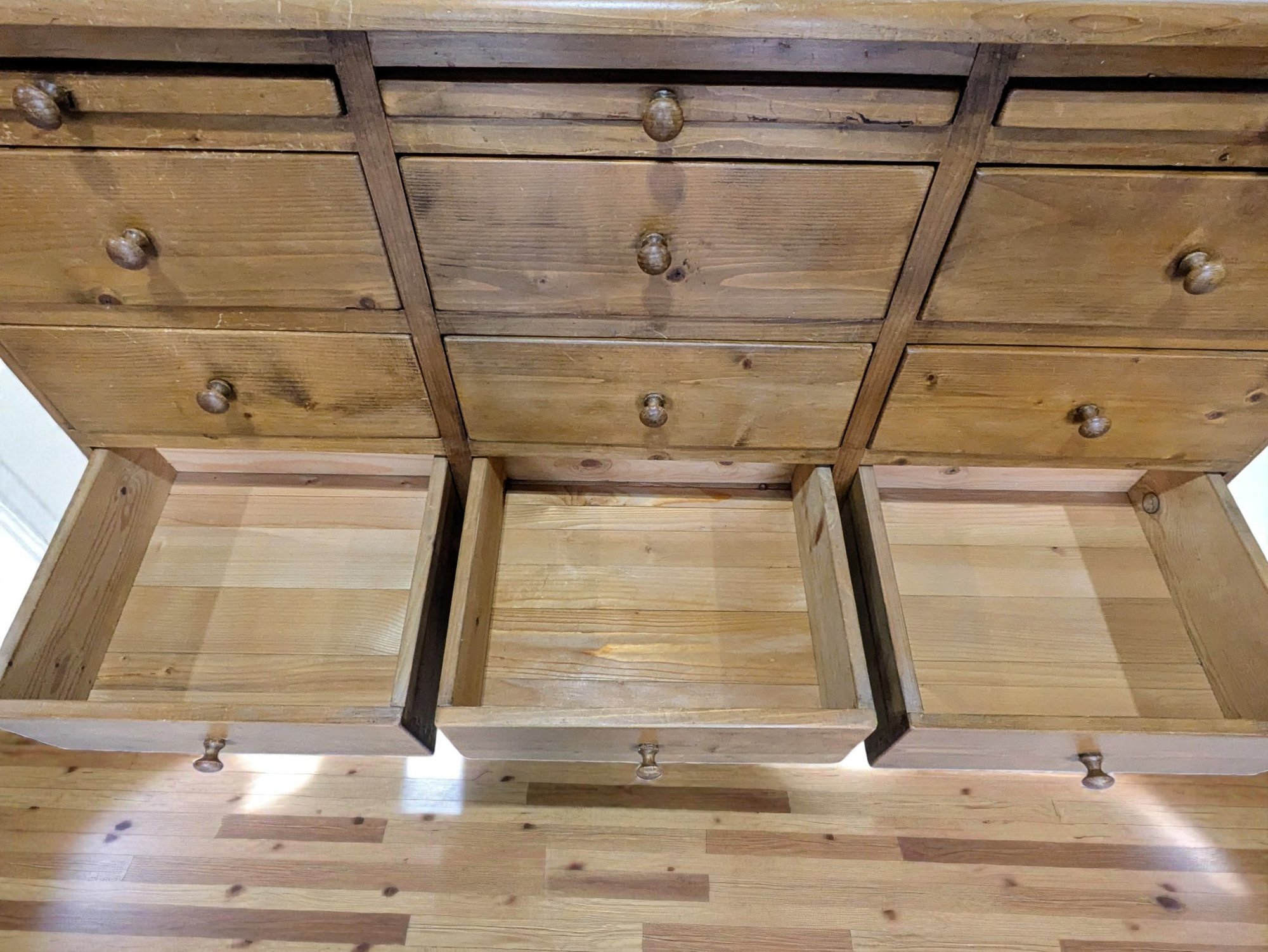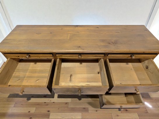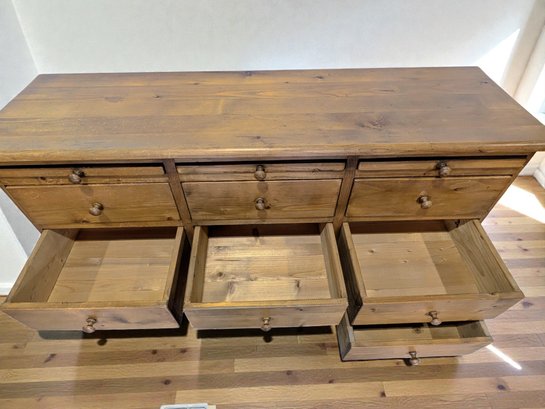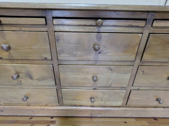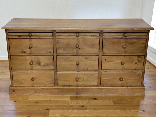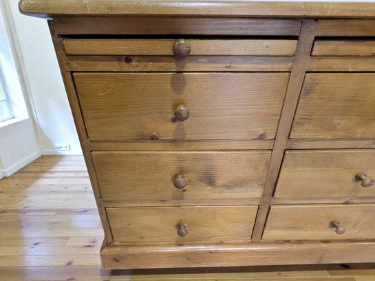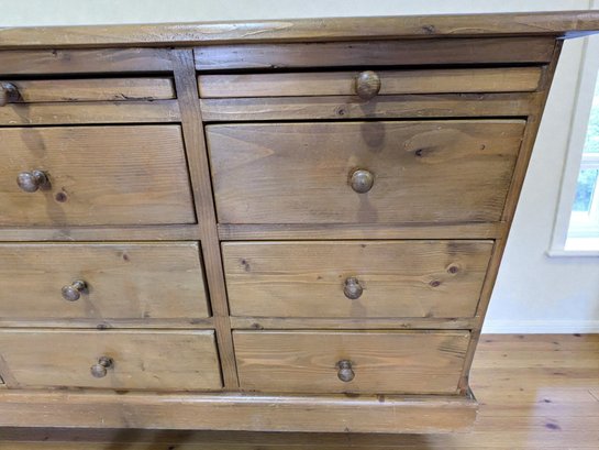 Features 9 Drawers and 3 Pull-Out Shelves. Crafted of Solid Pine with a Matte Finish and Wood Drawer Pulls. Marks and Wear Consistent with Age and Use. Overall, Very Good Condition. Please see all the photos as part of the description and condition. 61.5"W x 31"H x 18.5"D