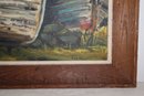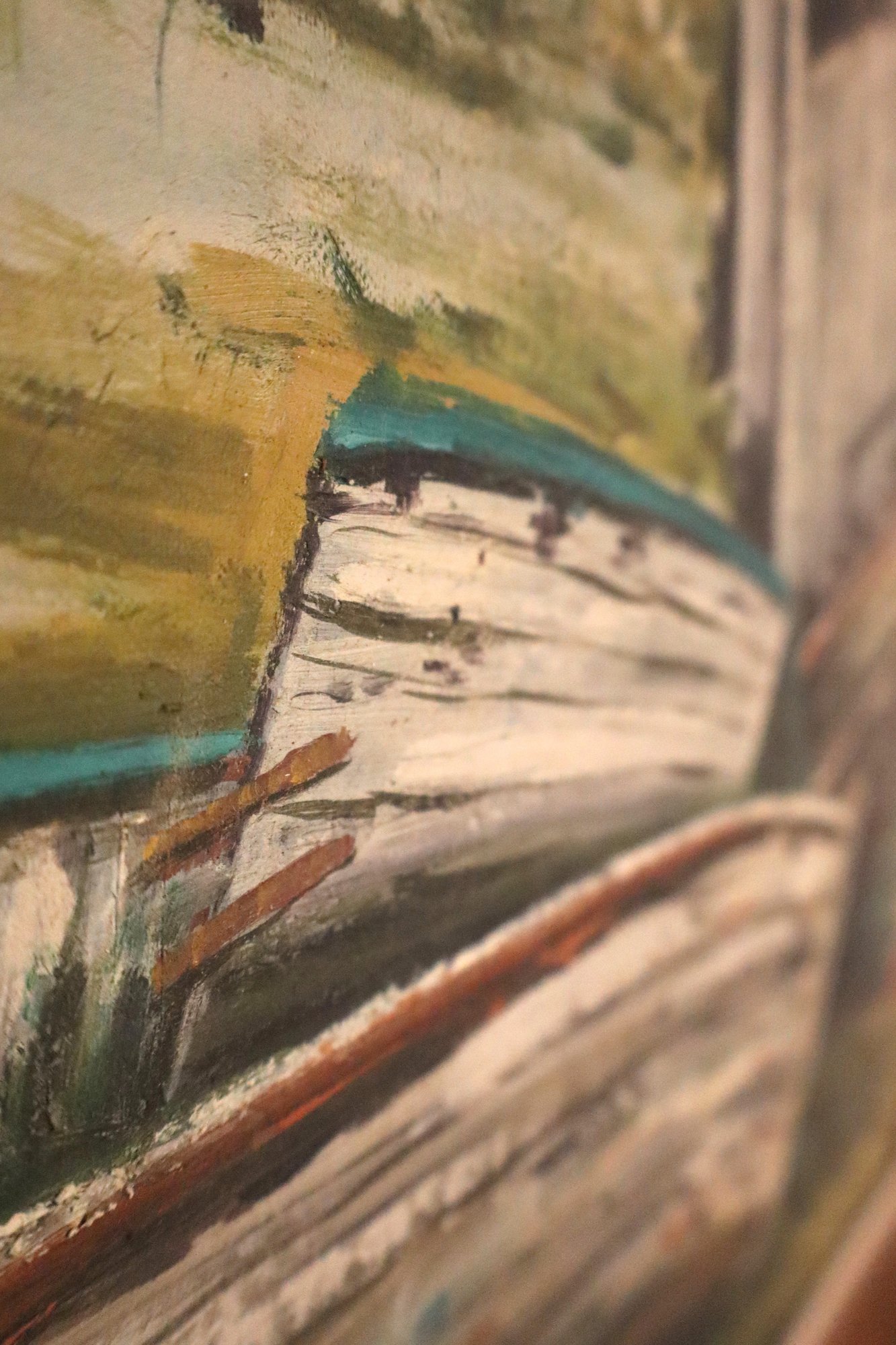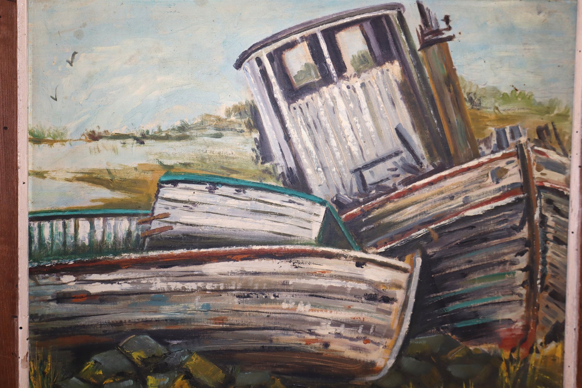 Depicts abandoned boats/boat graveyard on a rocky shore within a marshland setting
