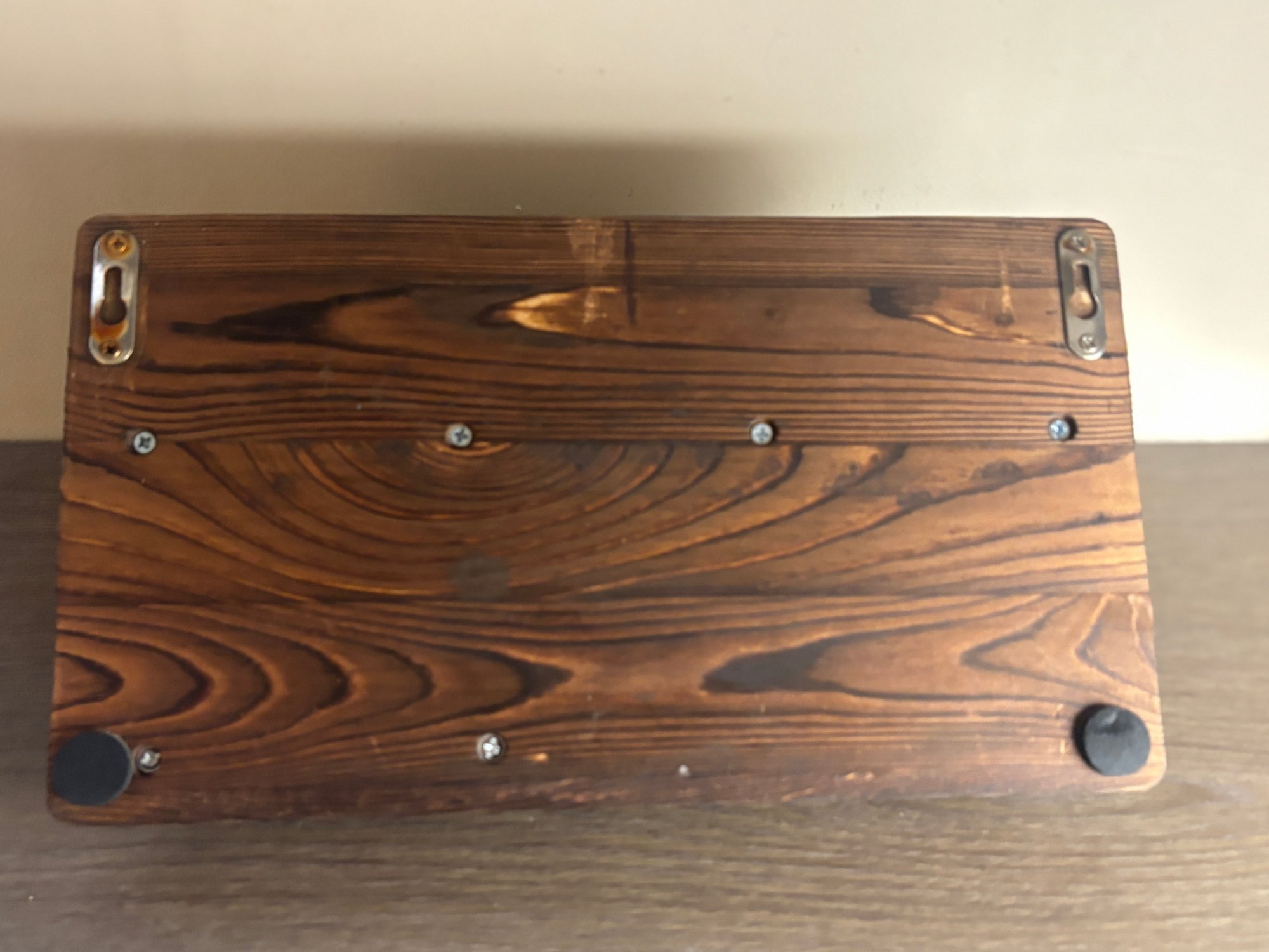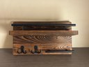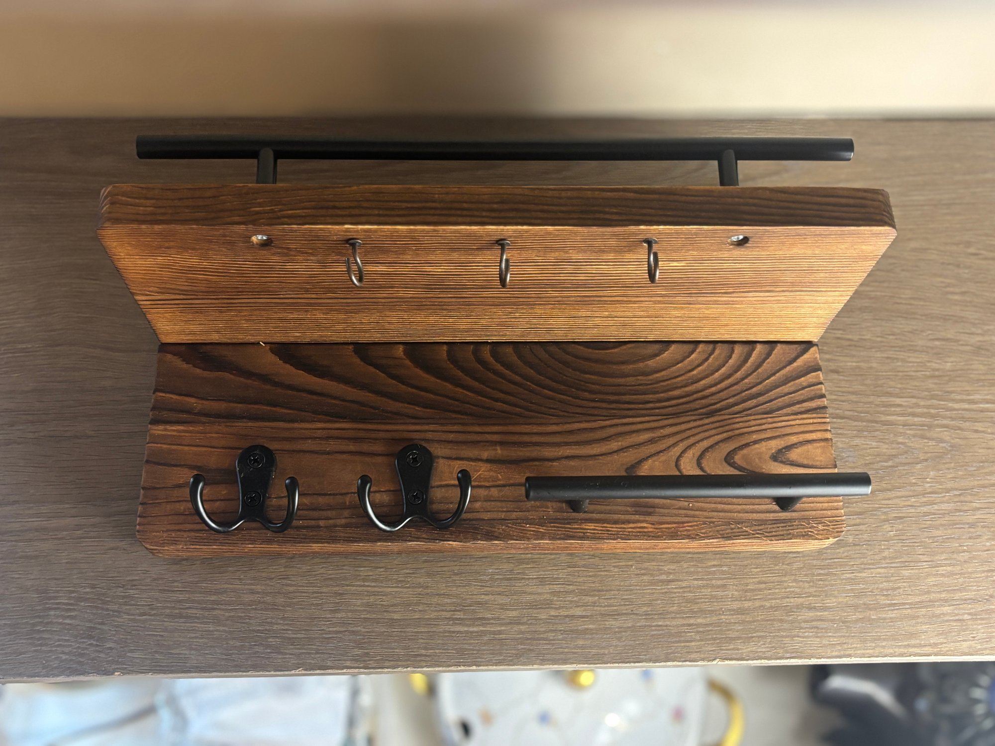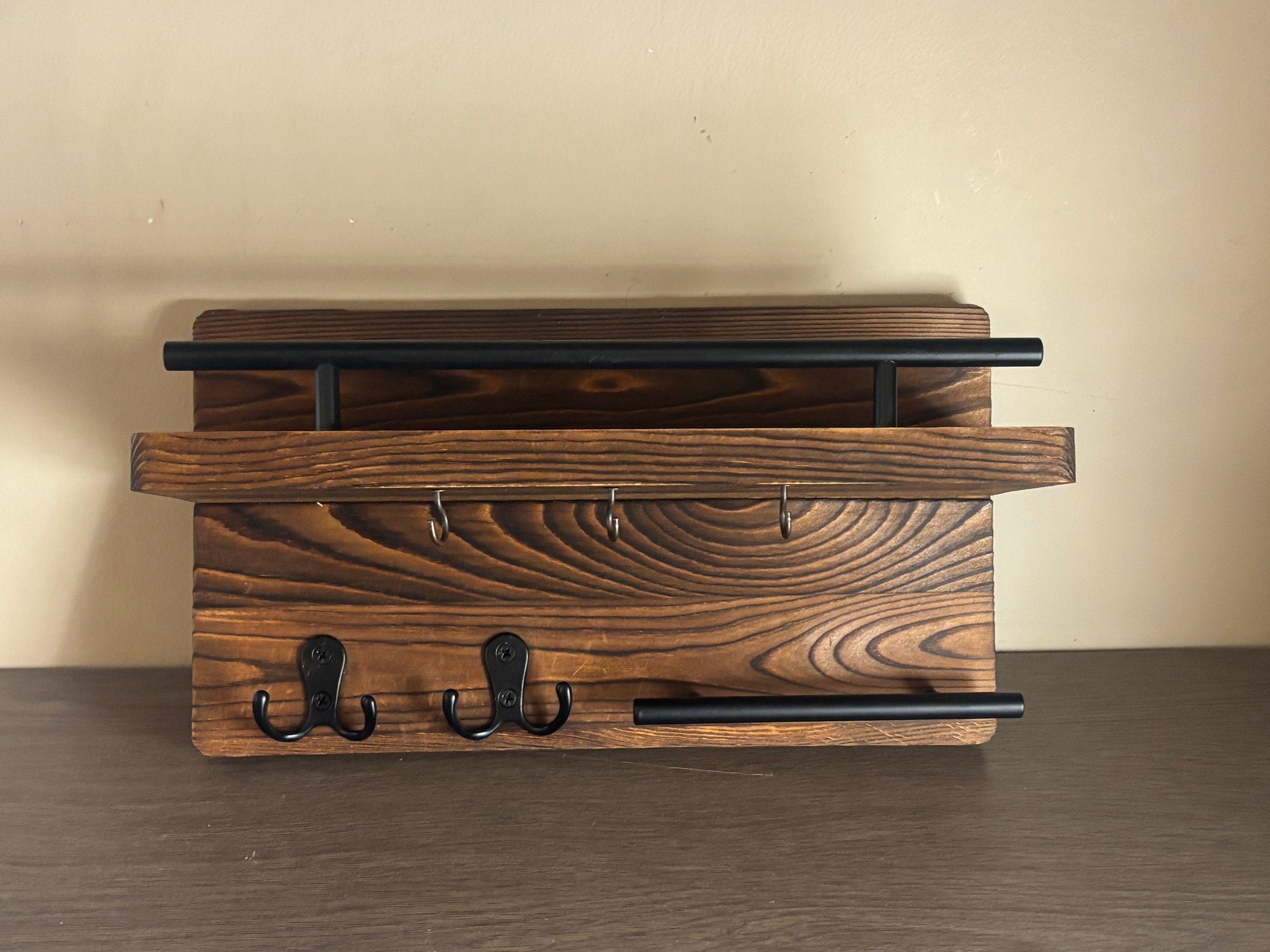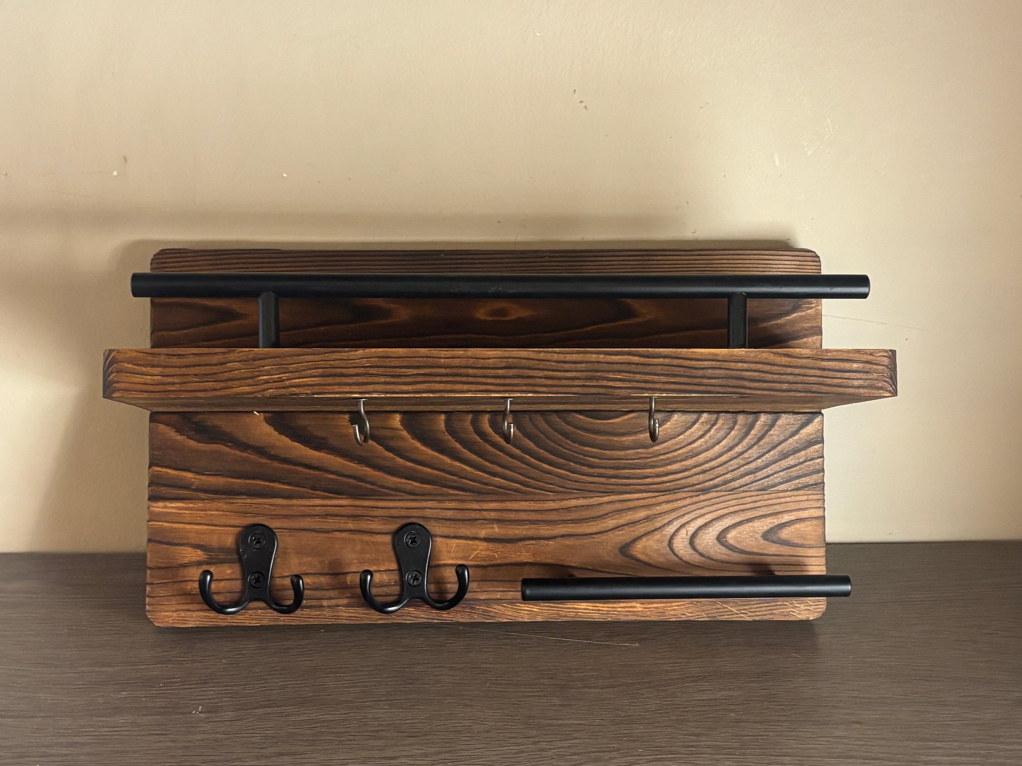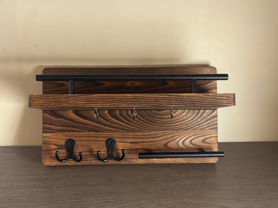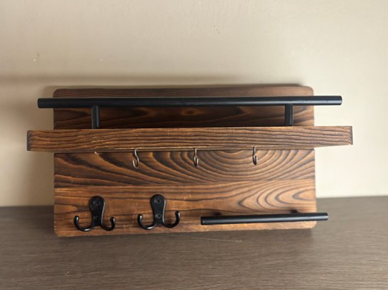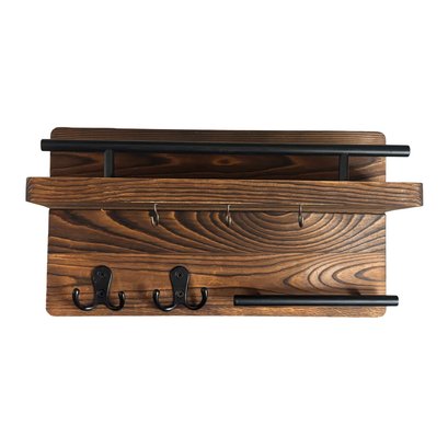 Solid wood wall-mounted organizer with rich grain and a warm stained finish, paired with matte black metal accents. Features an upper display shelf, front rail, three small hanging hooks beneath the shelf, two double coat hooks, and a lower horizontal bar ideal for keys. A versatile storage piece that works equally well in entryways, kitchens, bathrooms, or mudrooms, blending farmhouse warmth with industrial-style hardware.