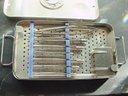 S&T Microsurgical forceps, sterilization holder and stainless case & catalog, high quality and very expensive microsurgical equipment. 7 forceps with catalog number shown, a small case with micro clips of some sort, a sterilizable holder and case both shown in accompanying catalog .