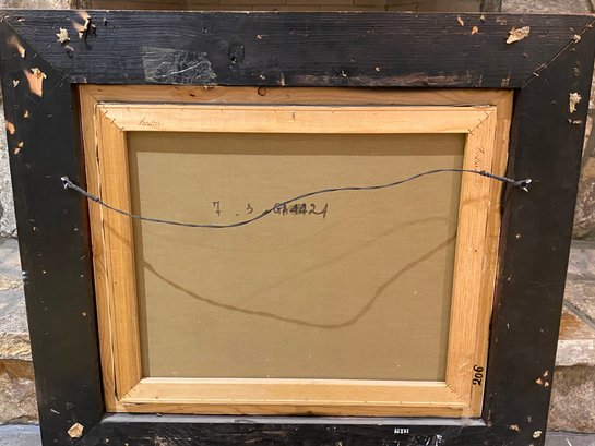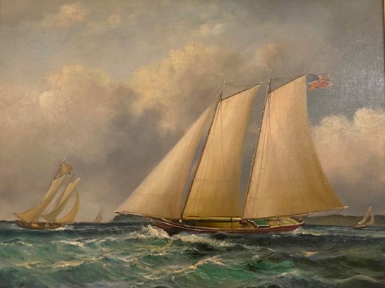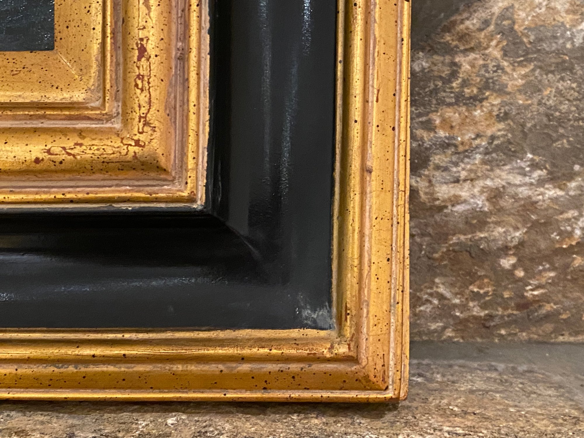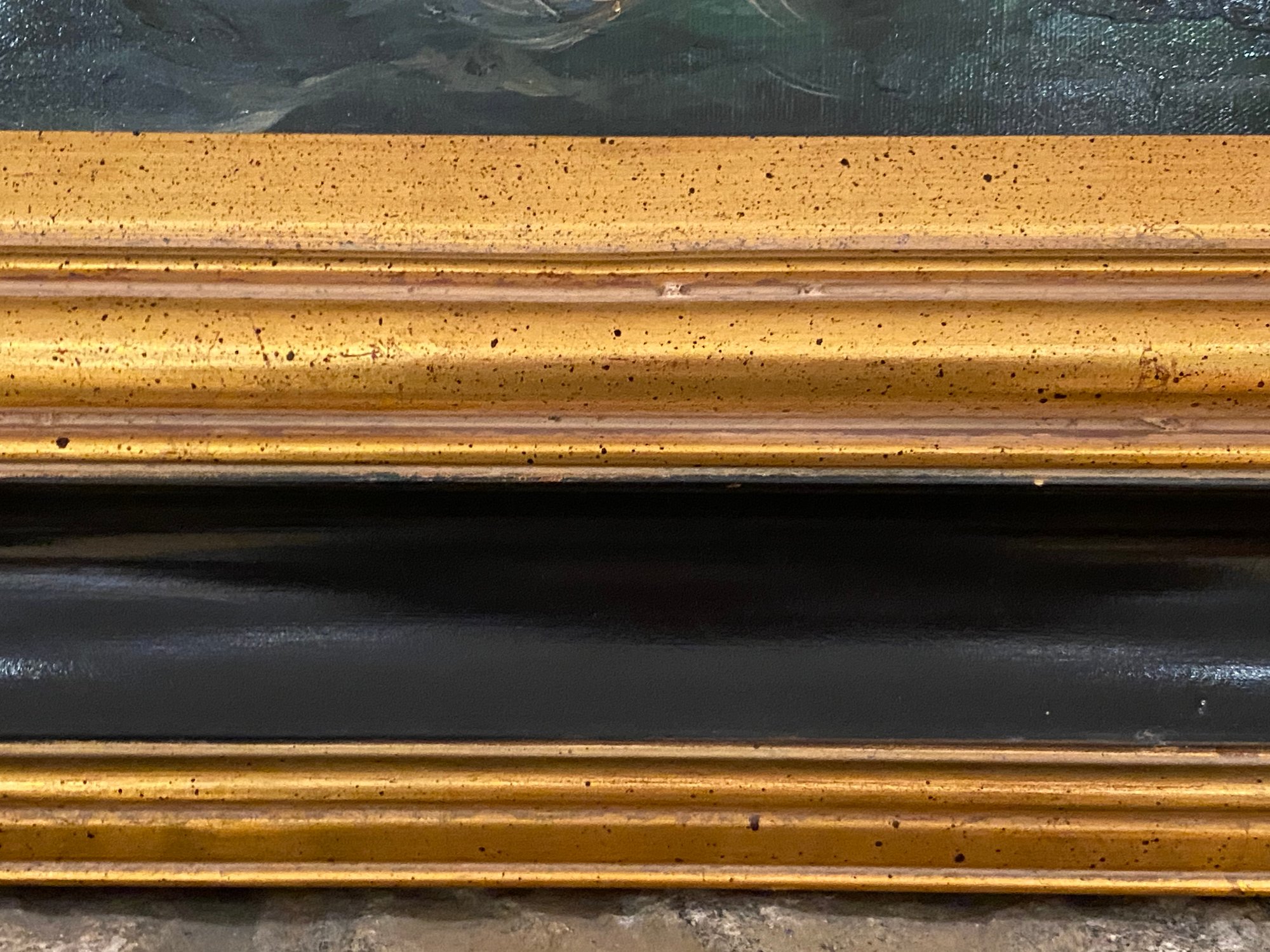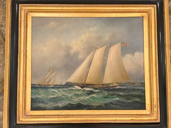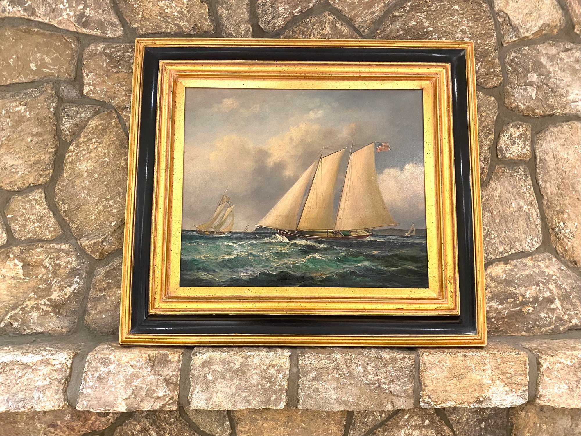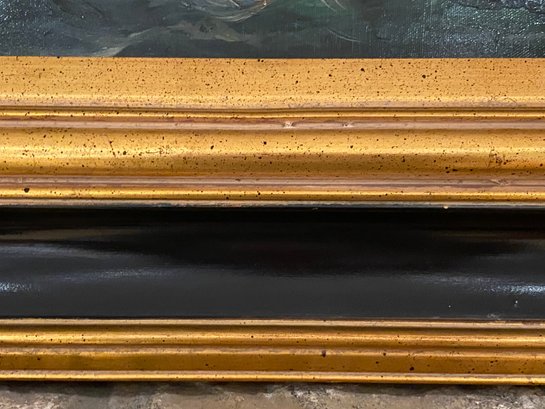 Moody sailing scene in heavy wood black frame with gilt border detail