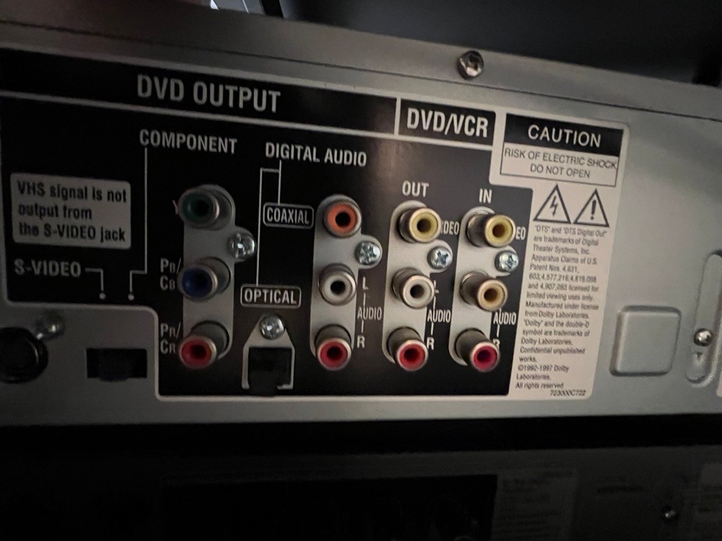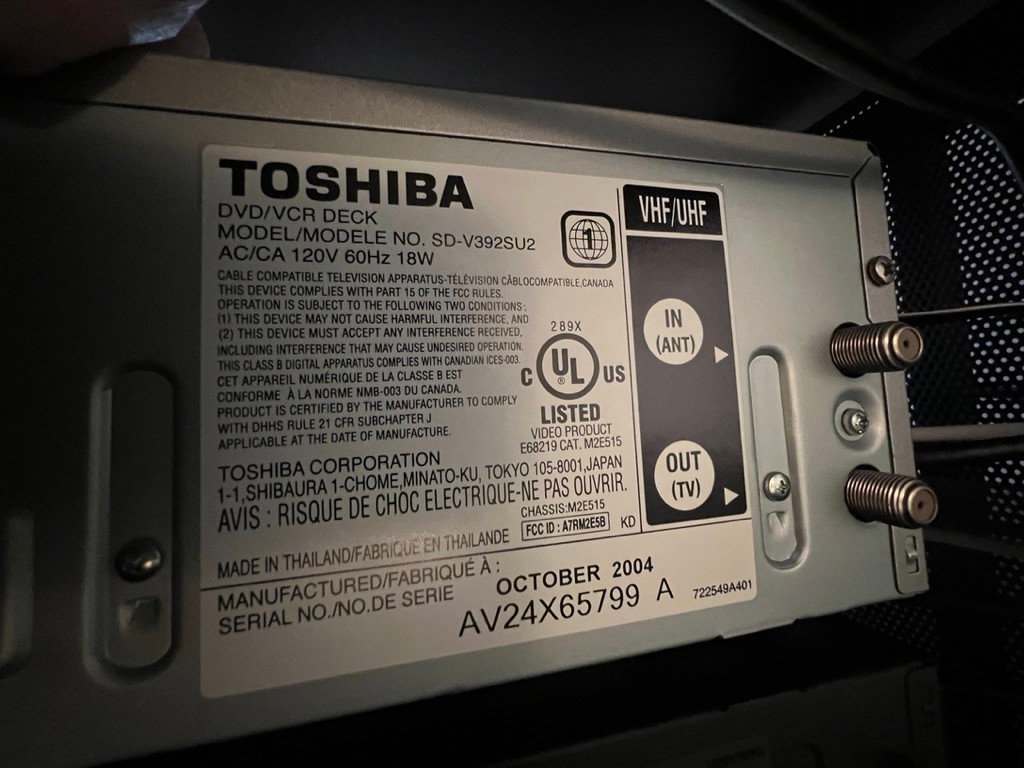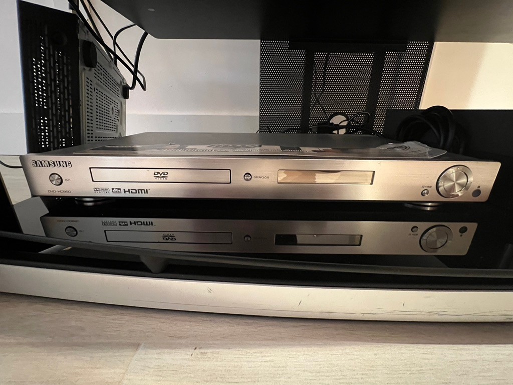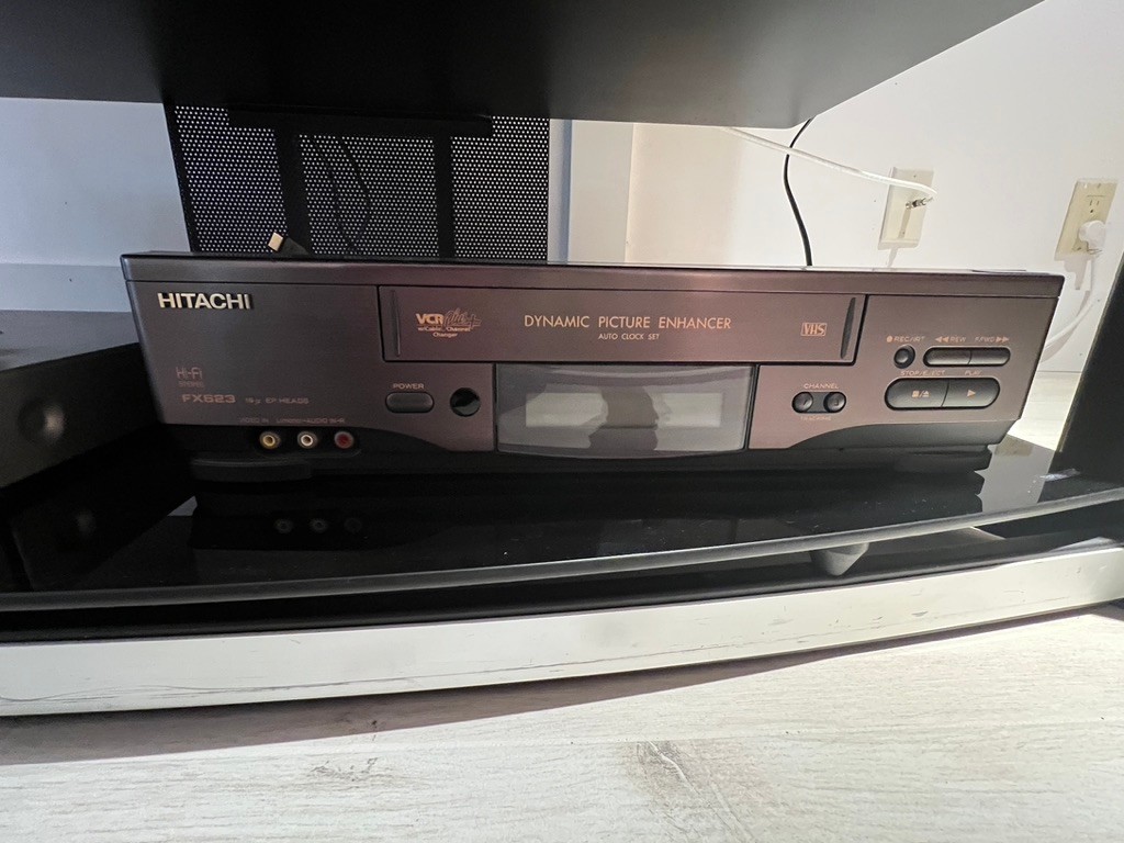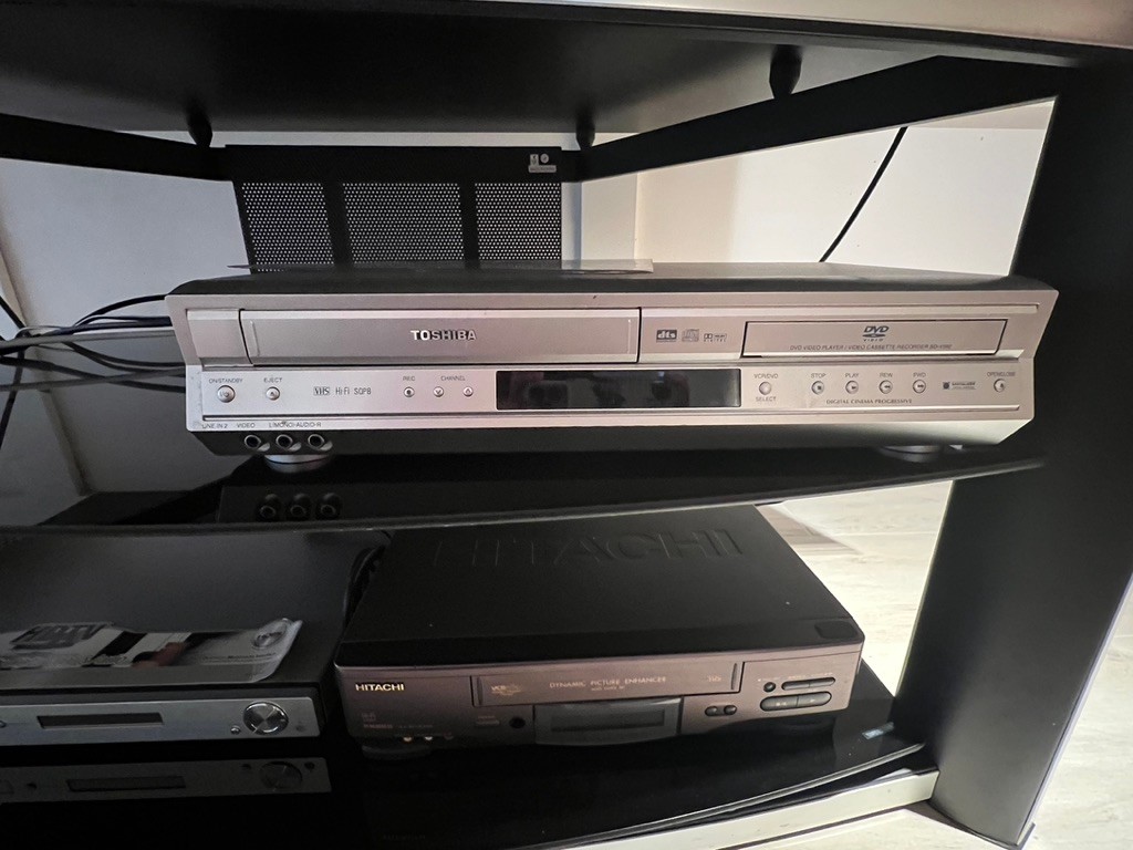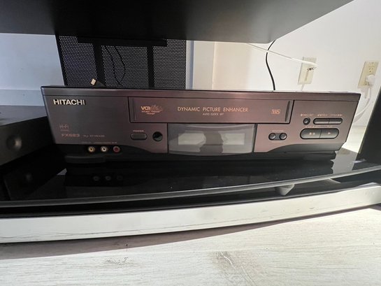 Samsung DVD, Hitachi VCR, Toshiba DVD, all in very good working order, w/remote, shelves and or glass and metal tv stand sold separately in this sale