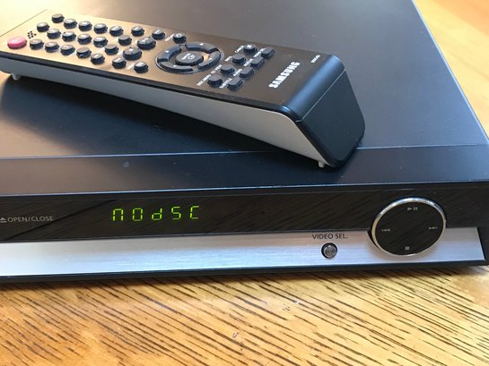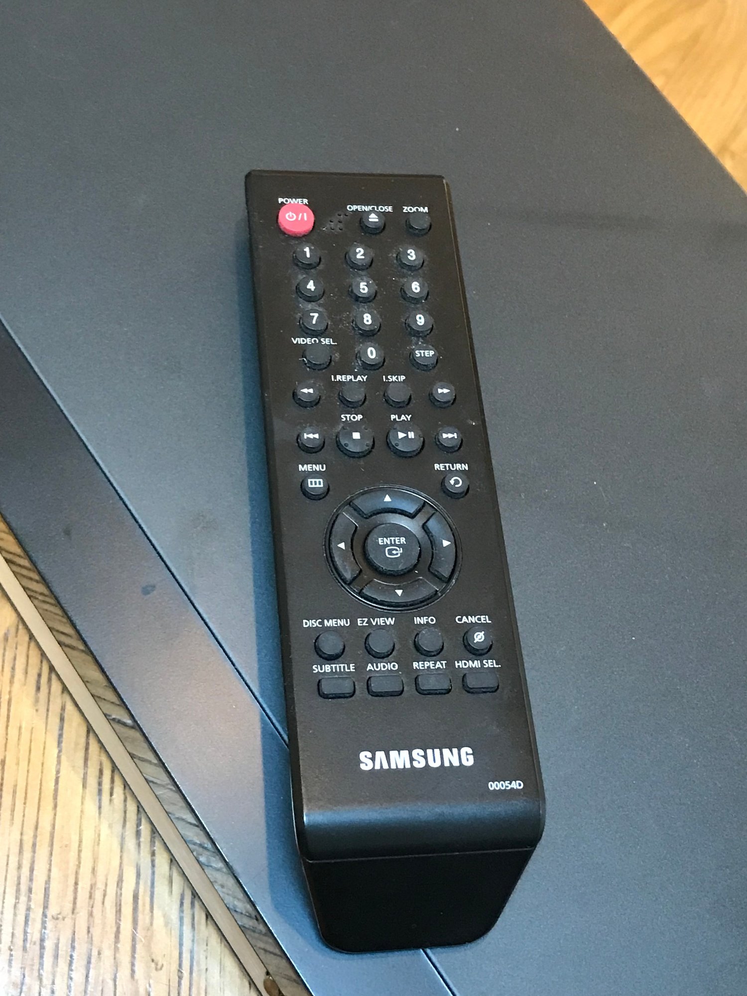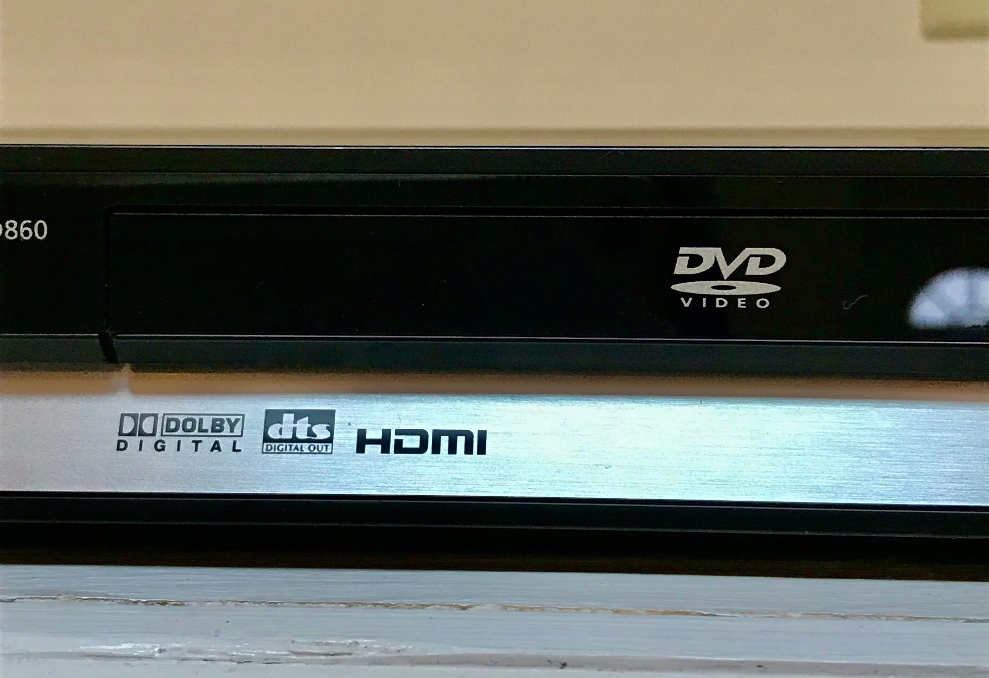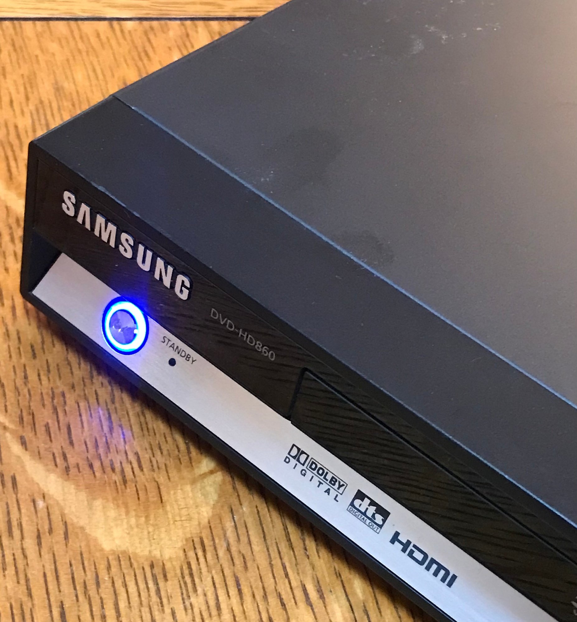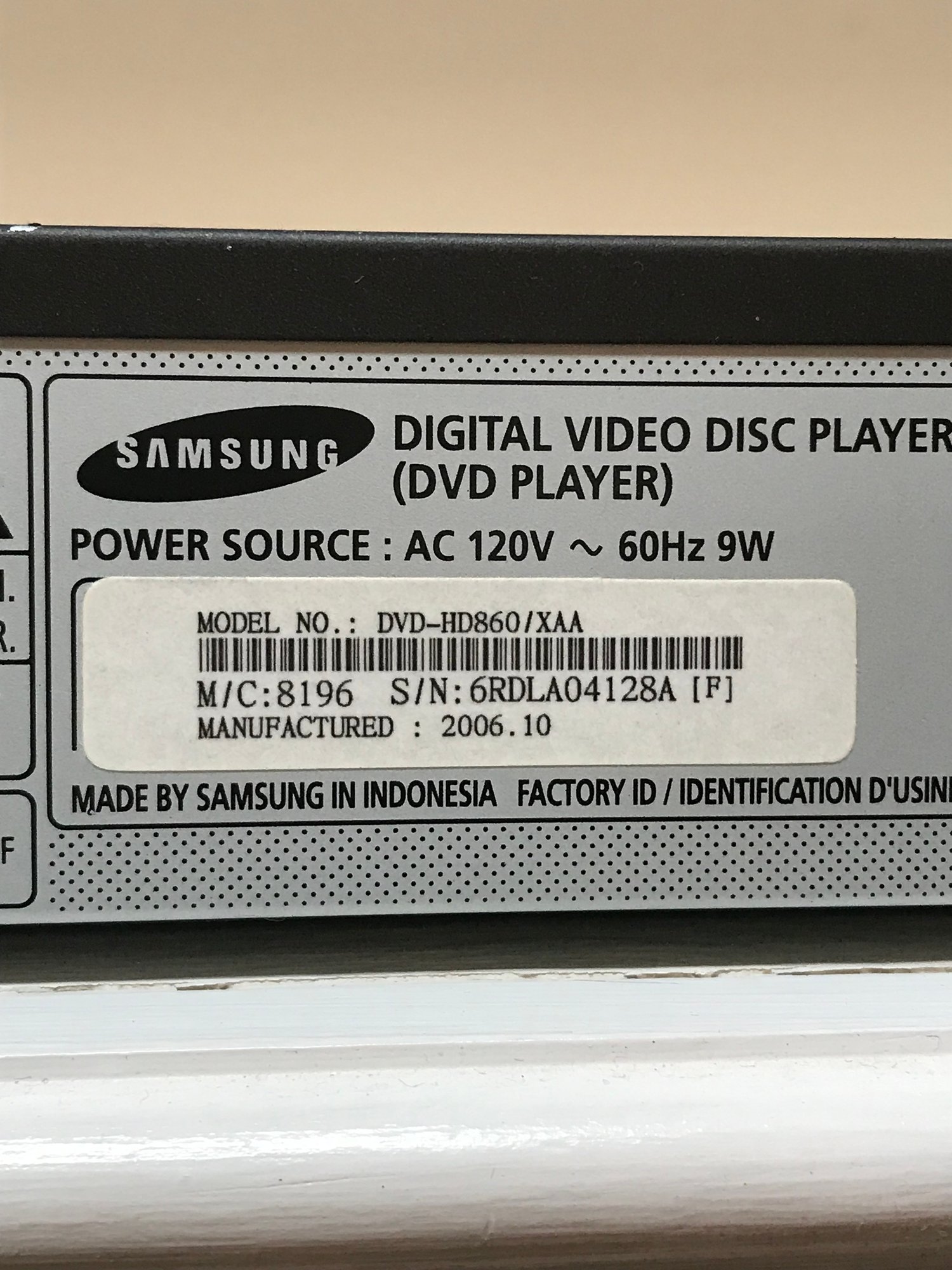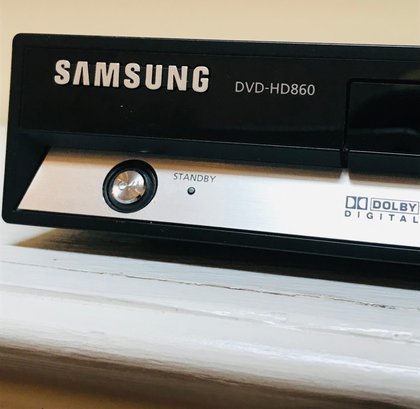 Samsung DVD-HD860 Player: Includes the original remote control and features a front-loading tray with a sleek black and silver finish.