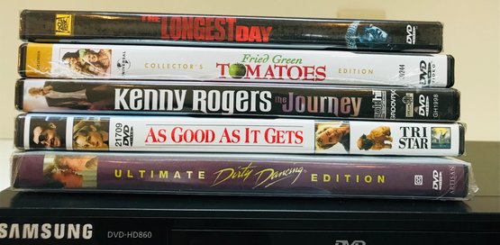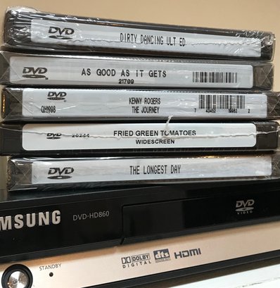 Upgrade your home entertainment setup with this versatile media bundle featuring a Samsung DVD-HD860 High-Definition DVD Player and a diverse collection of 15 DVD titles some new! This player is known for its slim profile and HDMI output, designed to enhance standard DVDs to higher resolutions.