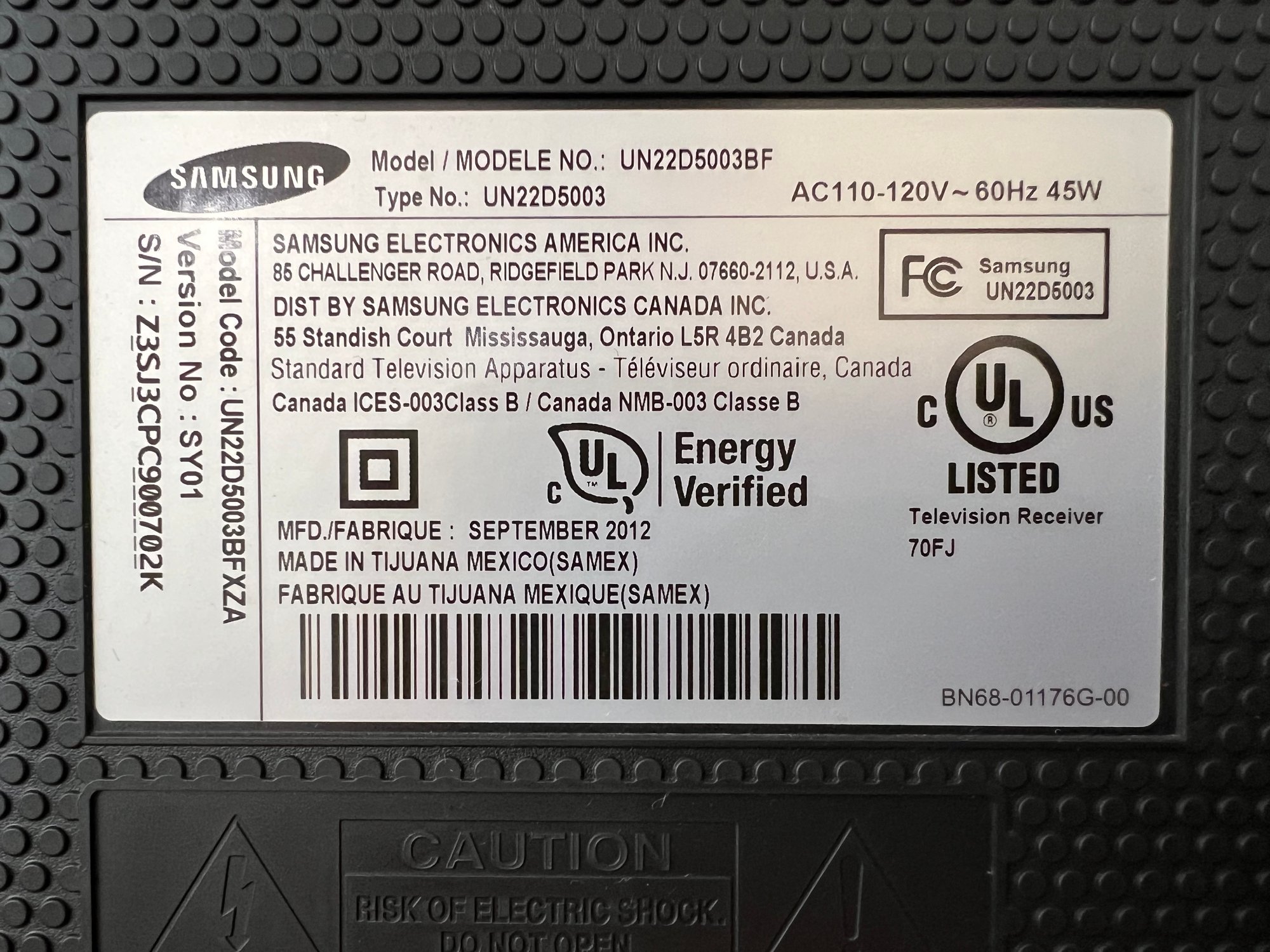 Model # UN22D5003BF