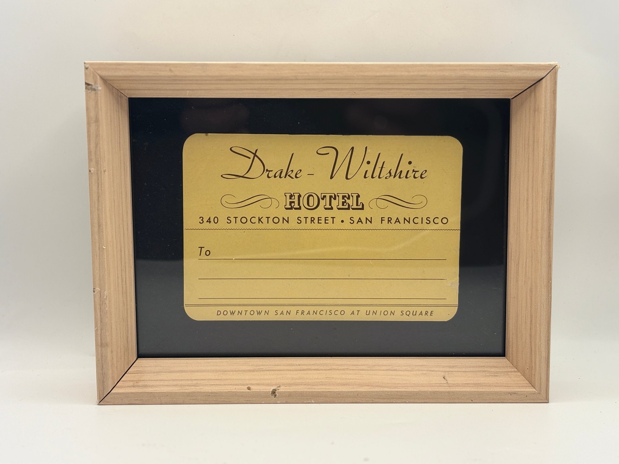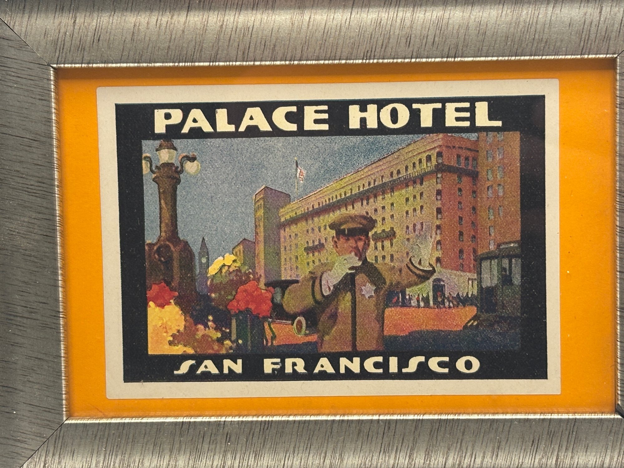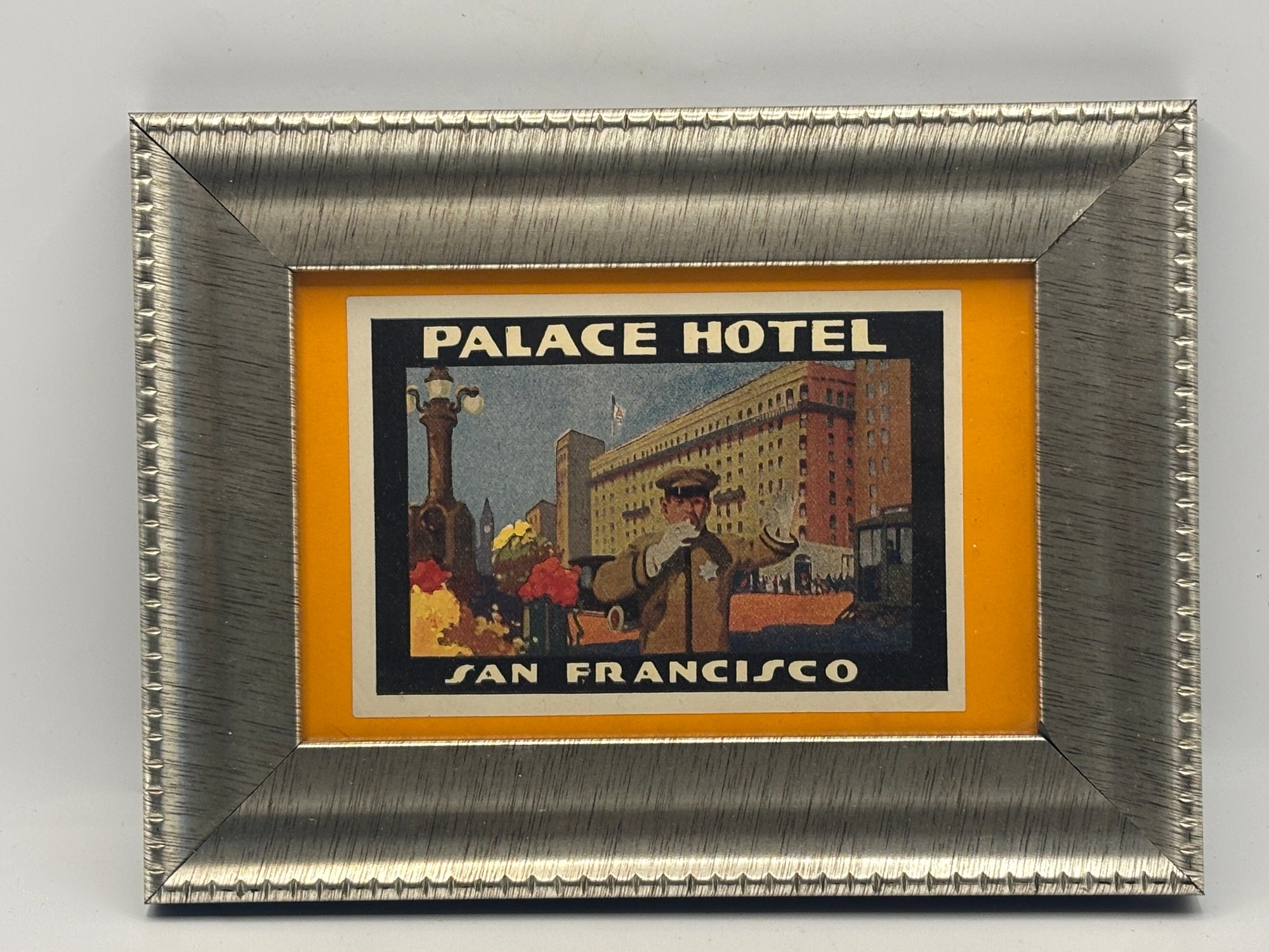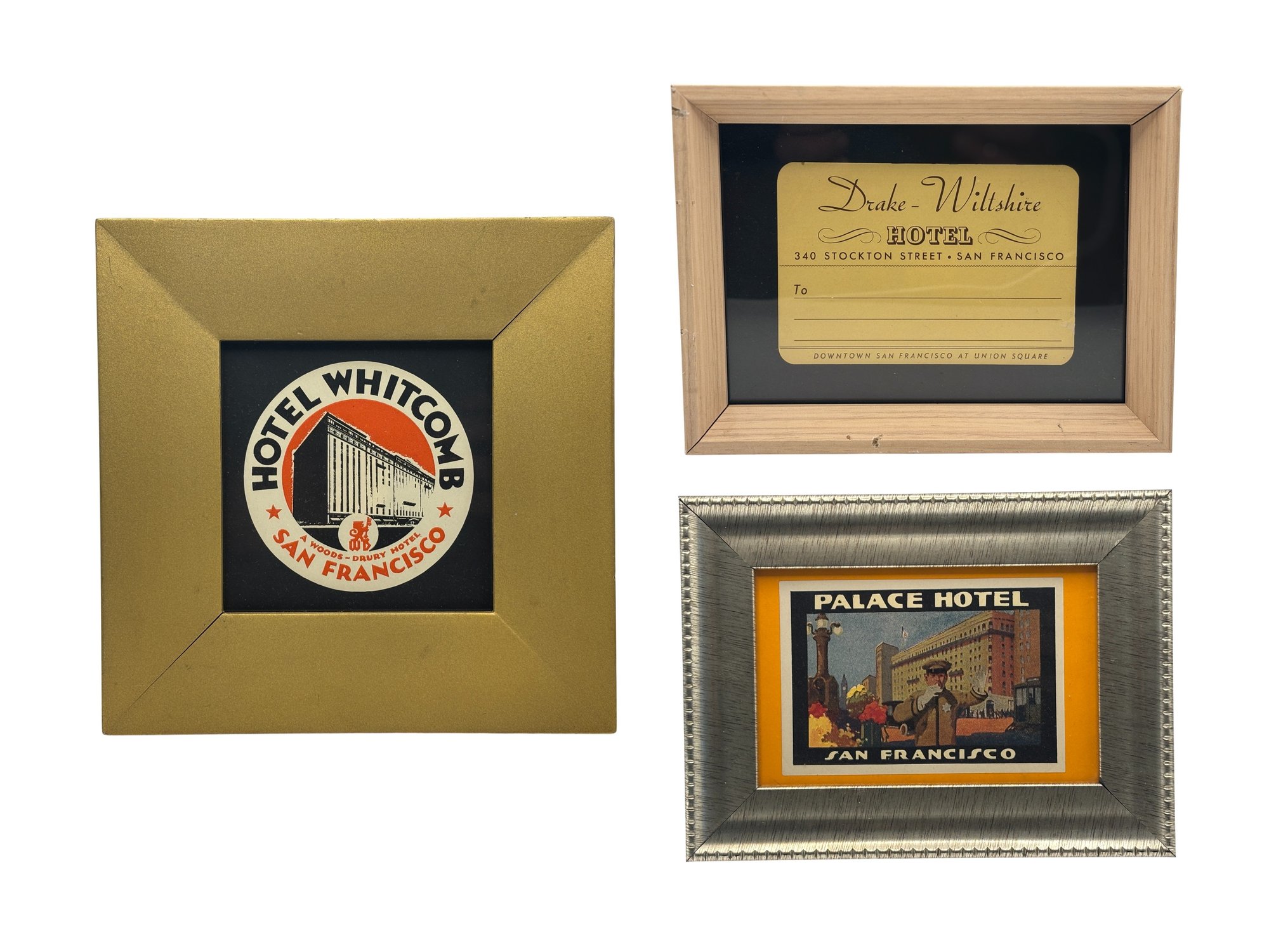 Included in the group are striking examples from the Hotel Whitcomb, the legendary Palace Hotel, and the Drake–Wiltshire Hotel, all prominent destinations in San Francisco’s historic downtown hotel scene. The trio offers a wonderful mix of styles: a circular architectural graphic, a richly illustrated doorman scene, and an elegant typographic label with graceful script.