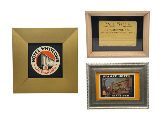 A standout group of three original San Francisco hotel luggage labels, each showcasing bold graphic design and travel prestige from the golden age of American tourism, circa early 20th century. Together, these labels capture the romance of long-distance journeys, grand lobbies, uniformed doormen, and a city welcoming the world.