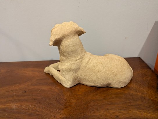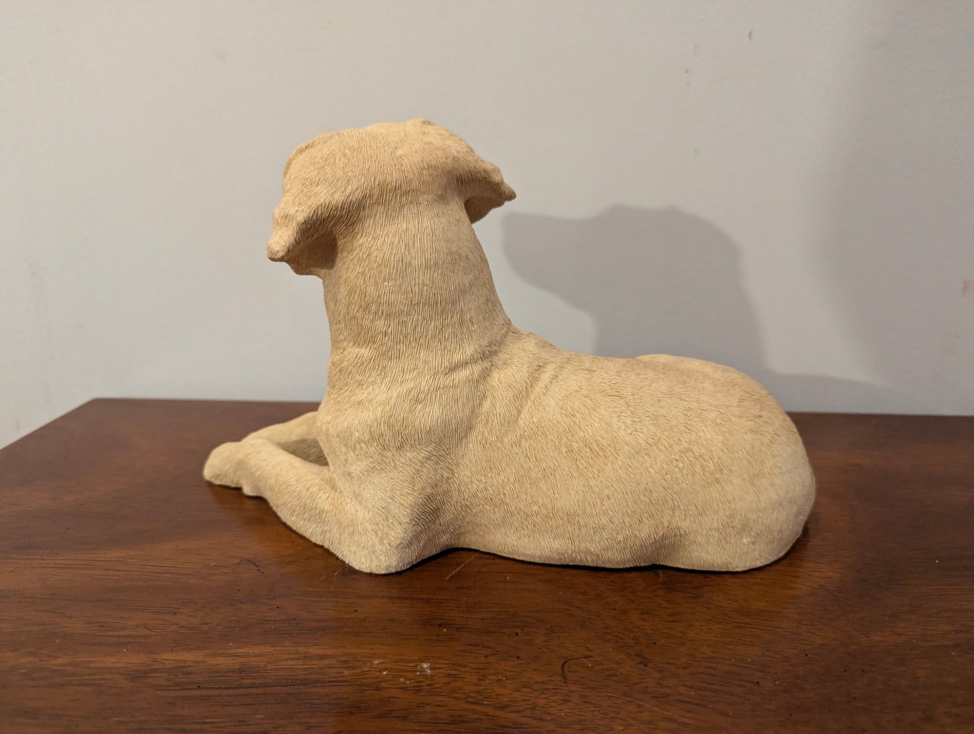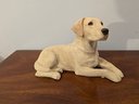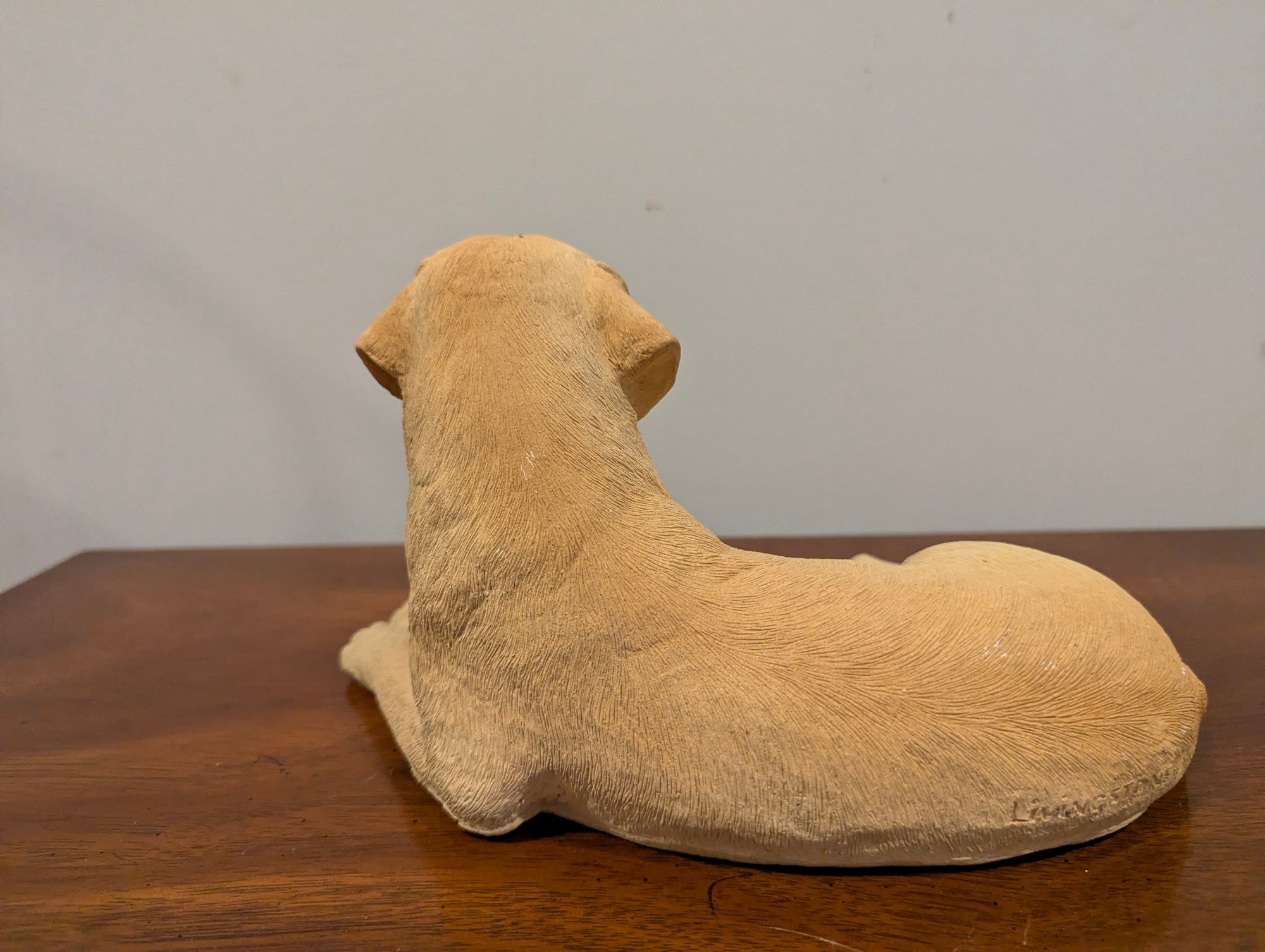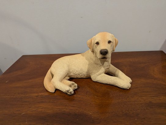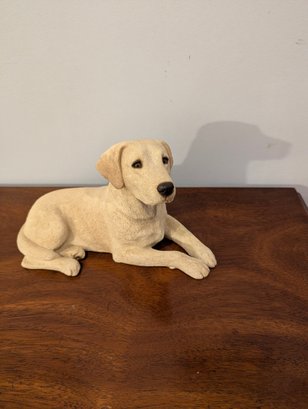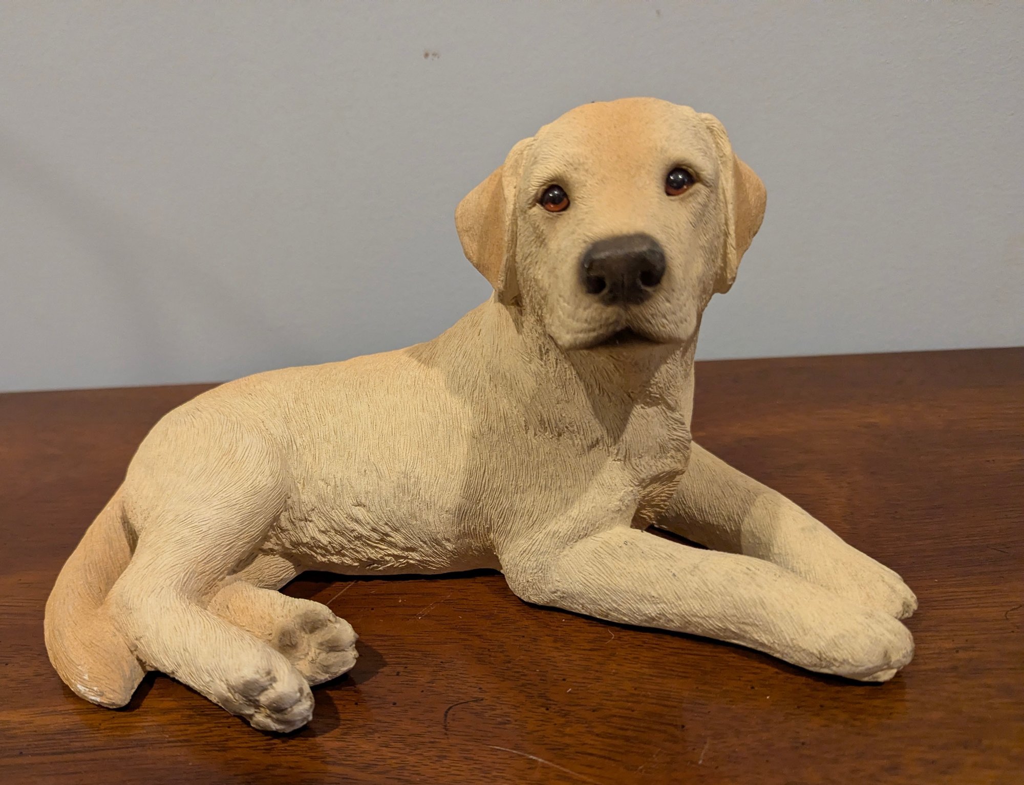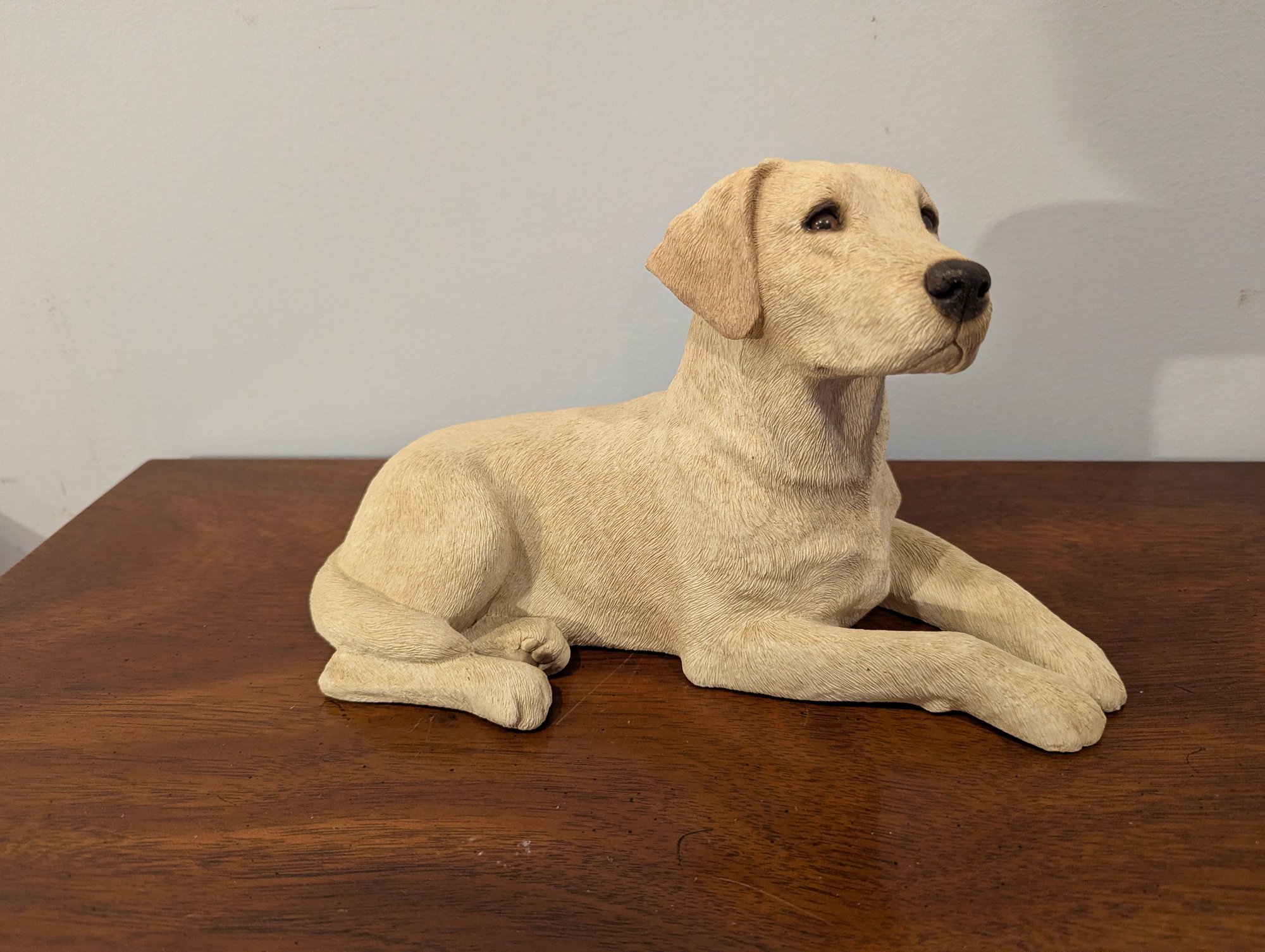 hand-painted vintage sculpture of a Yellow Labrador Retrievers in a resting, "lying down" pose. Produced by Sandicast, a company well-known for its realistic animal sculptures, this piece was designed by the acclaimed artist Sandra Brue, whose signature is cast into the base of the figurine.