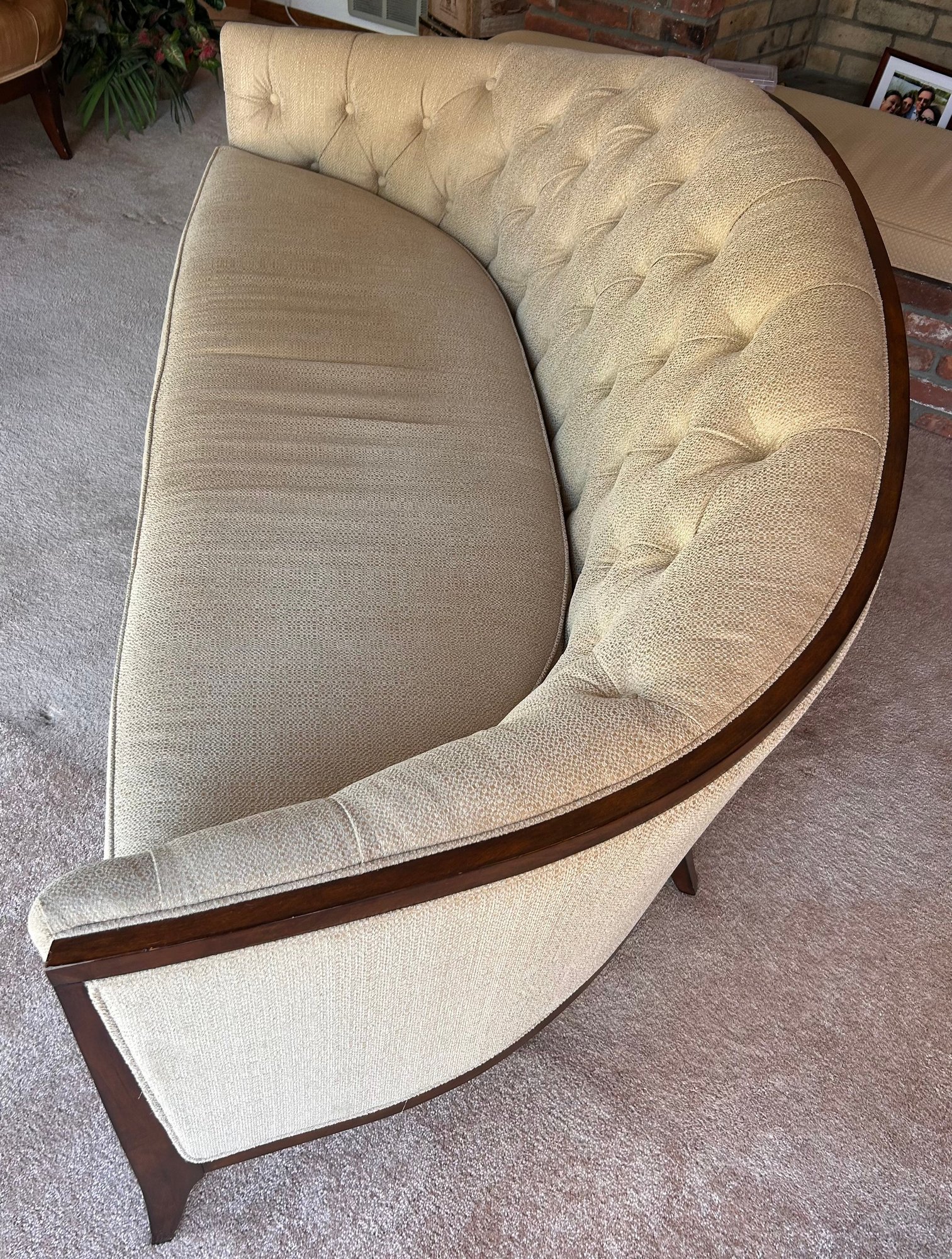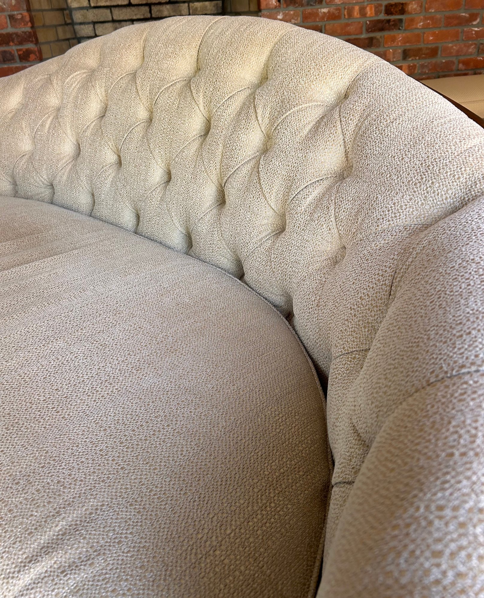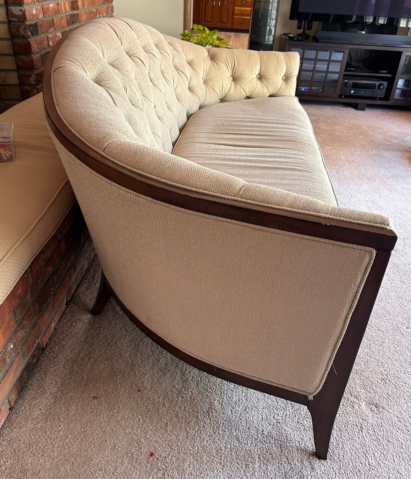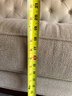 In good used condition, from a smoke and pet free home. The owners took good care of this piece. It measures approximately 87” long, 39” deep (in the middle,) with a seat height of 19.5” and total height of 35.5”.