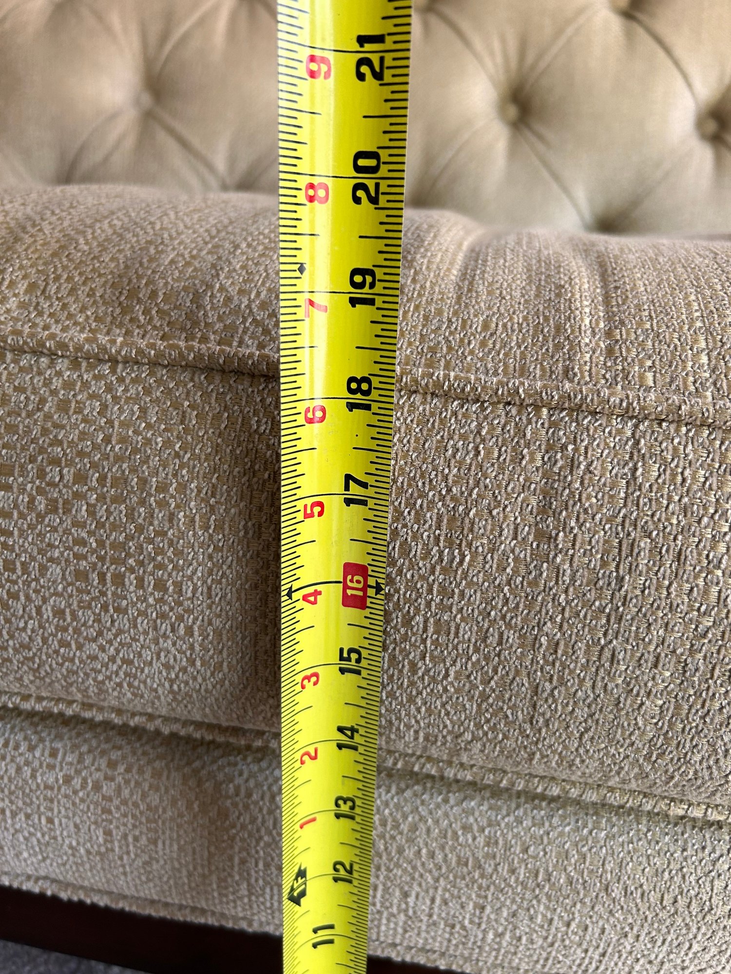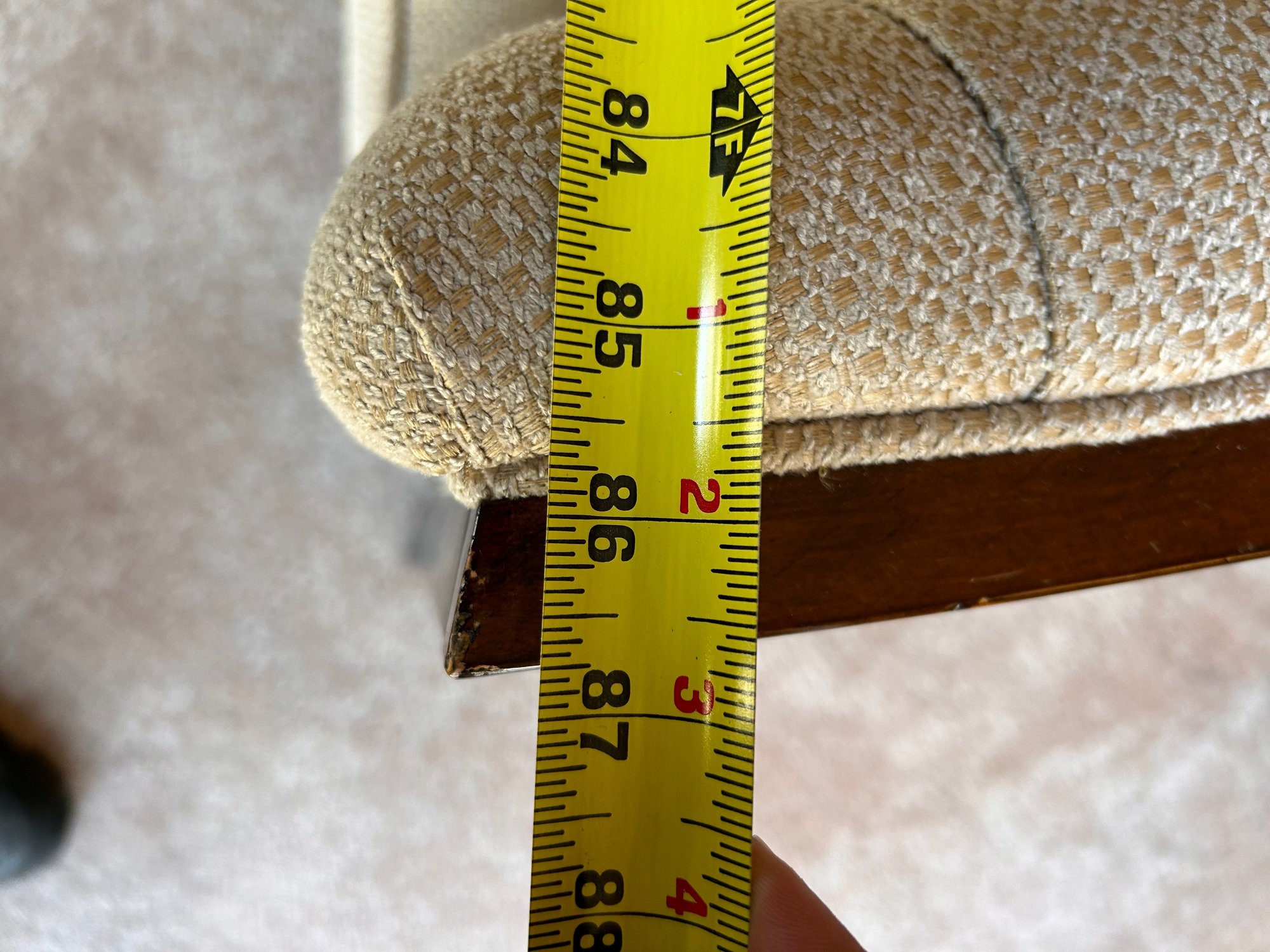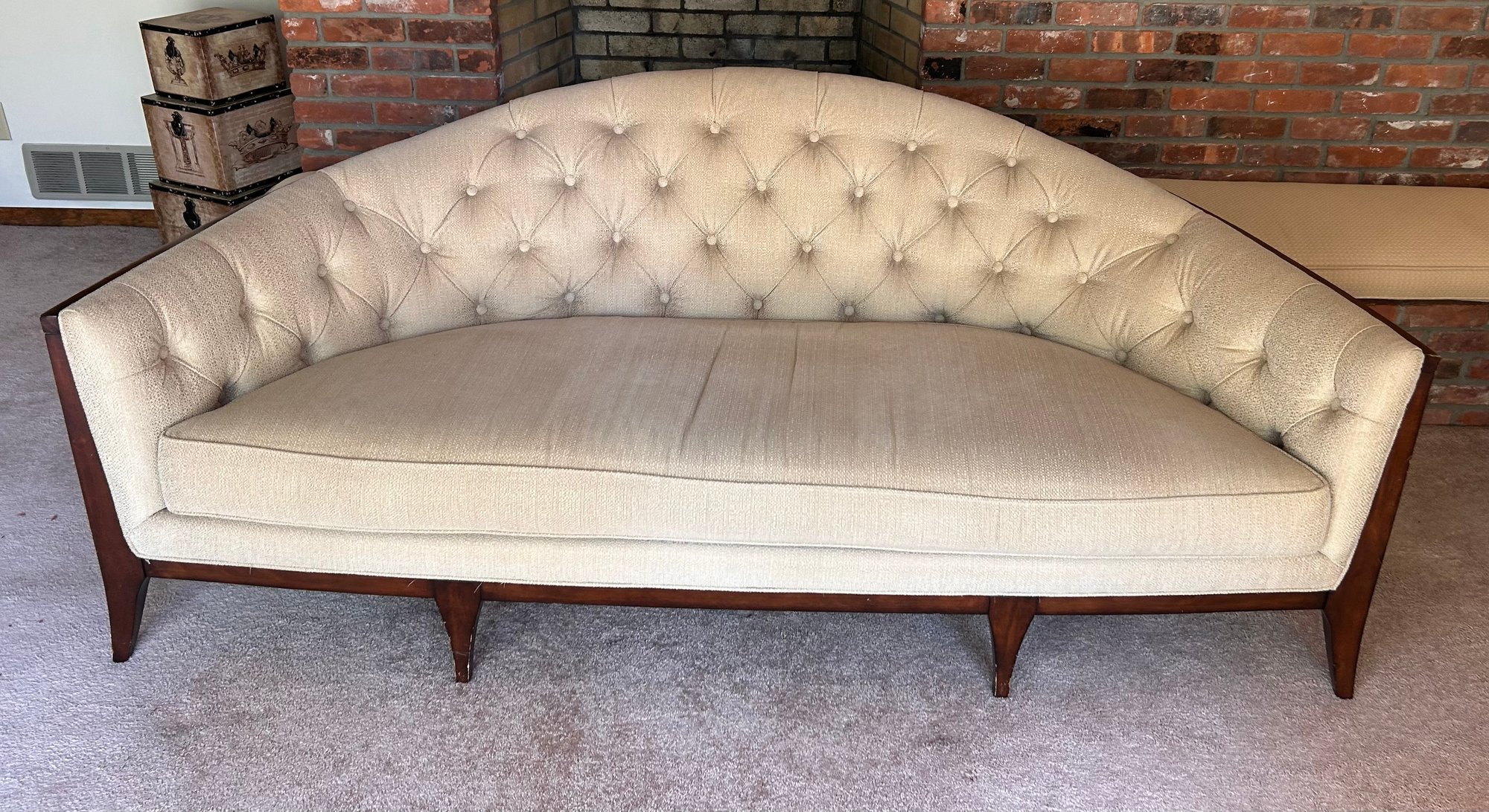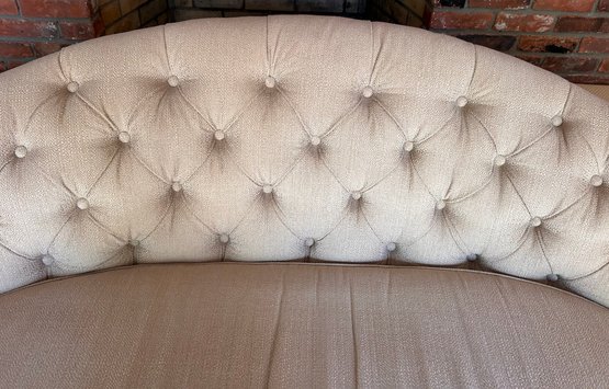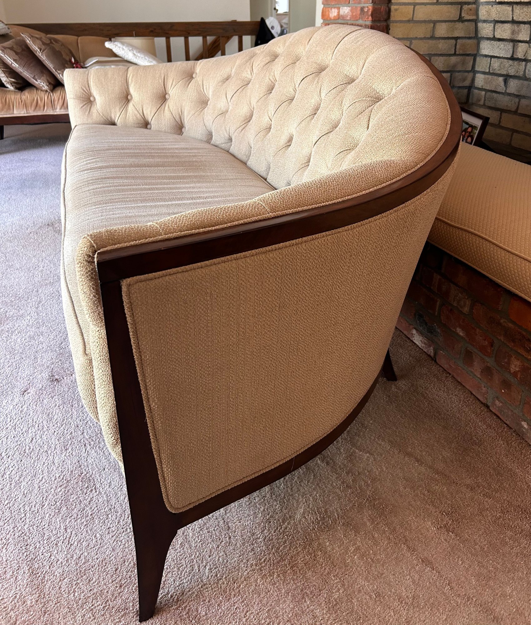 In good used condition, from a smoke and pet free home. The owners took good care of this piece. It measures approximately 87” long, 39” deep (in the middle,) with a seat height of 19.5” and total height of 35.5”.