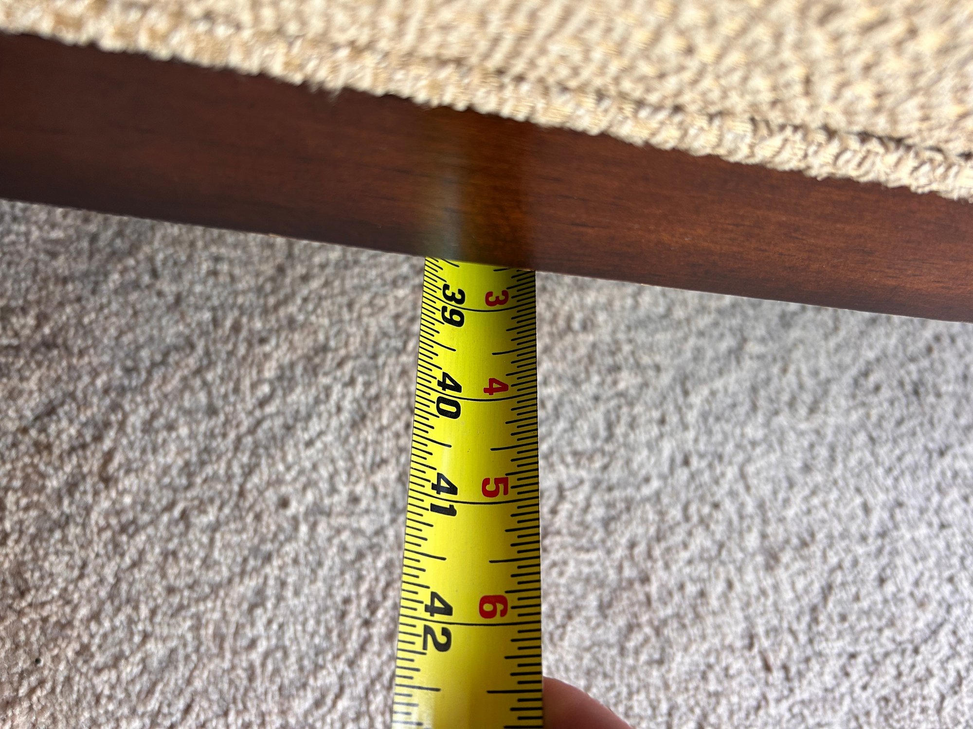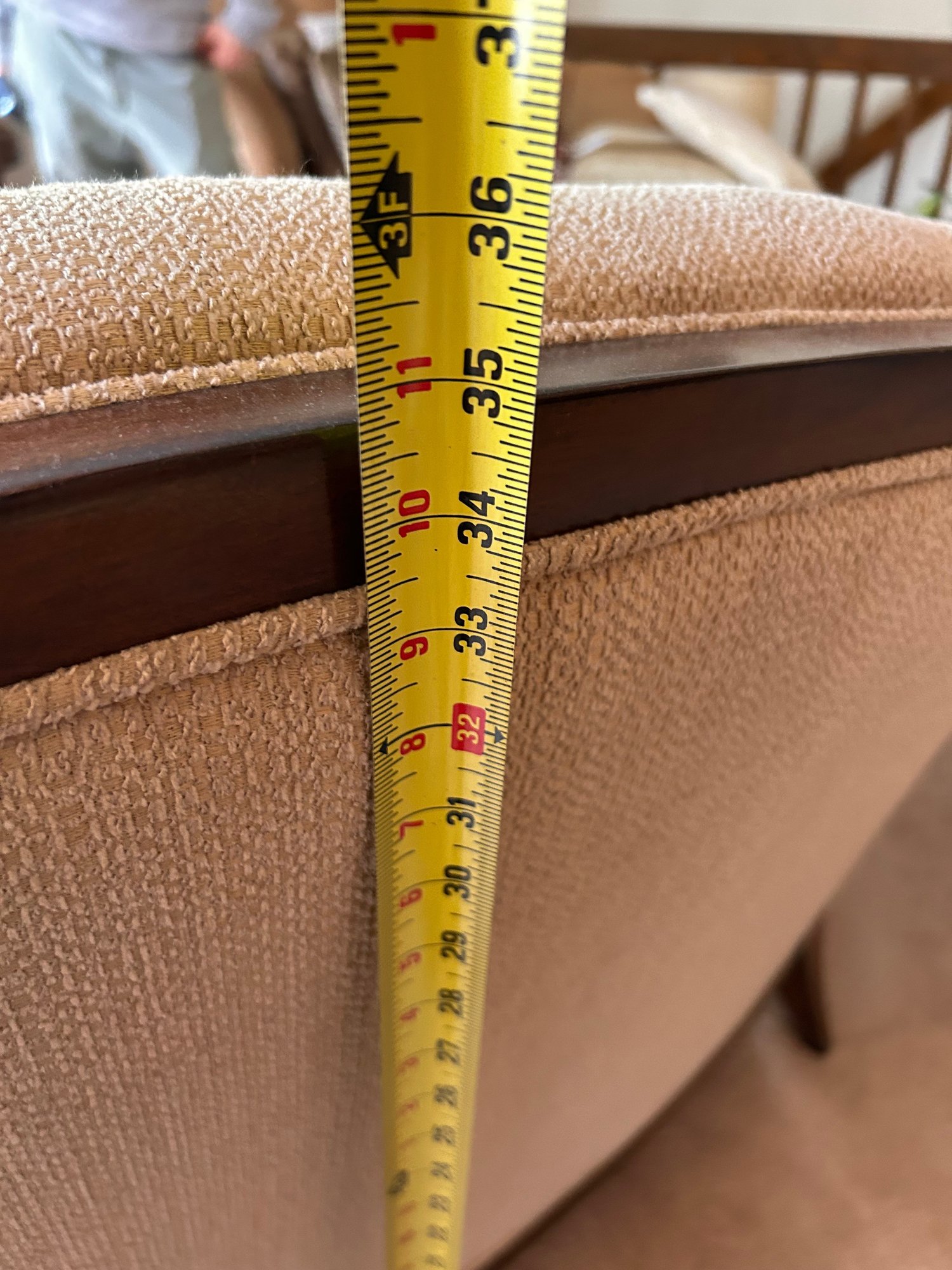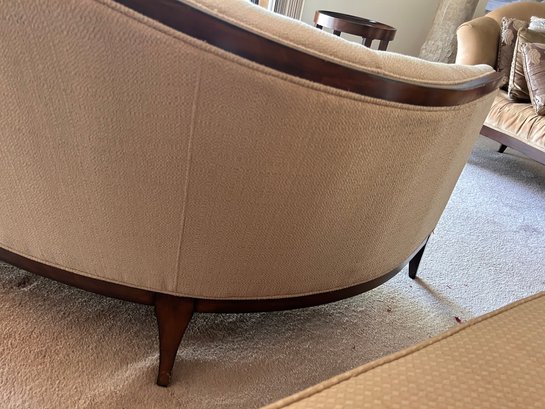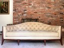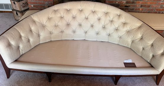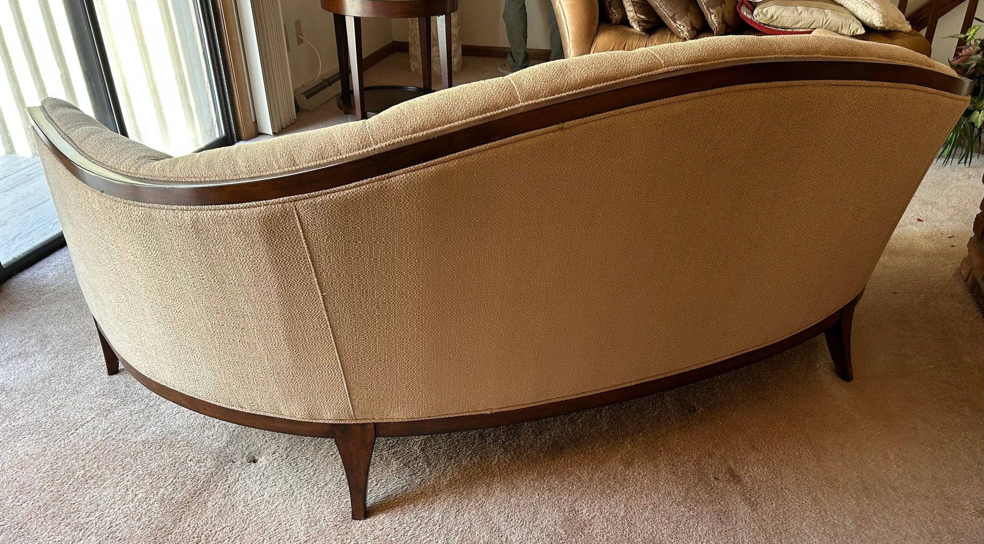 In good used condition, from a smoke and pet free home. The owners took good care of this piece. It measures approximately 87” long, 39” deep (in the middle,) with a seat height of 19.5” and total height of 35.5”.
