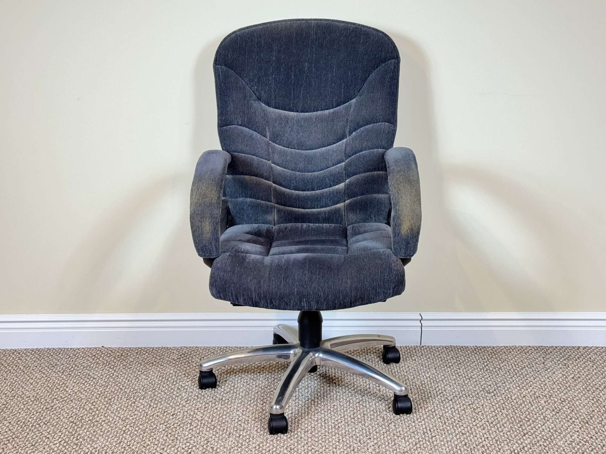 Note: Light wear consistent with normal use. Fabric shows minor surface wear particularly on the arms.