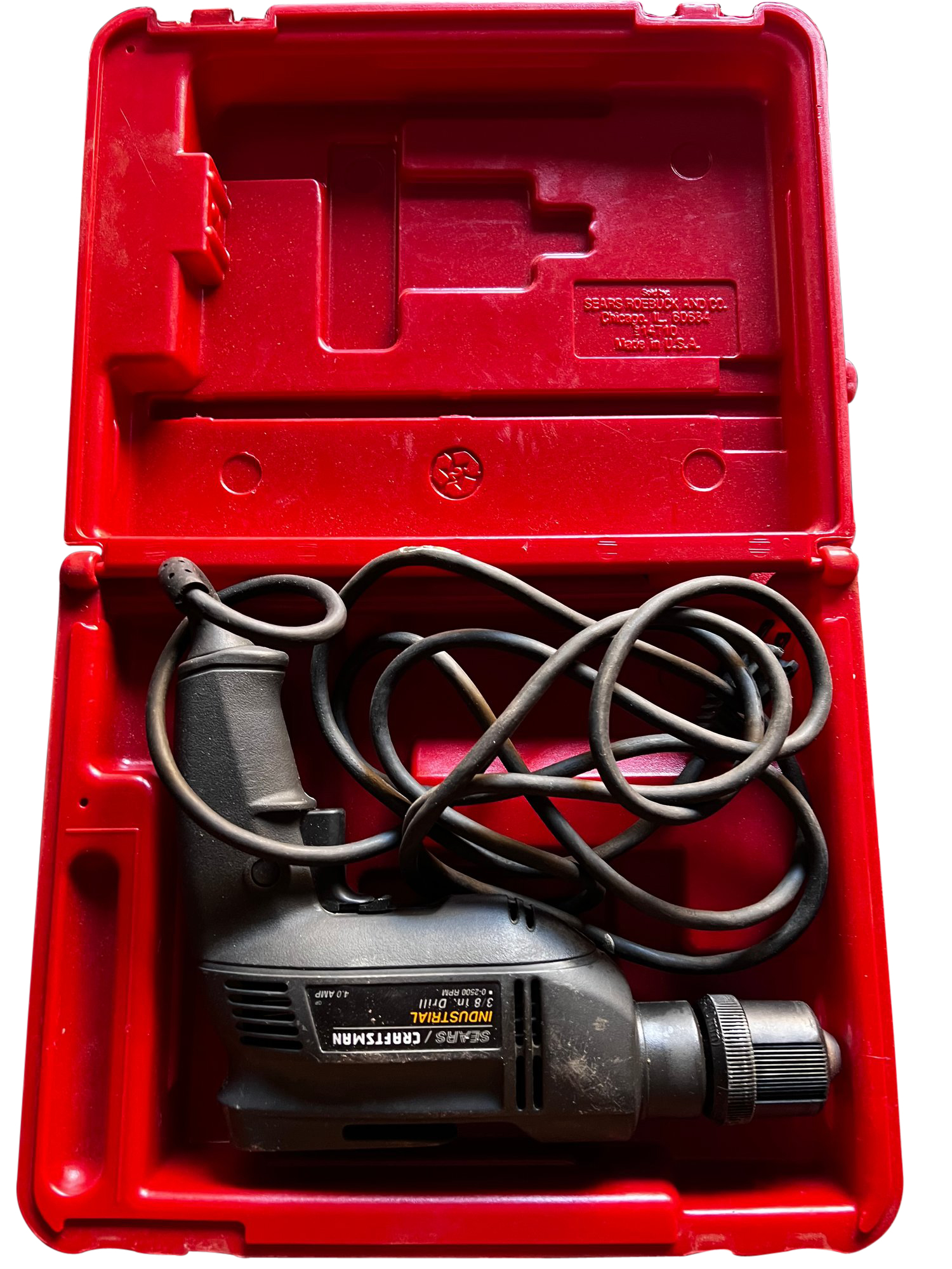 Industrial electric drill with case, in good pre-owned condition.