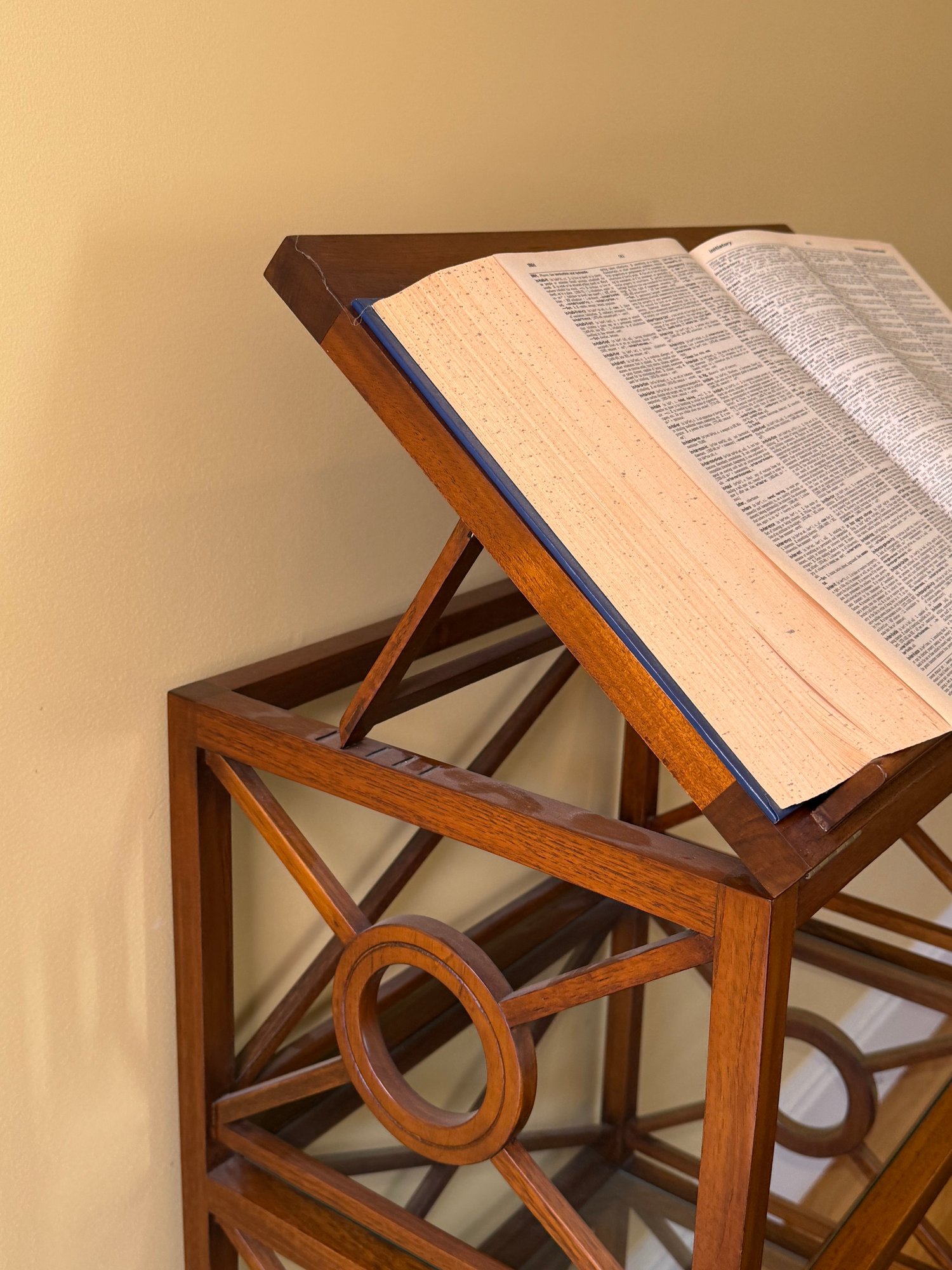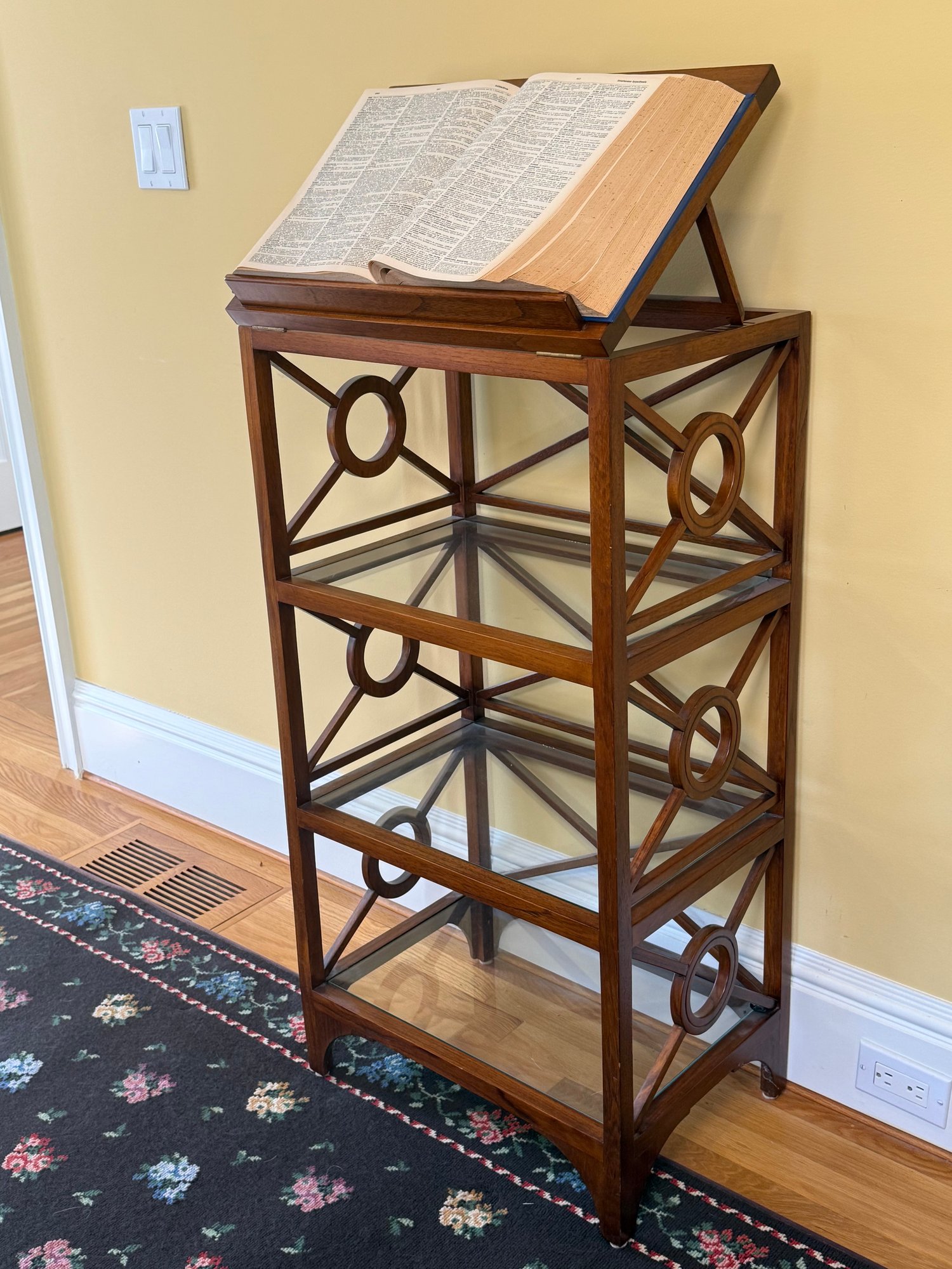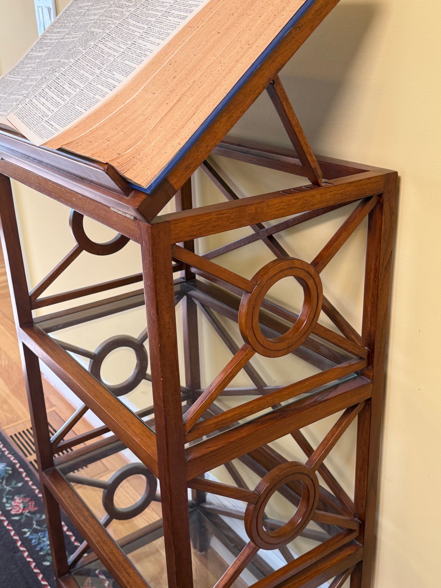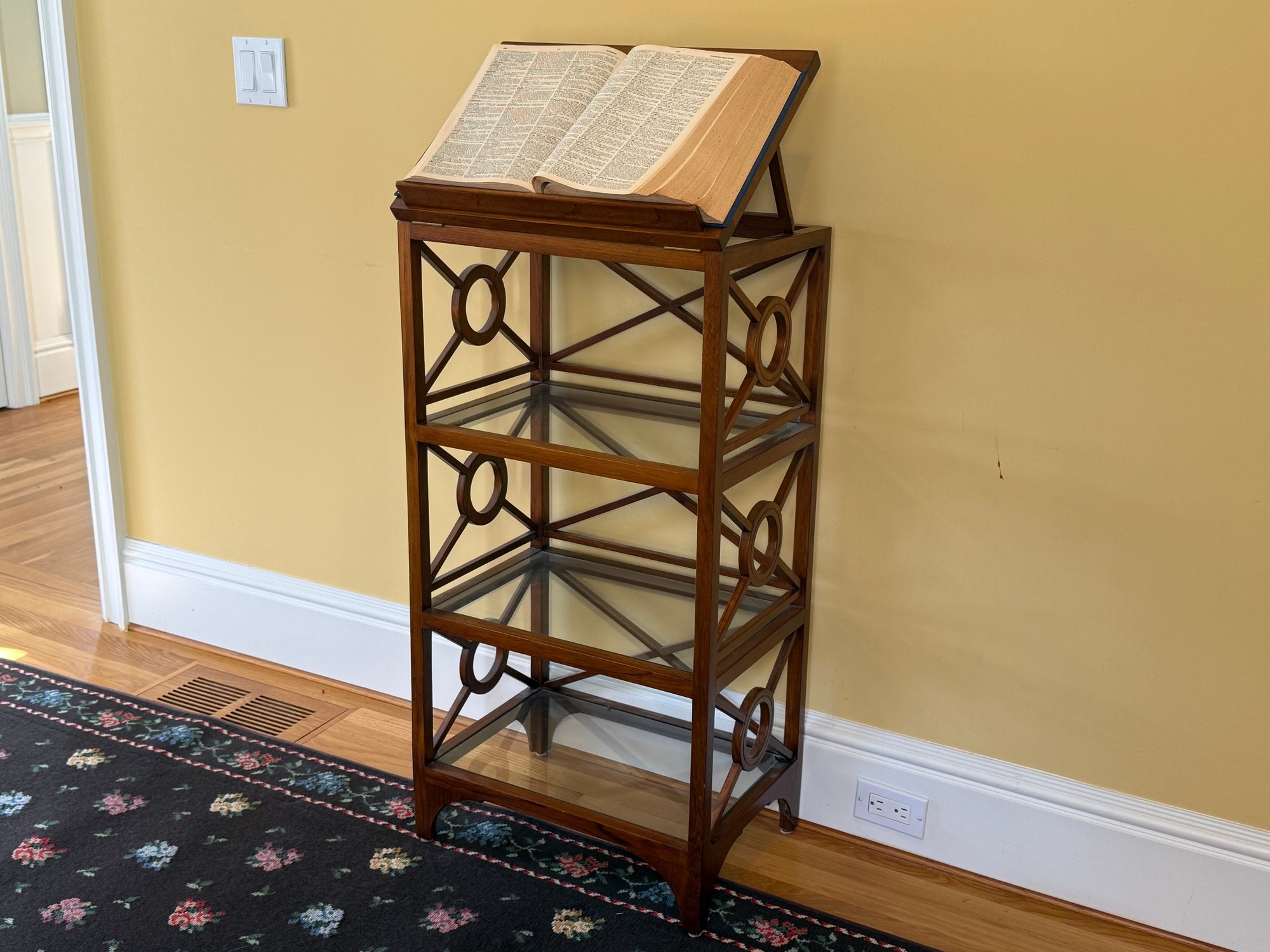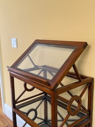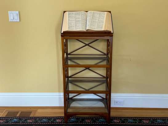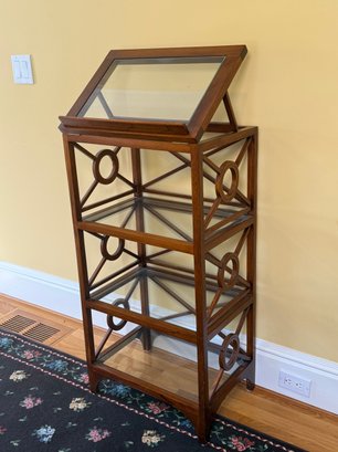 It is a Regency-style bookshelf featuring a rich mahogany wood frame, inset glass shelves, and a hinged, easel-style top that tilts to act as a book or document stand.