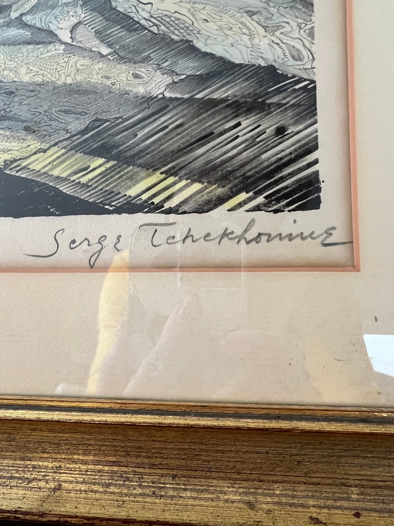 a lithograph or print, signed by Sergei Tchehonine (also known as Sergey Chekhonin). He was a prominent Russian graphic artist, illustrator, and ceramicist who lived from 1878 to 1936.