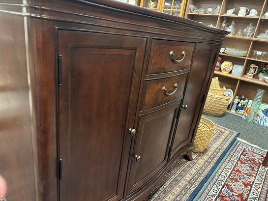 3 drawers, 2 end cabinets and center wine holder cabinet with faux marble on top 56 x 19 x 44. Felt silver drawer. adjustable shelves